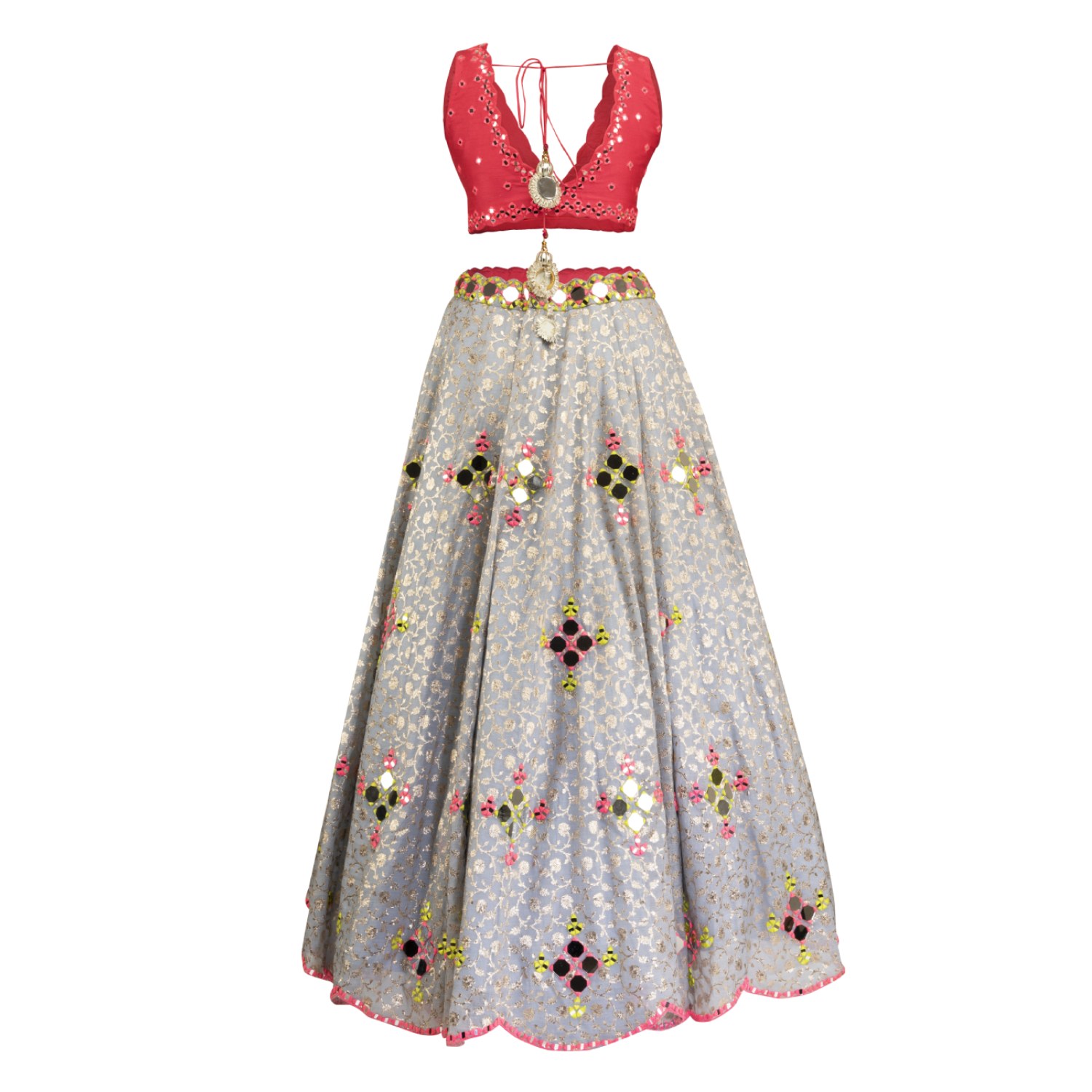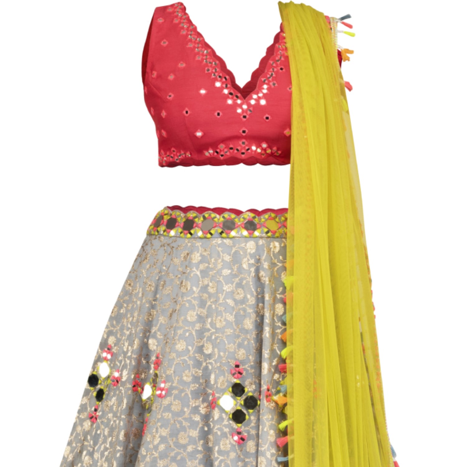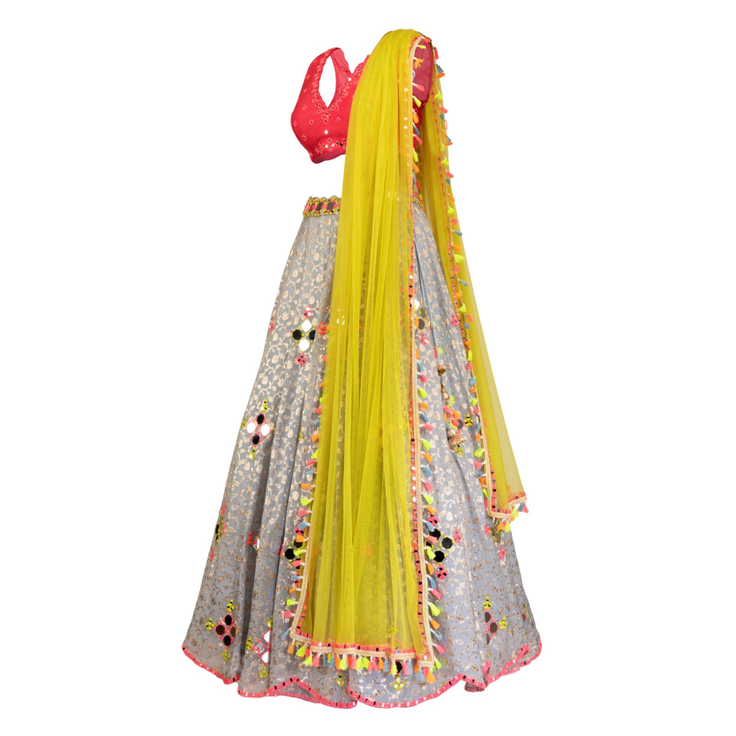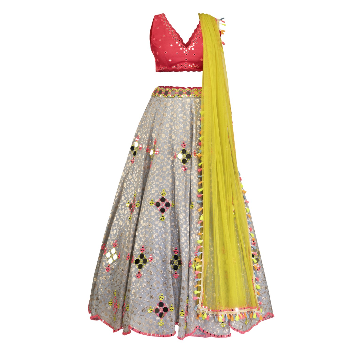 ₹ 42,560 (10% off)This grey lehenga exudes boho chic vibes with its every bit. It features a raw silk neon pink choli with mirror work, and a chanderi silk lehenga adorned with neon mirror work and embroidery details. The set is finished with a pistachio green net dupatta.