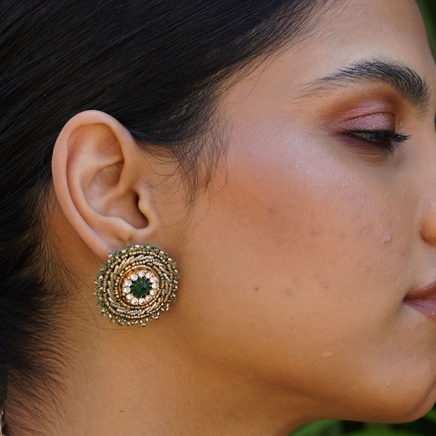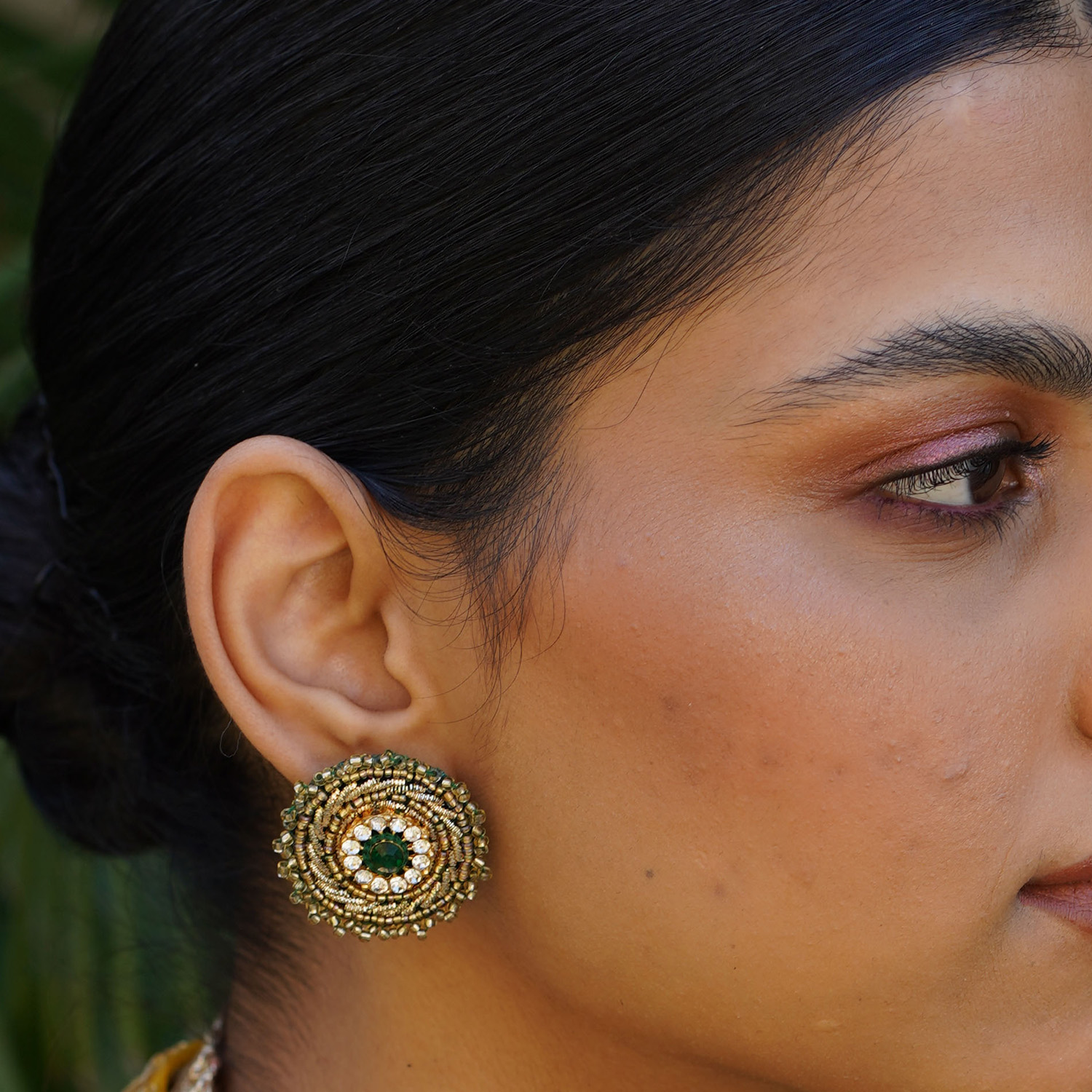 These studs feature an emerald green velvet base, emerald kundan stones in the centre, and intricate zardoz work. Style them with an anarkali suit or lehenga for weddings or festivities.