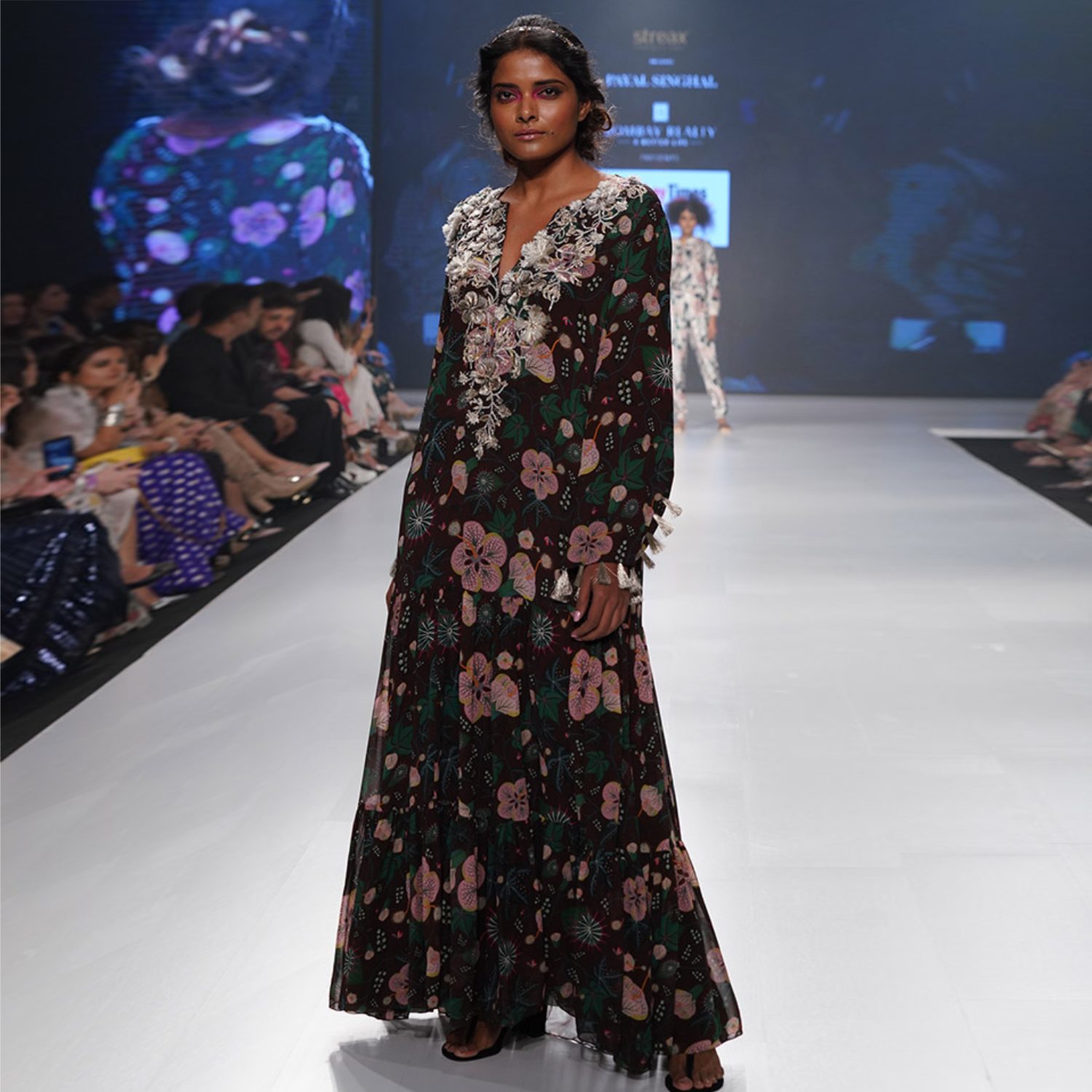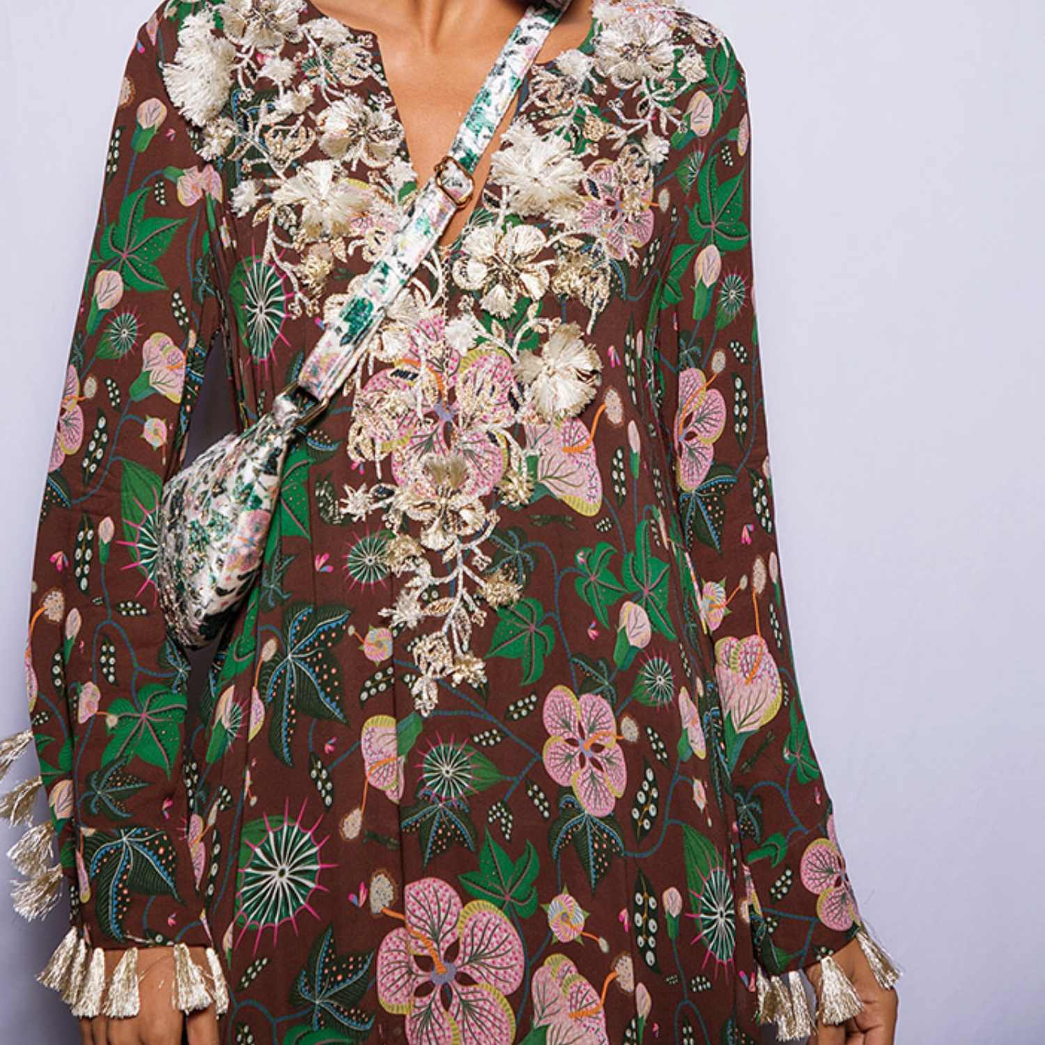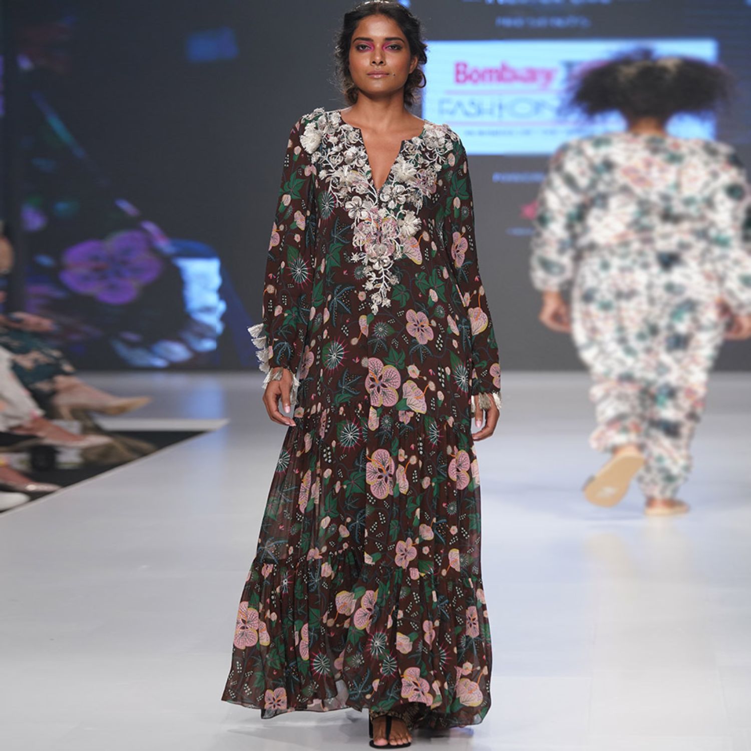 Crafted from high-quality georgette fabric, this long dress comes in a rich brown shade. It features an embroidered yoke and a tiered design, offering a flattering and relaxed silhouette. Style it with statement earrings and a sling bag for a dressy evening event.