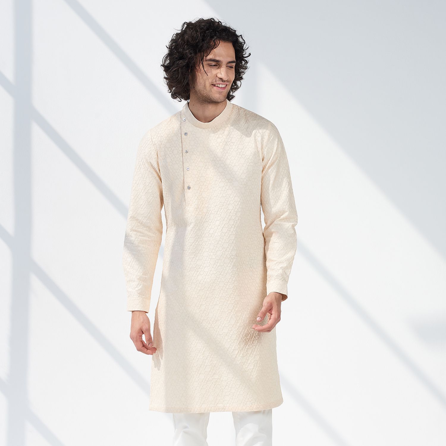 Crafted in a luxurious cotton satin, this kurta offers a graceful and sophisticated look. The intricate embroidery details add a touch of traditional charm to the piece. The ivory color exudes a sense of timelessness. The angrakha styles lends this piece a flattering silhouette.