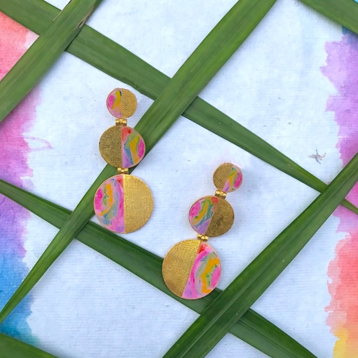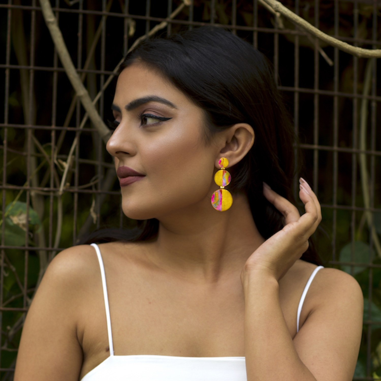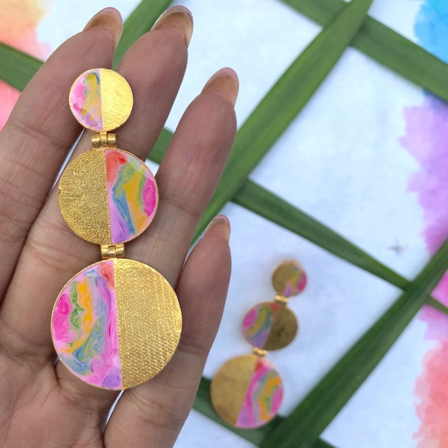 Introducing our apollo earrings crafted from brass material with golden color. The brilliance of the night sky, is captured in a pair of earrings to outshine your looks. Each piece is designed in-house and handcrafted by our skilled artisans. Style it with a white dress and a sling bag.