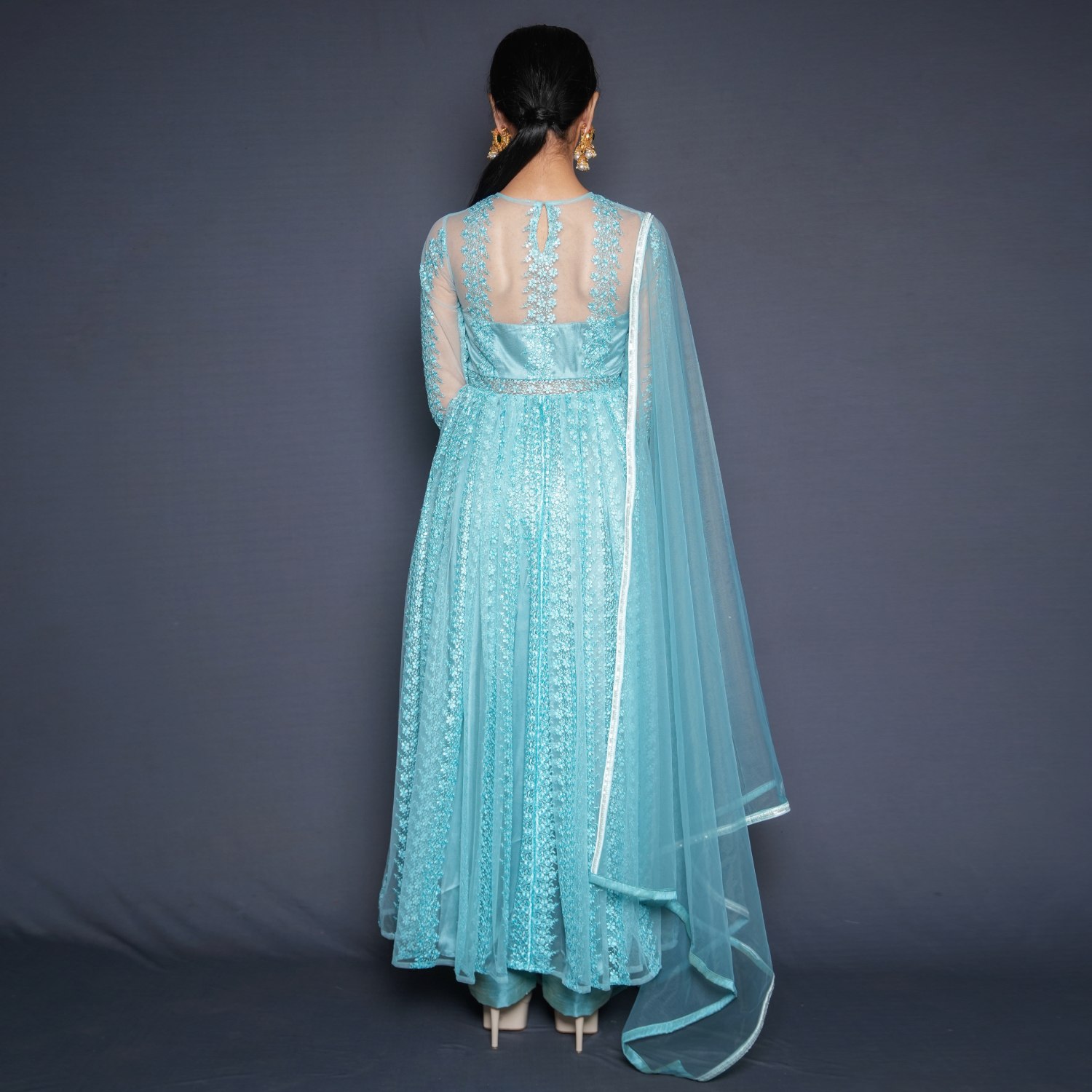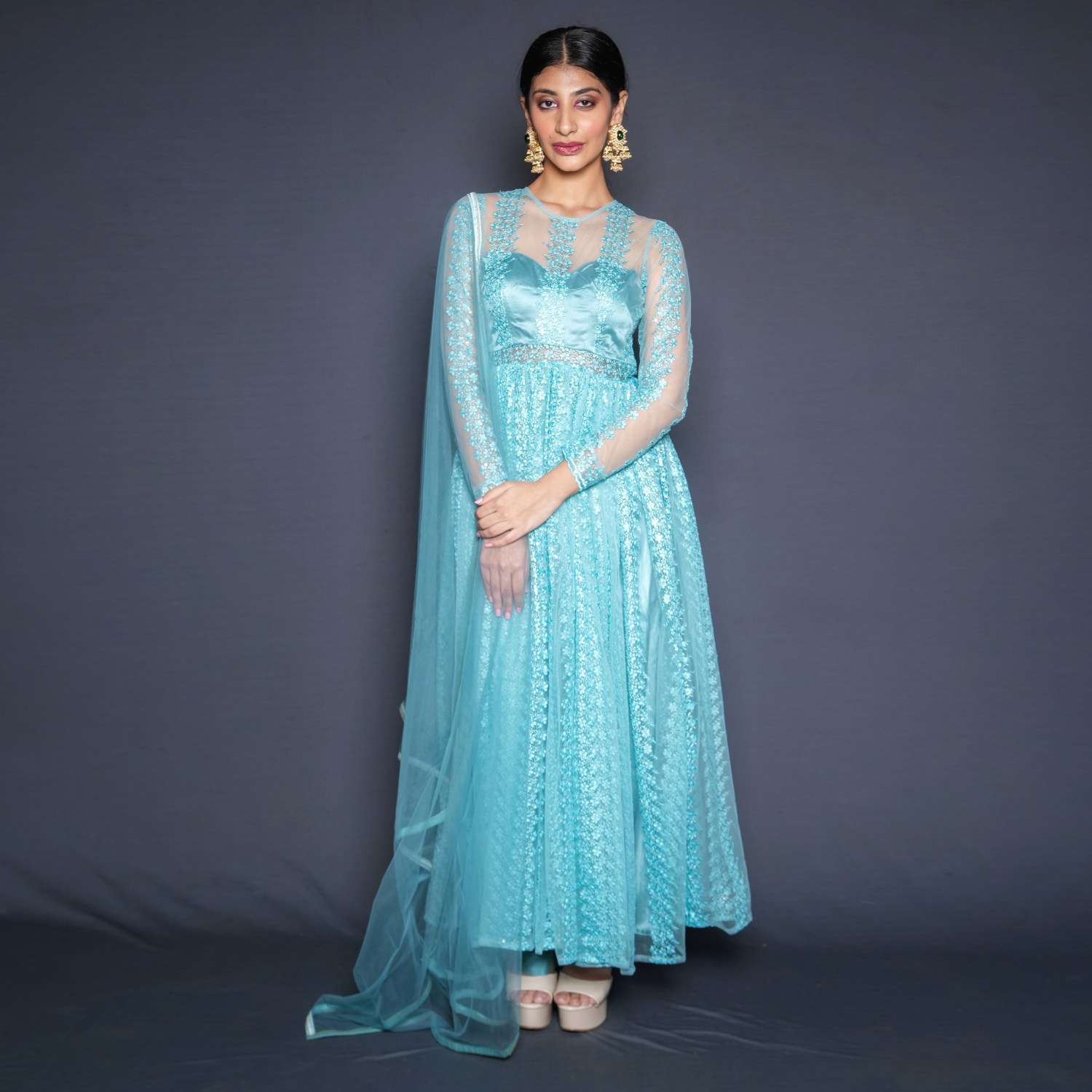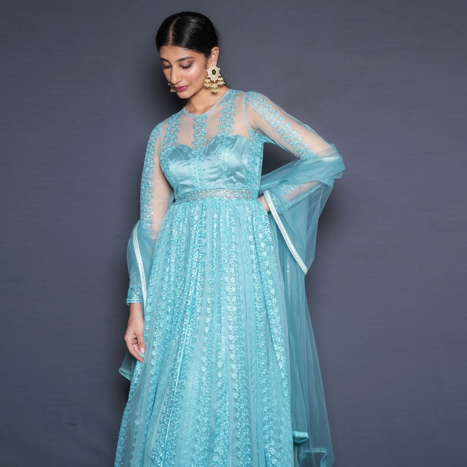 This exquisite set includes a net anarkali, raw silk pants, and a dupatta with a border. The anarkali is crafted from sequin-embellished threadwork net fabric in an aqua-blue shade. It features full sleeves, giving it an elegant and traditional look. Pair it with delicate earrings and a sling bag for weddings or festivities.