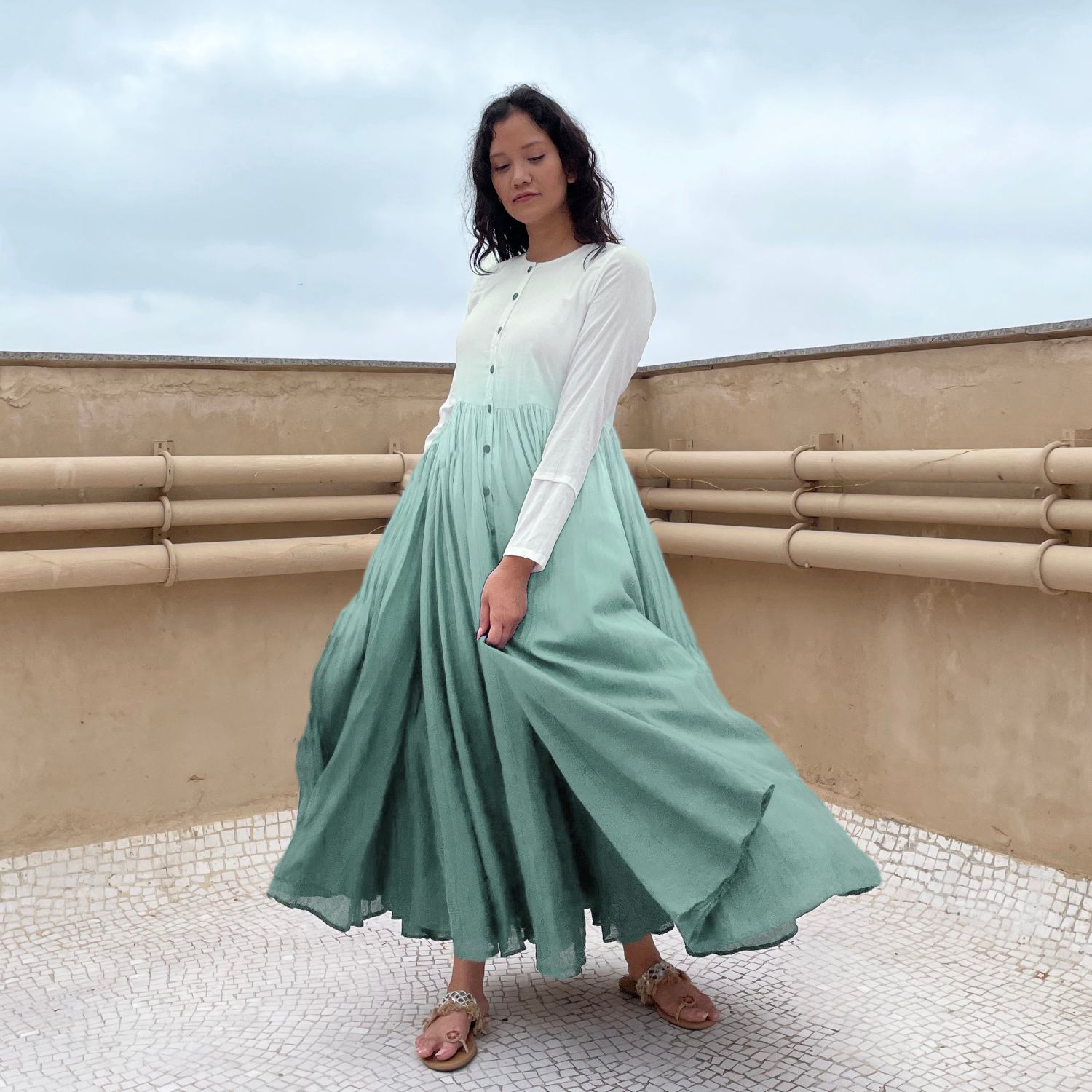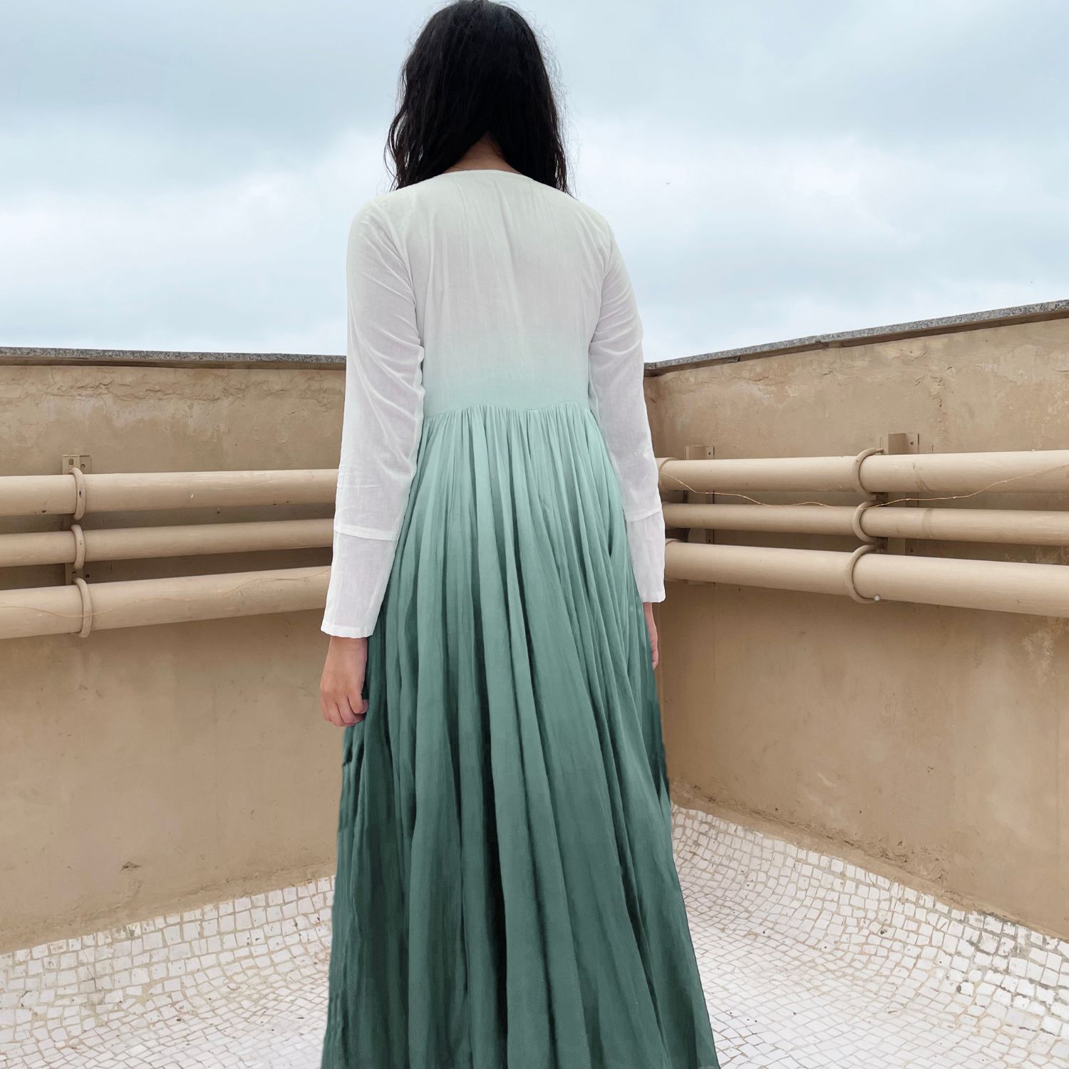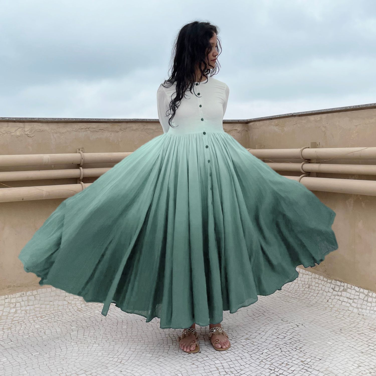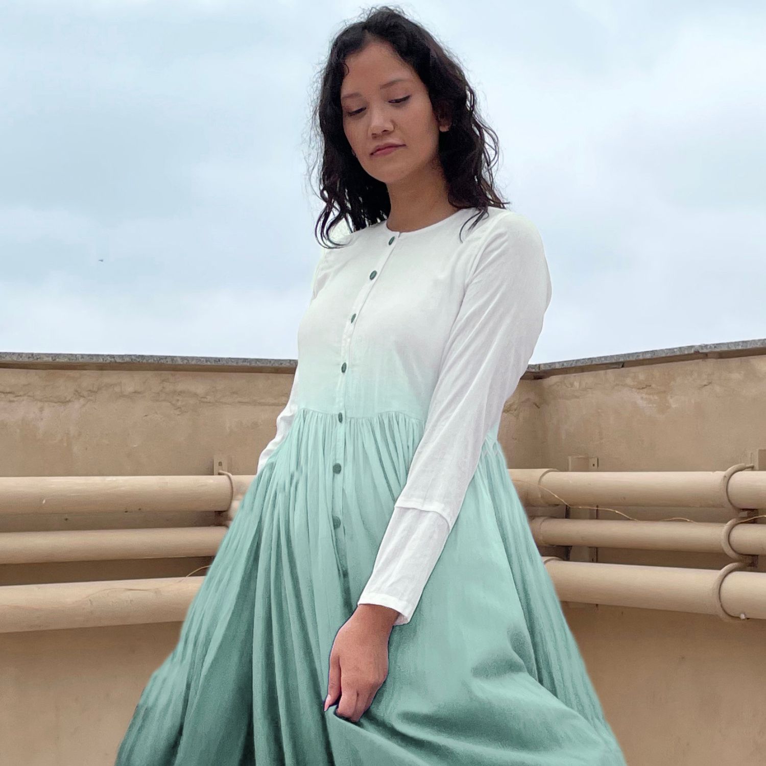 Indulge in exquisite luxury with our aqua green ombre dyed button down voluminous dress. Impeccably crafted, this dress features pleated sleeves and a captivating ombre dyed design. With its button-down front and voluminous silhouette, it effortlessly combines opulence and style, ensuring you make a glamorous statement.