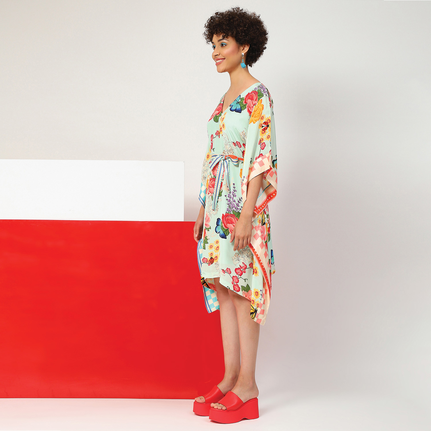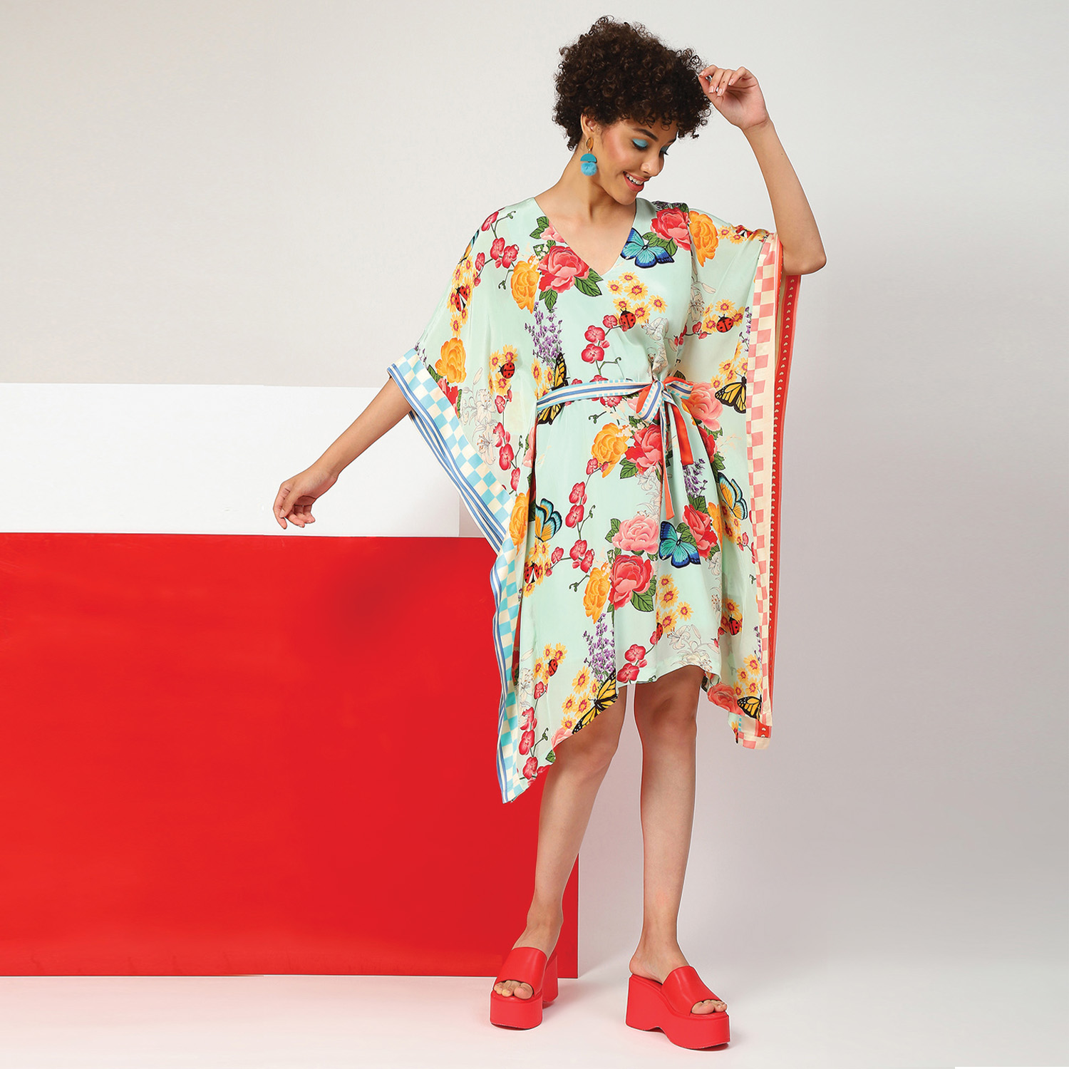₹ 9,050 (10% off)This beautiful kaftan features a V-neckline and dramatic batwing sleeves, creating a flowing and graceful silhouette. The kaftan has a fabric belt that allows you to cinch the waist according to your preference. It features an aqua base with a multicolor floral print, adding vibrancy to the look. Style it with statement earrings and a sling bag for a dressy event.