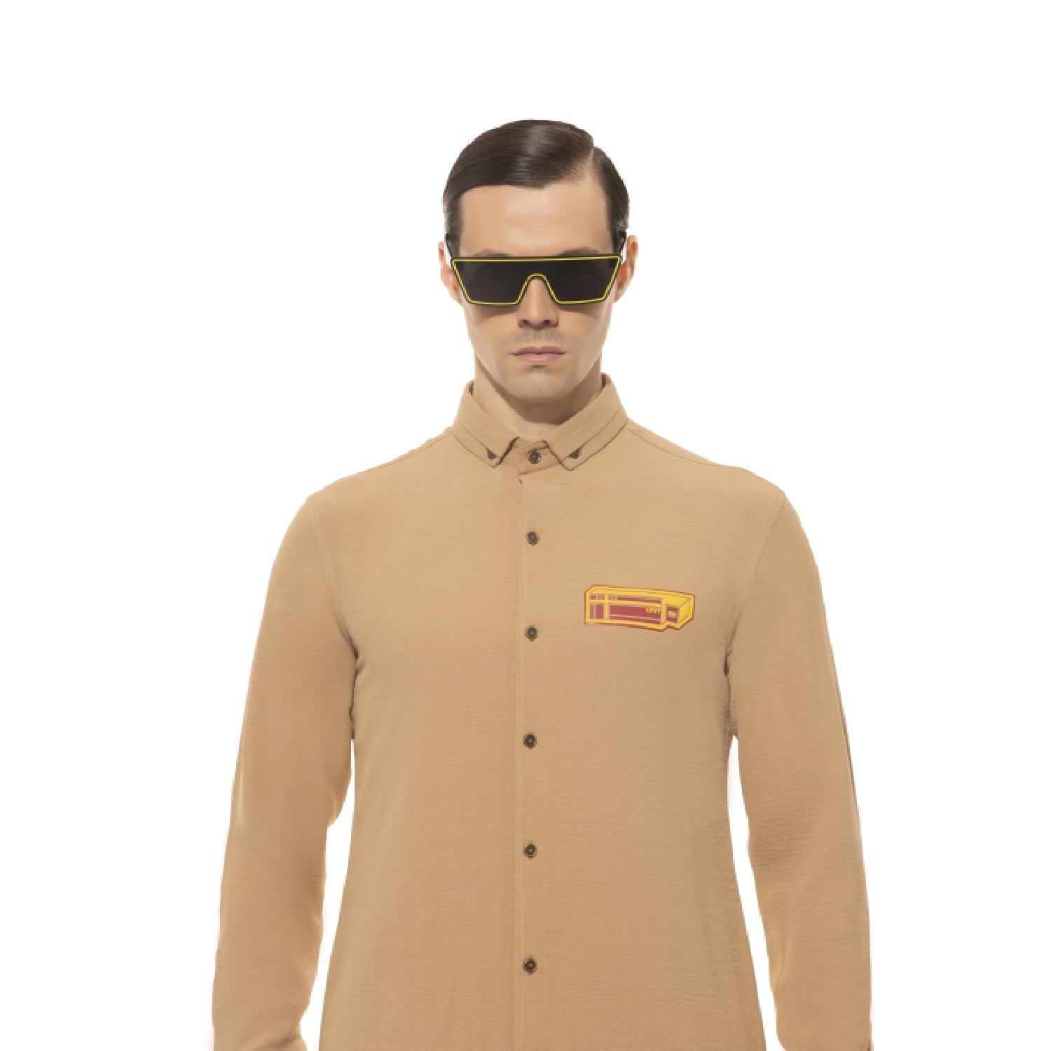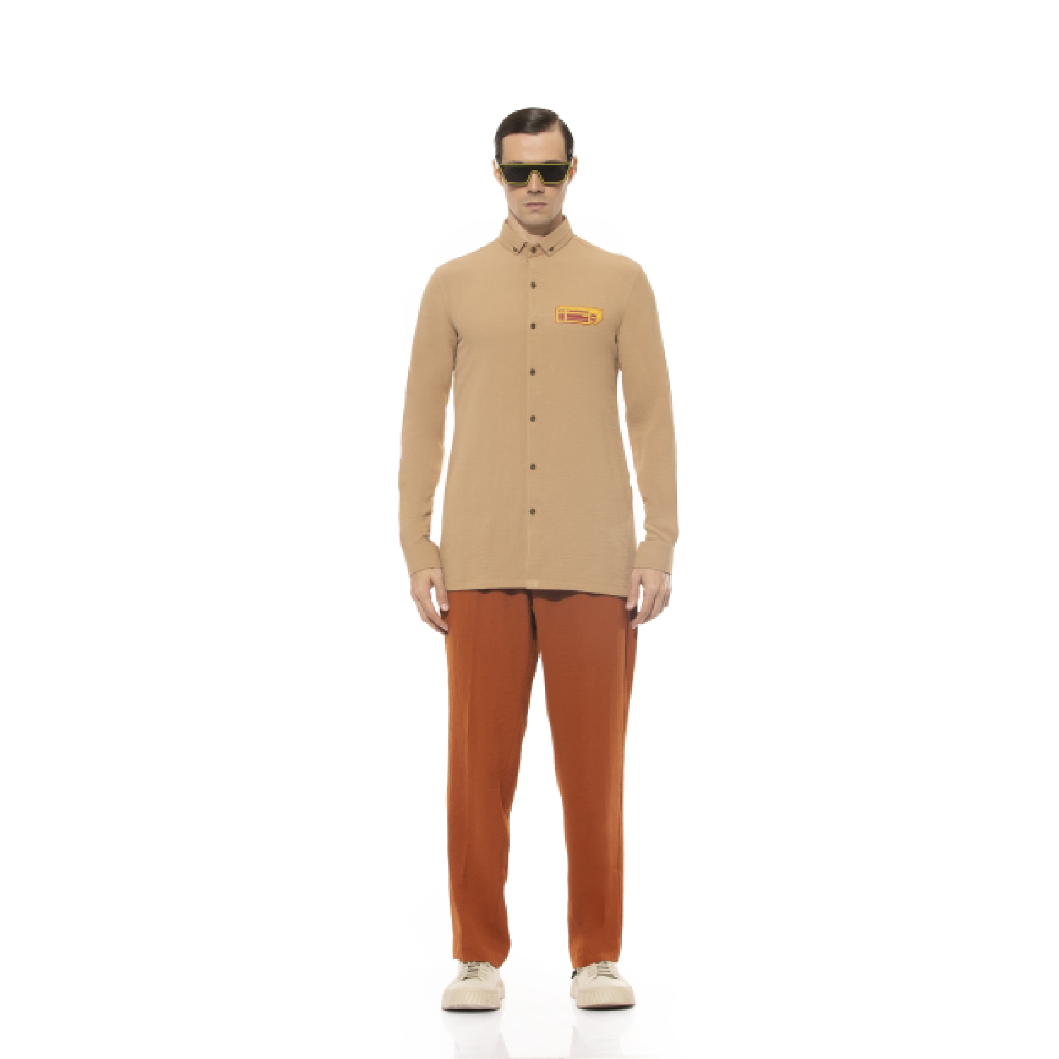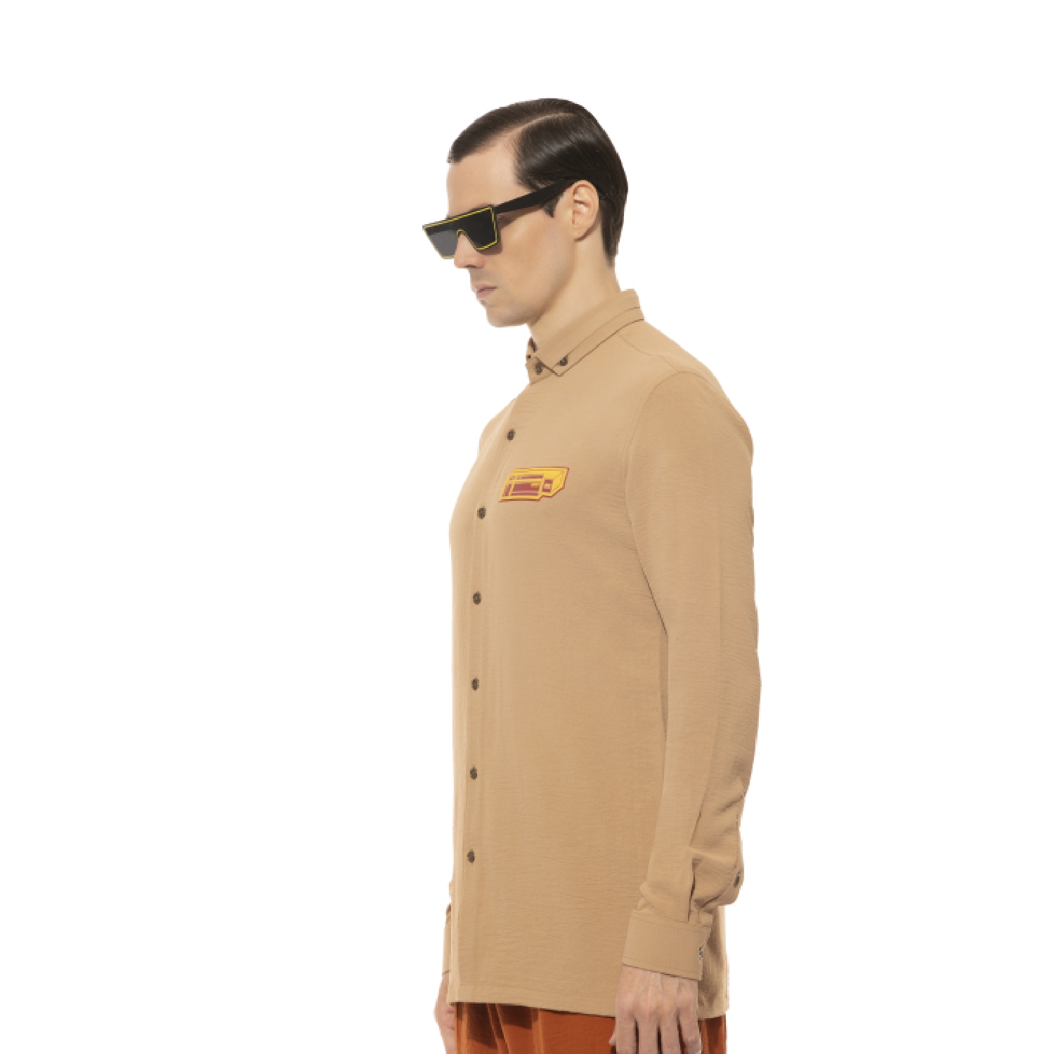 Crafted from premium crepe fabric, this shirt offers both comfort and style. The slim fit is designed to provide a modern and tailored look. It features an orange and yellow placket that adds a pop of color to the classic beige base.