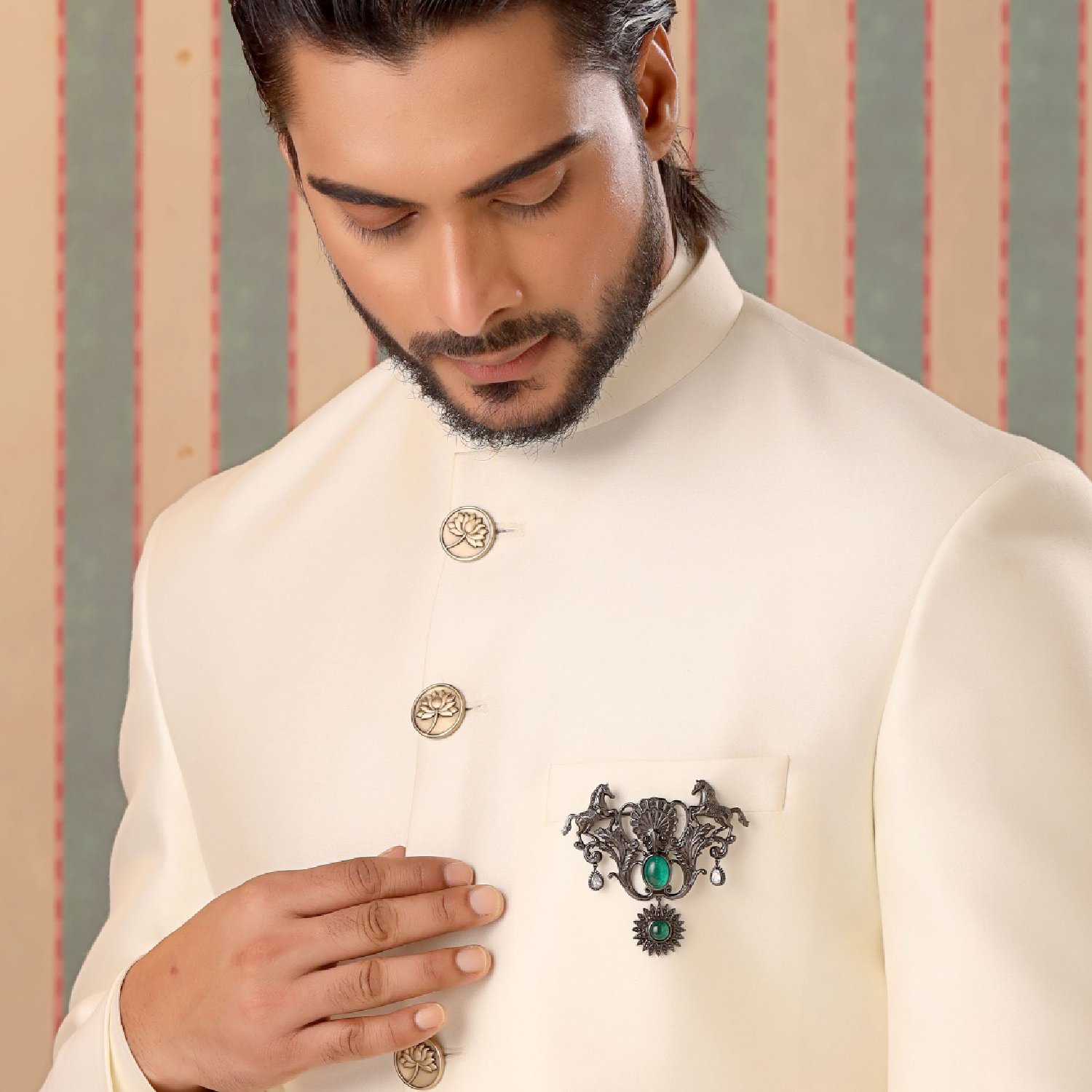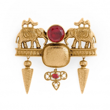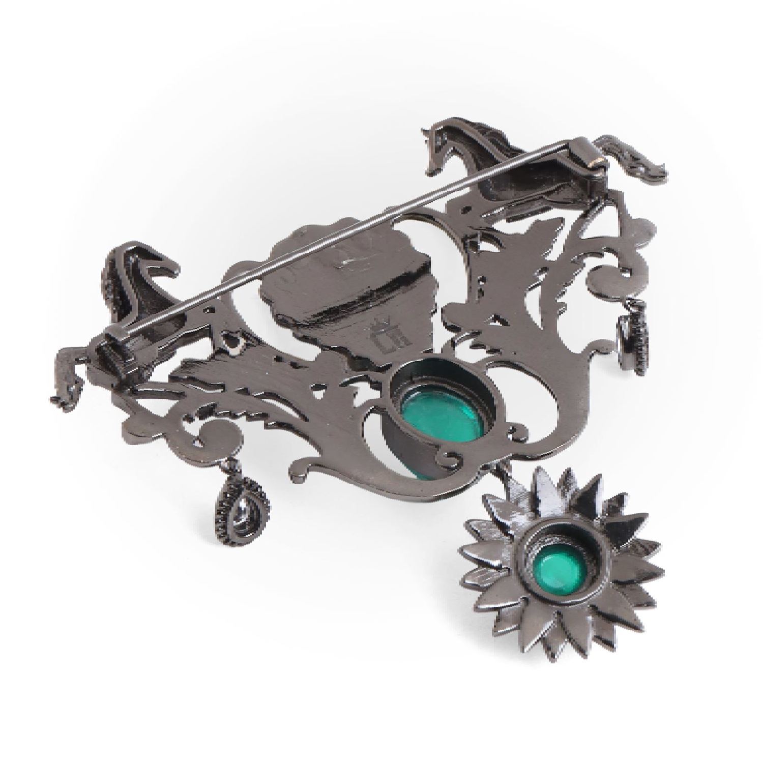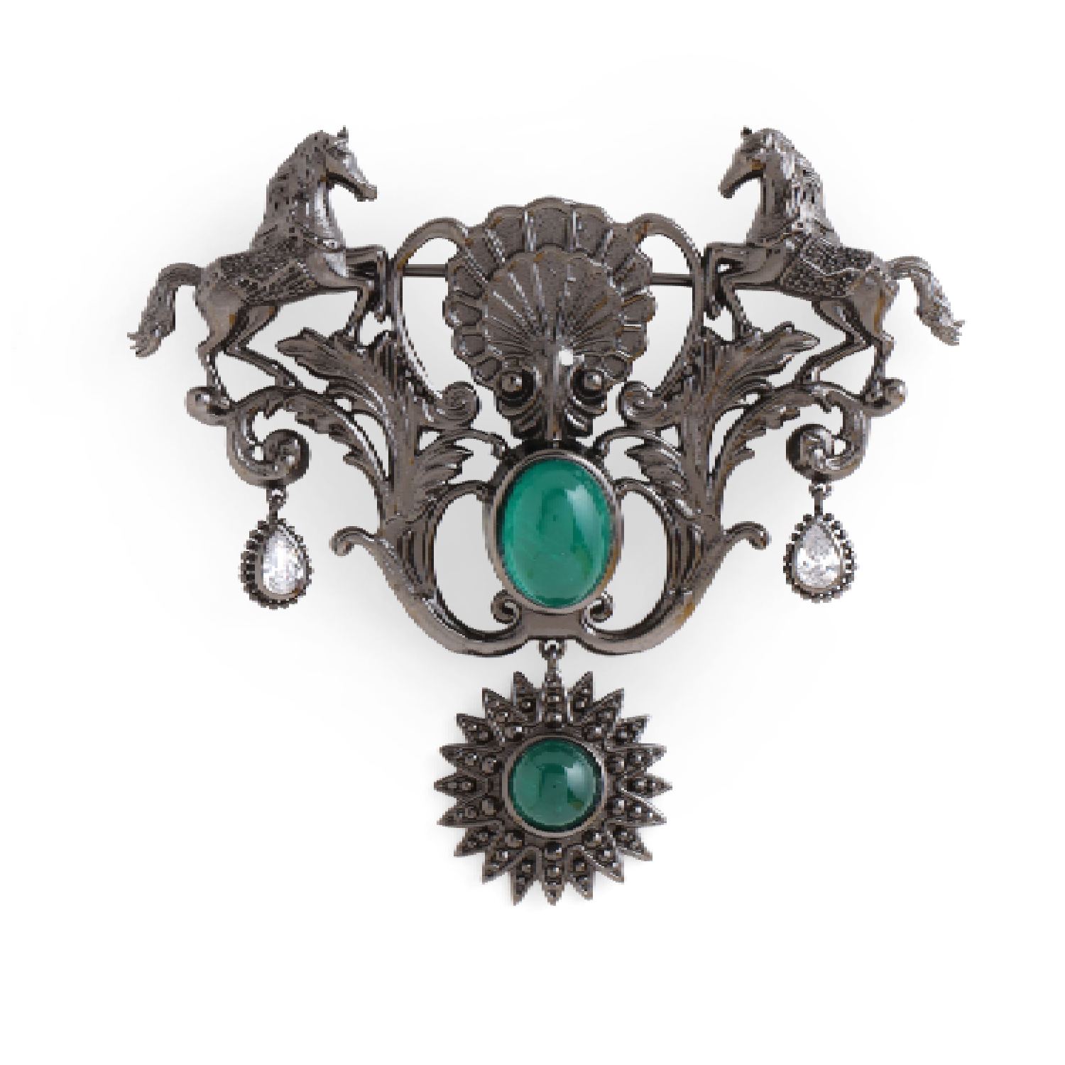 ₹ 4,400 (5% off)This gorgeous brooch features two dynamic stallions and a striking green gemstone, set against a gold backdrop. The design showcases intricate and dynamic detailing, making it a unique and eye-catching addition to your outfit. Pair it with a black blazer and formal shoes for a dressy evening event.
