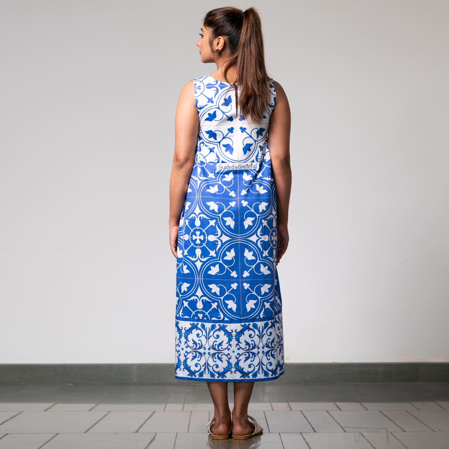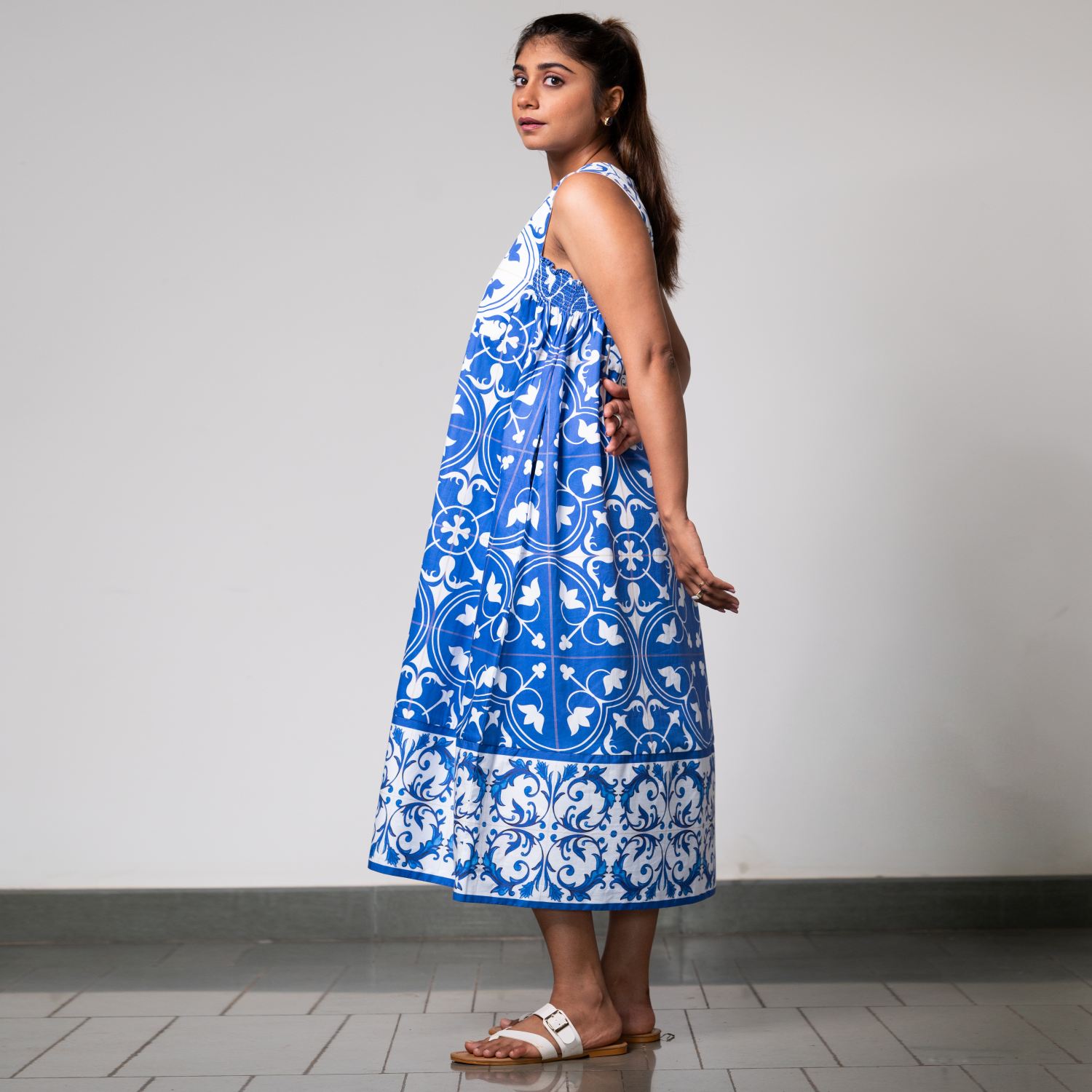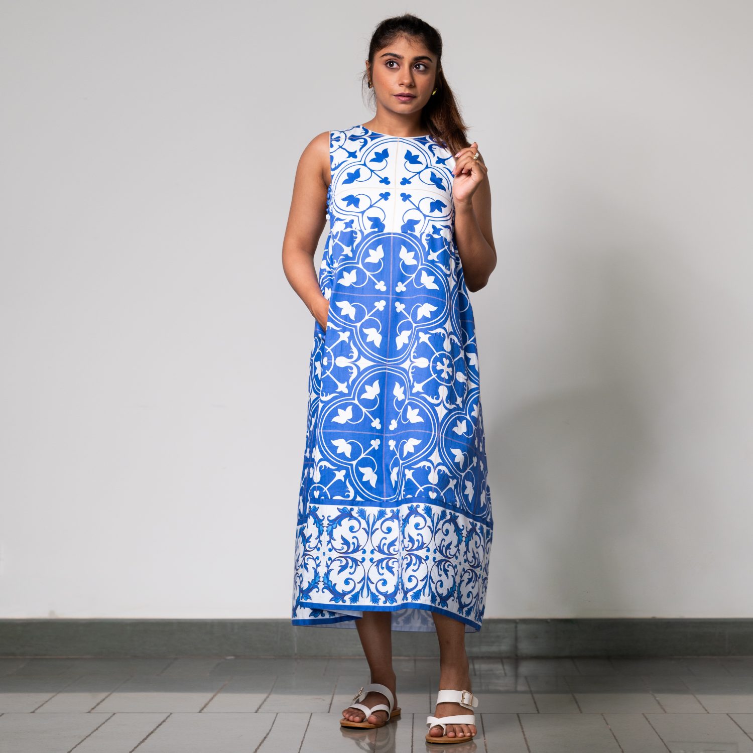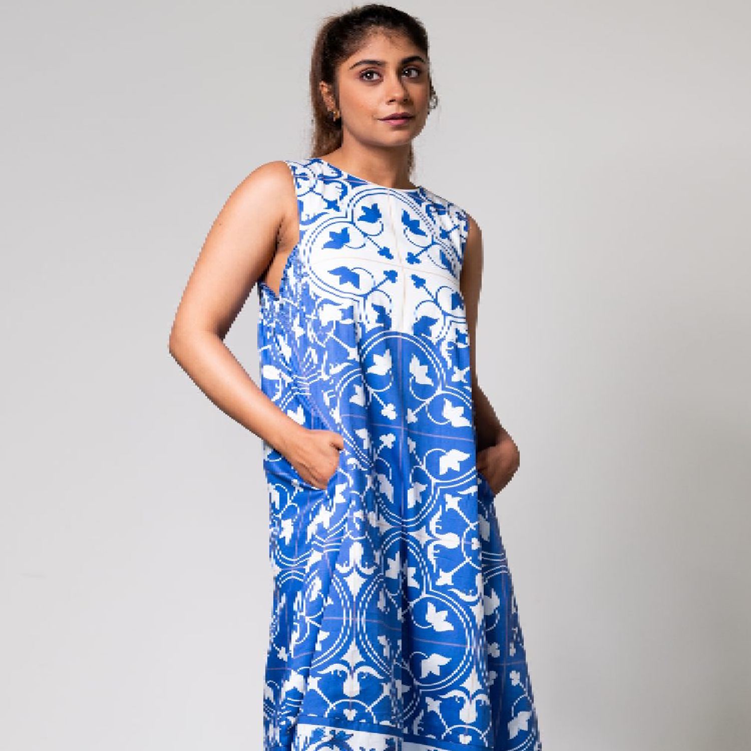 ₹ 5,985 (5% off)Crafted from luxurious cotton satin, this dress offers a soft and luxurious feel. It features a rich indigo shade, a sleeveless design, and a white digital print, adding a beautiful contrast. The dress is equipped with pockets, adding functionality and practicality to your outfit. Designed with a relaxed fit, it offers comfort and ease of movement.