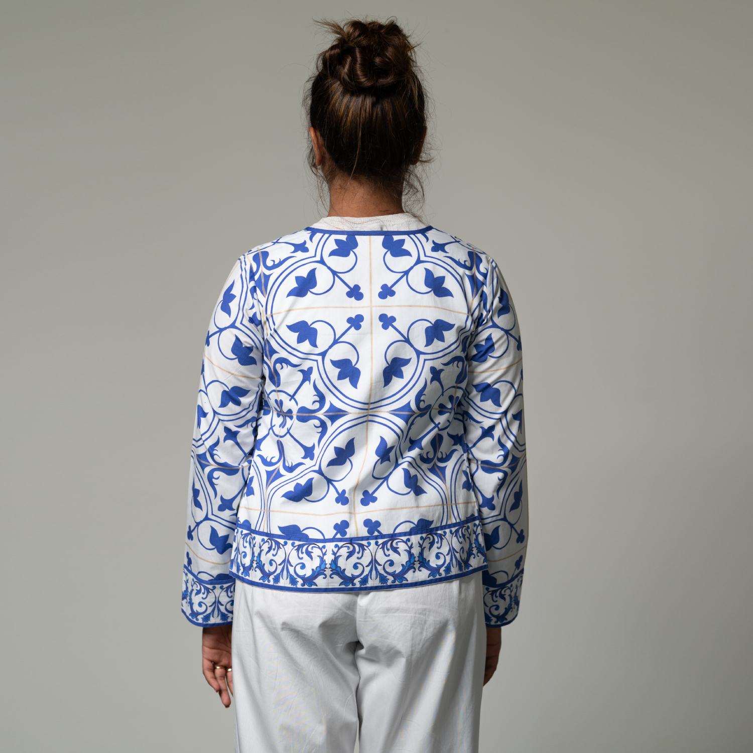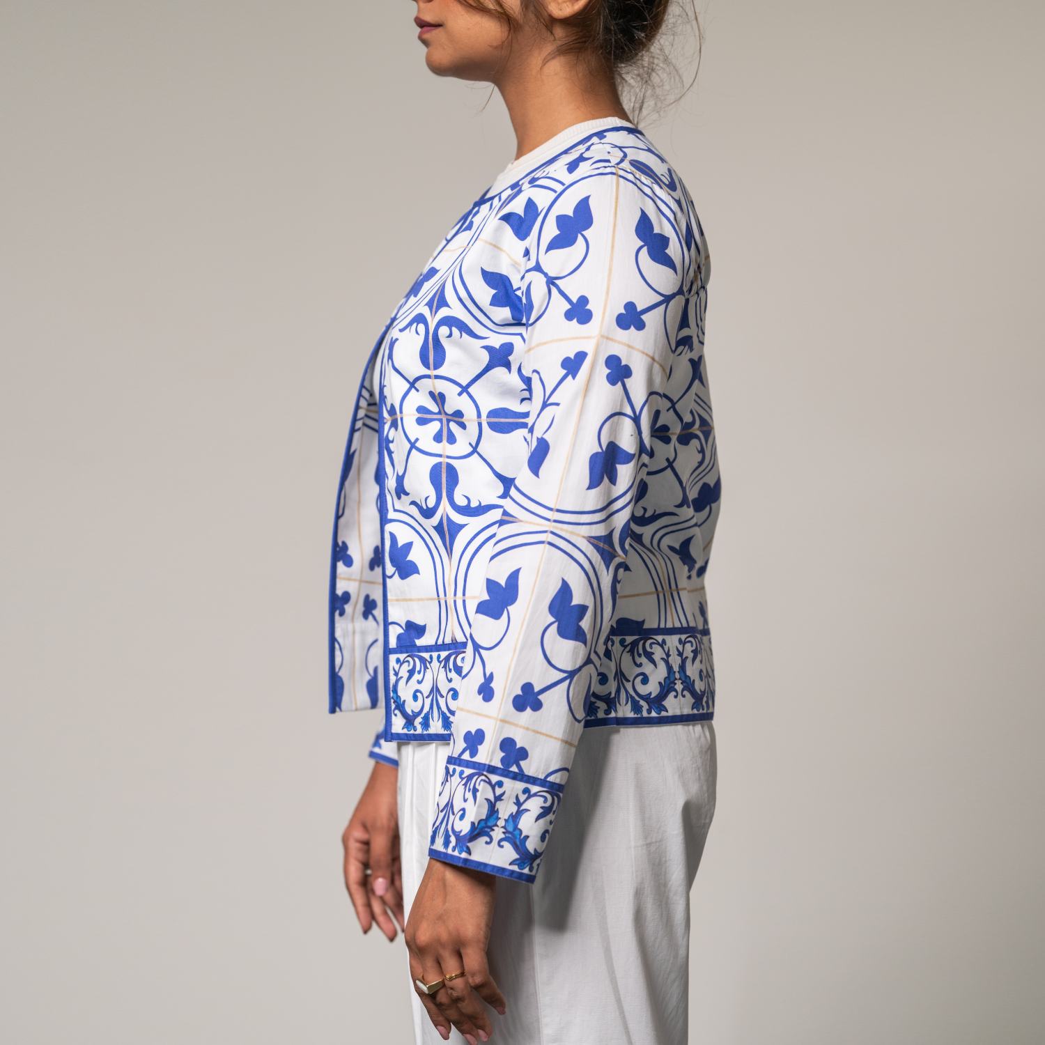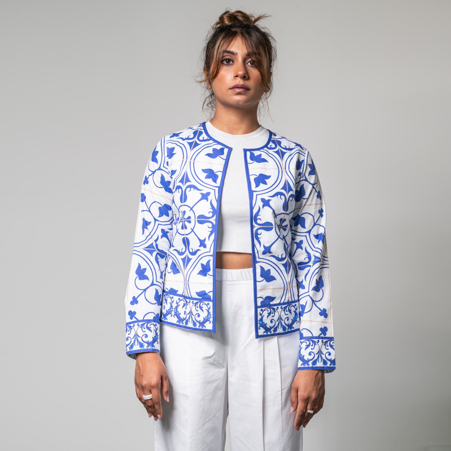 ₹ 4,725 (5% off)Crafted from high-quality poplin fabric, this exquisite jacket comes in a white shade. It features an open front, full sleeves, and delicate blue prints, offering elegance and a pop of color to the look. Pair it with a white top and minimal jewellery for a dressy day soiree.