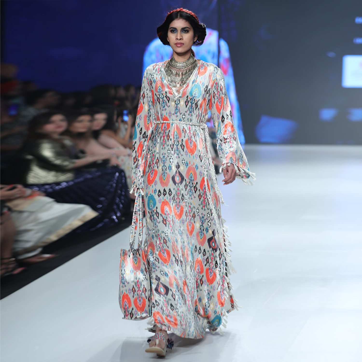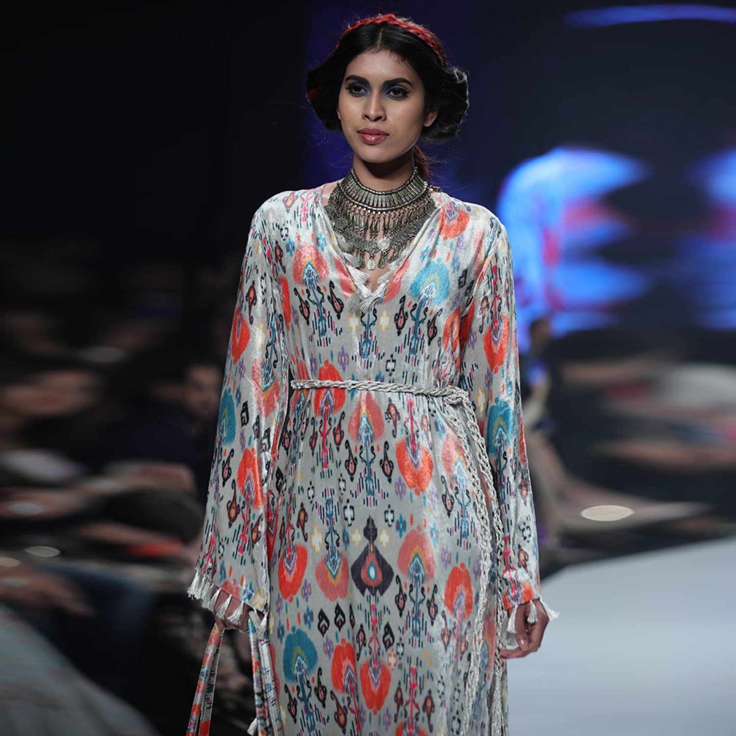 Crafted from high-quality velvet fabric, this kaftan has a multicolored floral print, full sleeves and a long length. It features a slit, adding uniqueness and style to the look. Style it with statement earrings and heels for a dressy event.