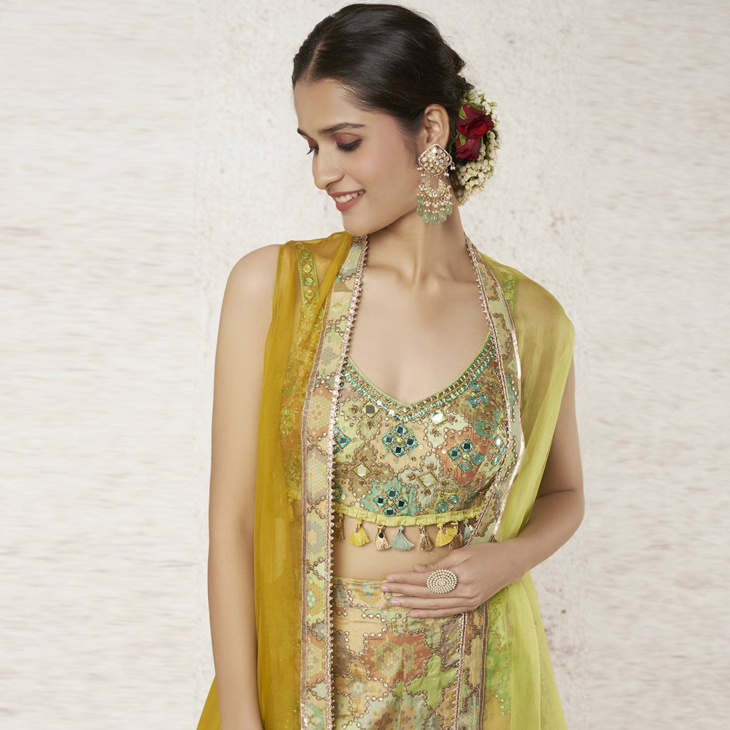 This tiered sharara has a play of geometry and lines with gota accents, paired with a beautiful design and delicate frill trim, creating a unique and elegant look. The set is complemented by an off-set blouse and a stylish organza cape. Style it with dangling gold earrings and heels for weddings or festivities.