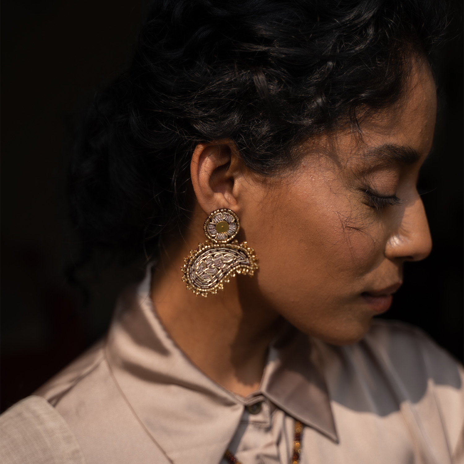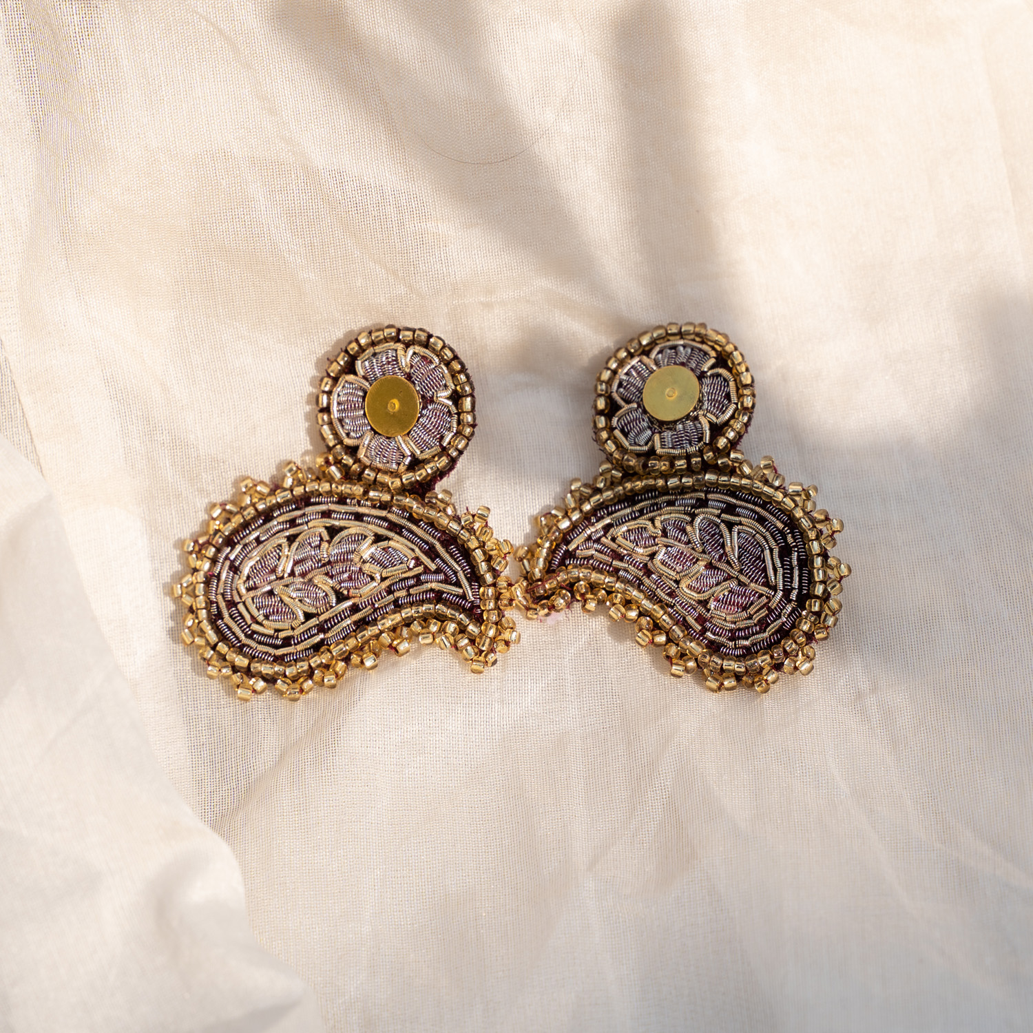 These stunning handcrafted earrings feature intricate gold zari and dabka work. They have a gold beaded edge on a rich maroon velvet base. Style them with a satin shirt and skirt for an Indo-western look.