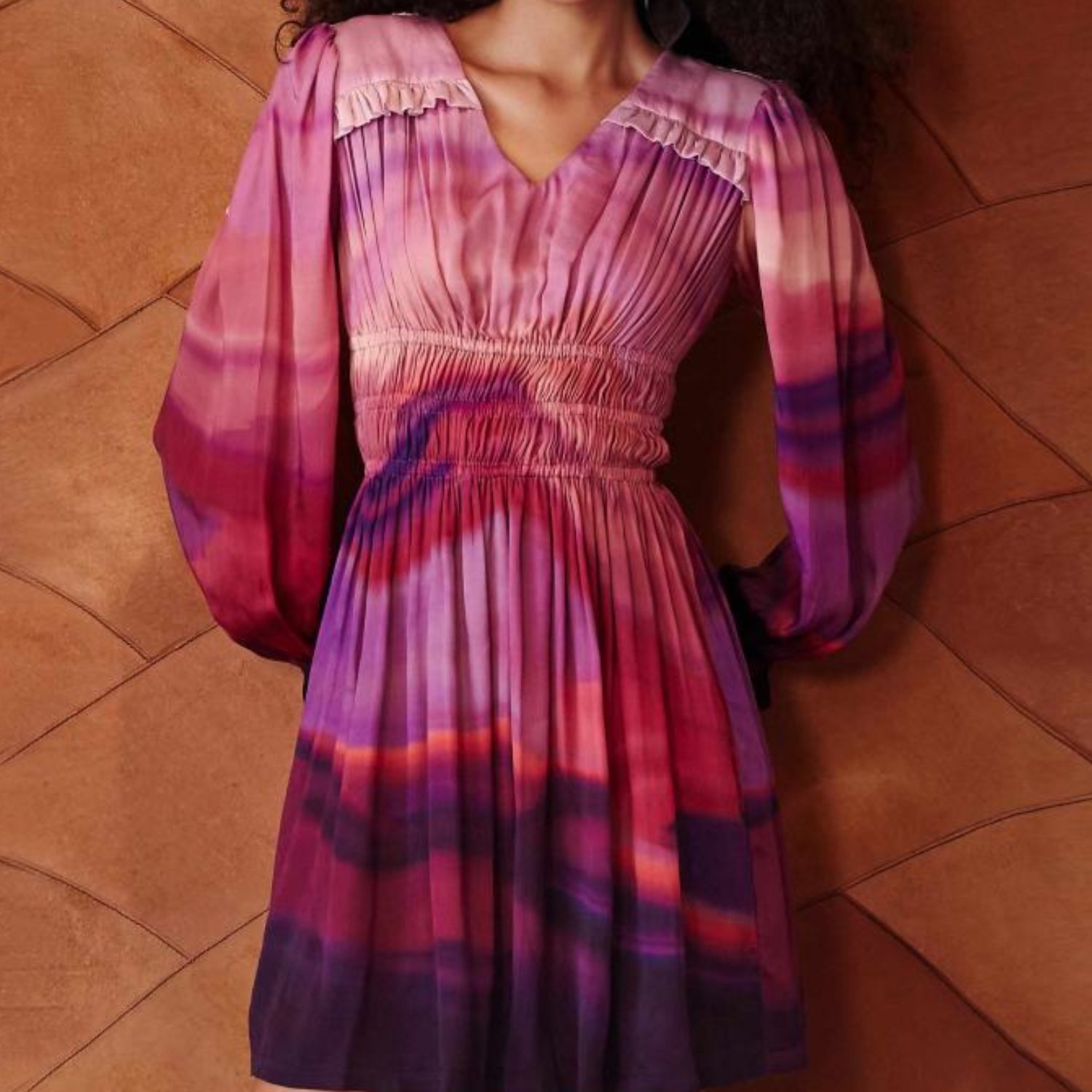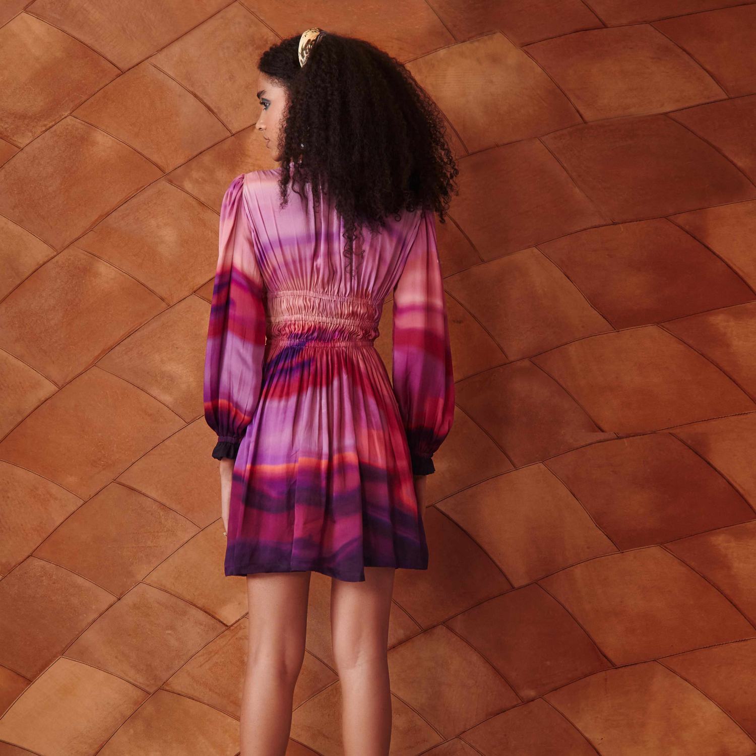 This beautiful dress is crafted from high-quality rayon fabric. It features a pink-purple print, bouffant sleeves, a V neck and an elasticated waist. It has a pleated detail on the shoulder and cuff, adding elegance to its design. Pair it with delicate earrings and heels for a dressy day.