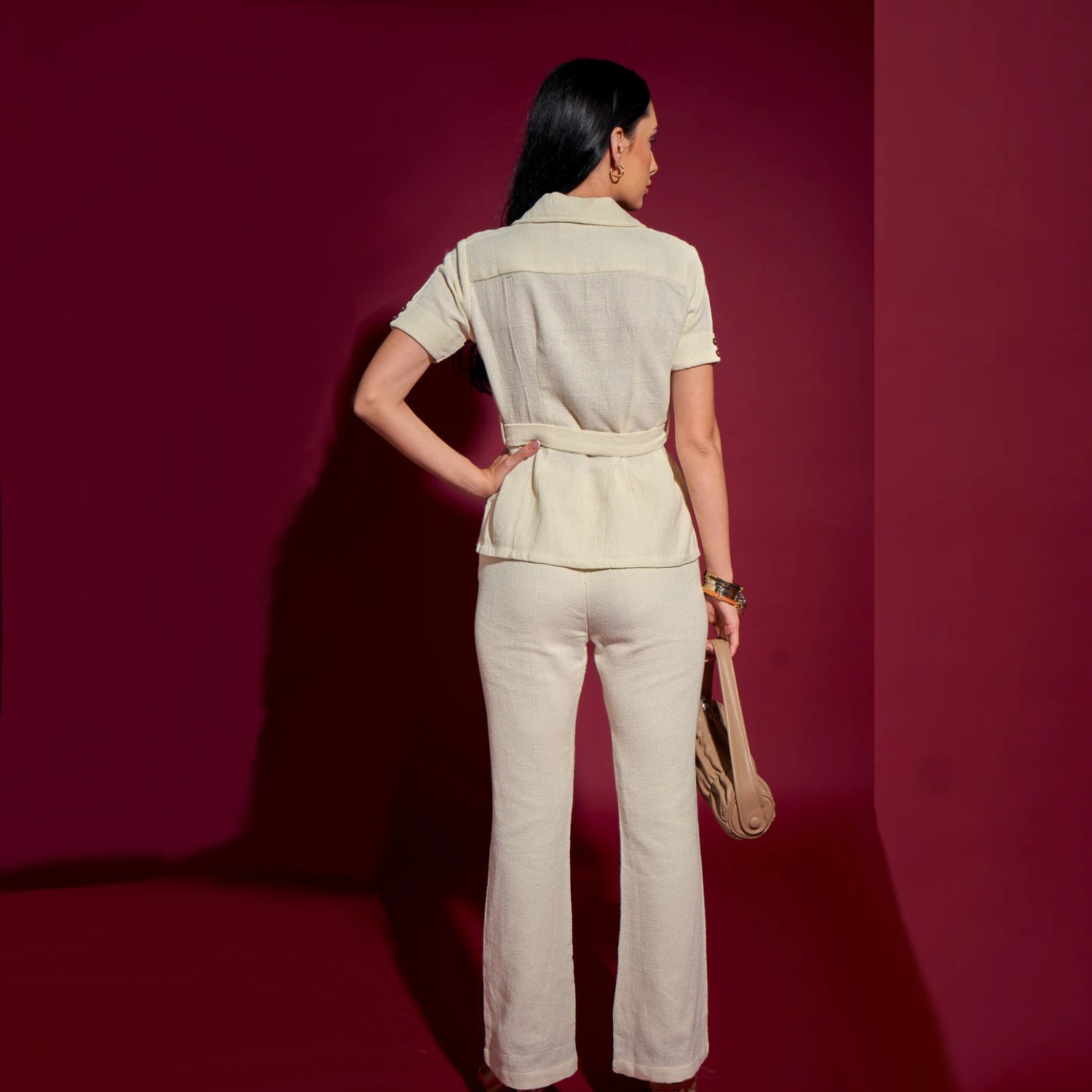 This summery co-ord set is crafted from a high-quality textured cotton fabric. The shirt has collars, half sleeves and a belt, allowing you to cinch the waist according to your preference. The shirt is paired with semi-loose elasticated pants with a pure cotton lining, offering comfort and style. Pair it with statement gold earrings and a sling bag for a dressy day soiree.