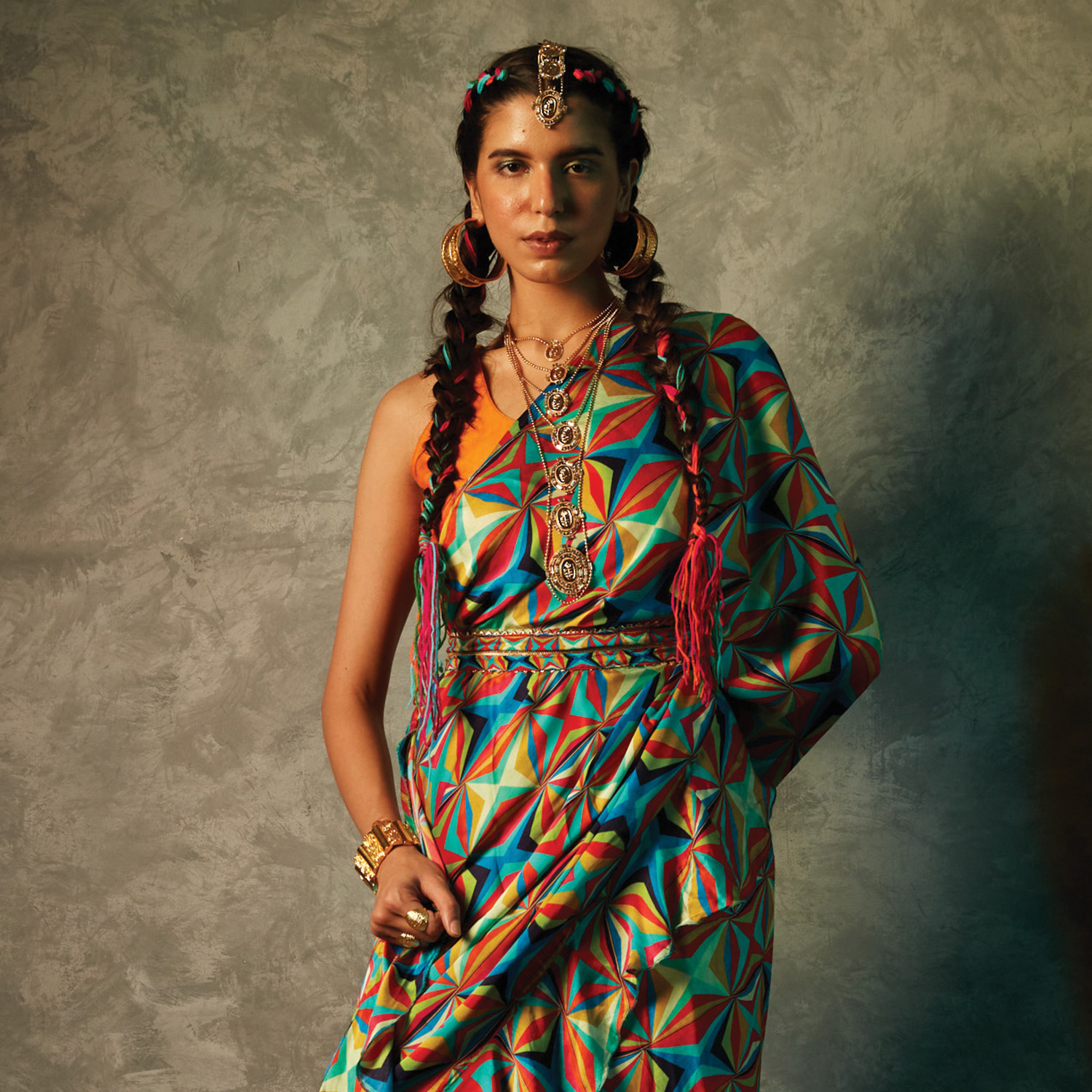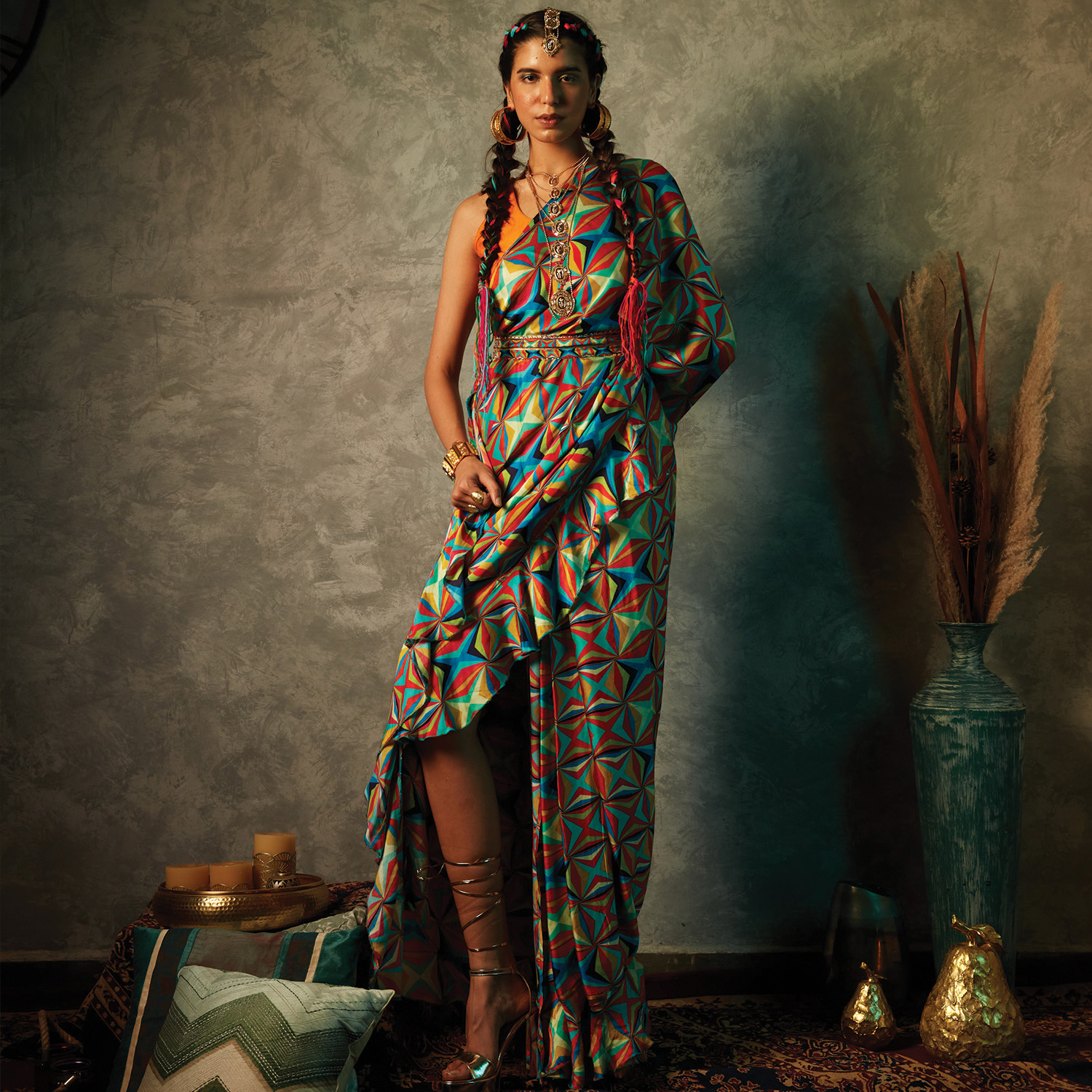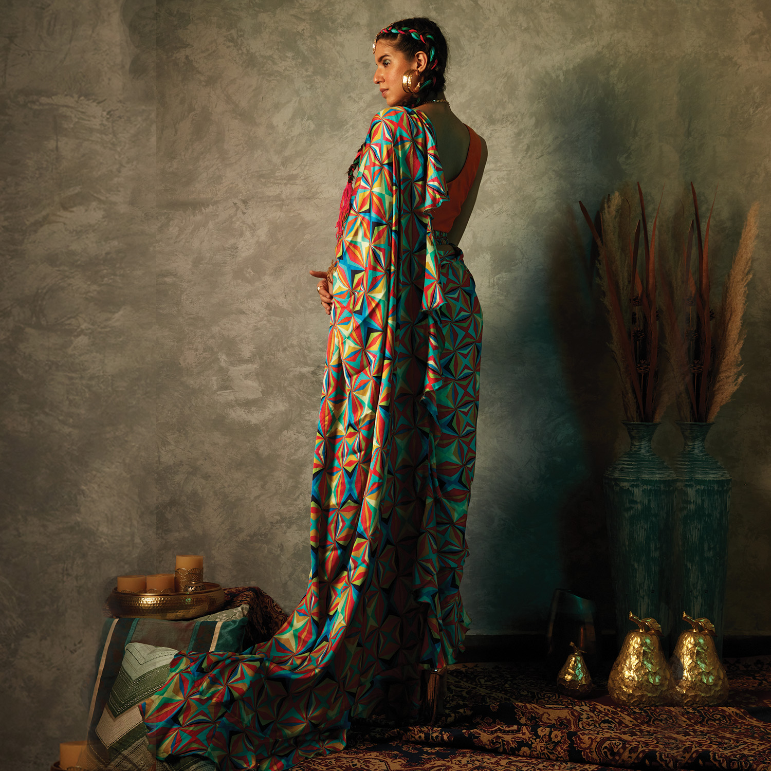 This printed saree is crafted from luxurious modal satin. It drapes gracefully and features a bold, big square print in multicolor, adding a vibrancy to the outfit. Style it with statement earrings and heels for an evening event.