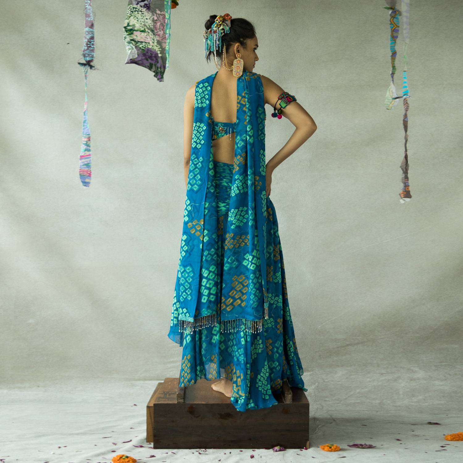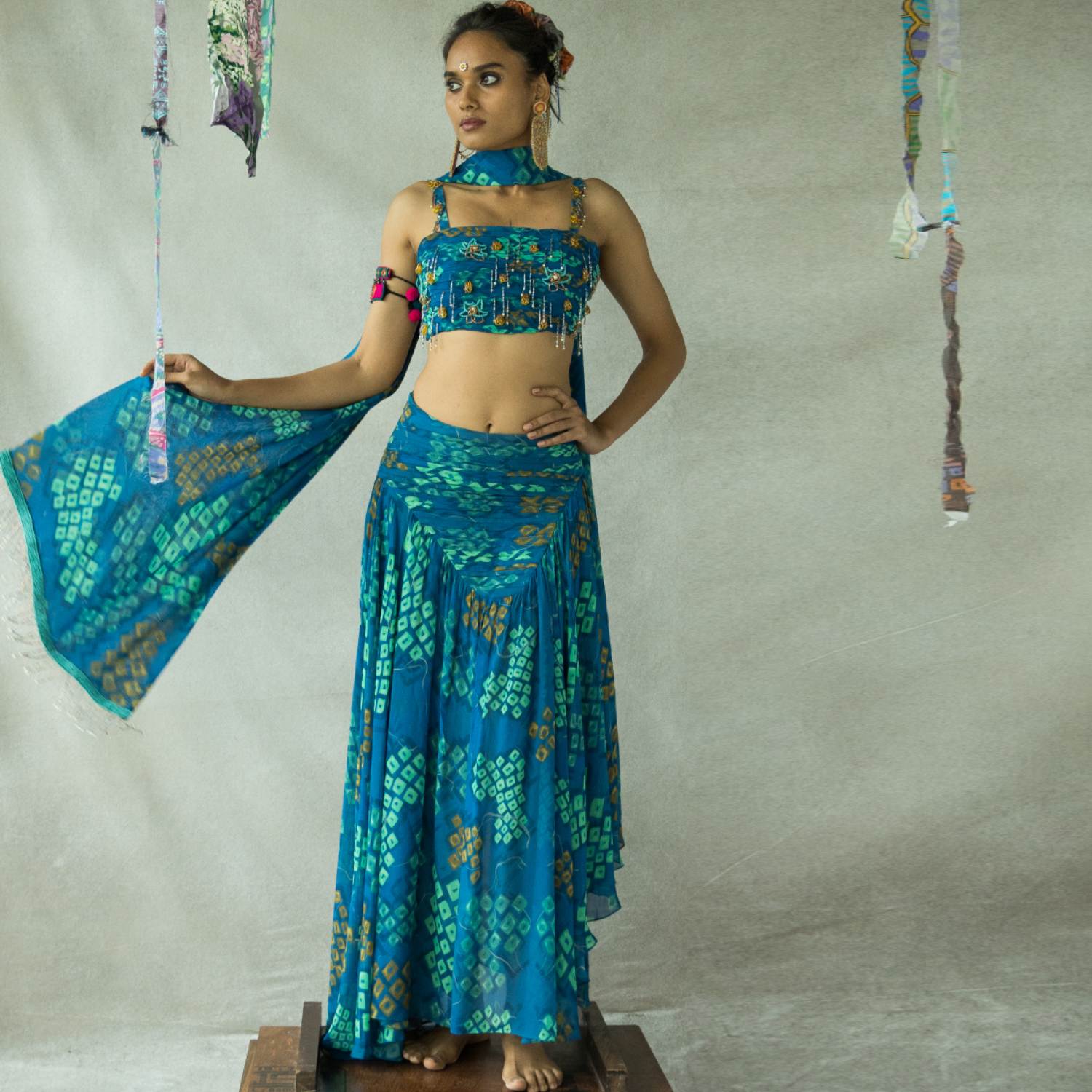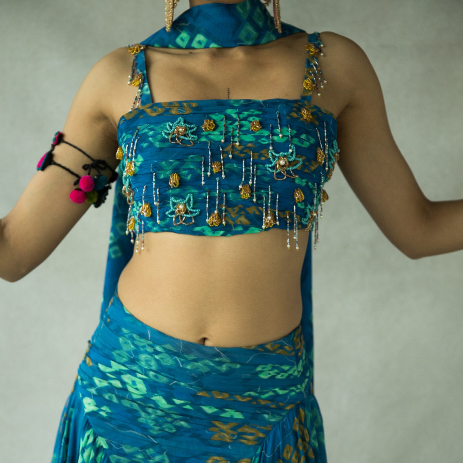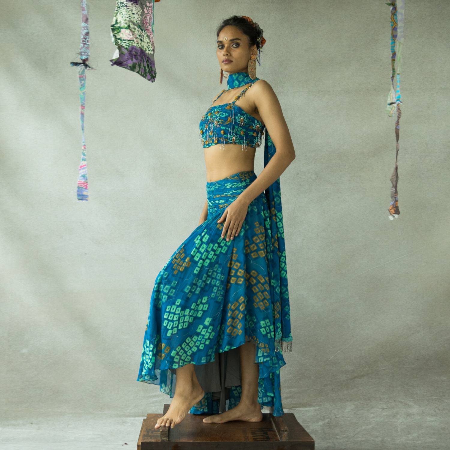 Discover true elegance with our bindoo lehenga set. Impeccably crafted, this set showcases a square neck blouse adorned with intricate hand embroidery. The asymmetrical skirt adds a contemporary twist, while the embroidered dupatta adds a touch of royalty. Enhance your style quotient with this stunning ensemble.