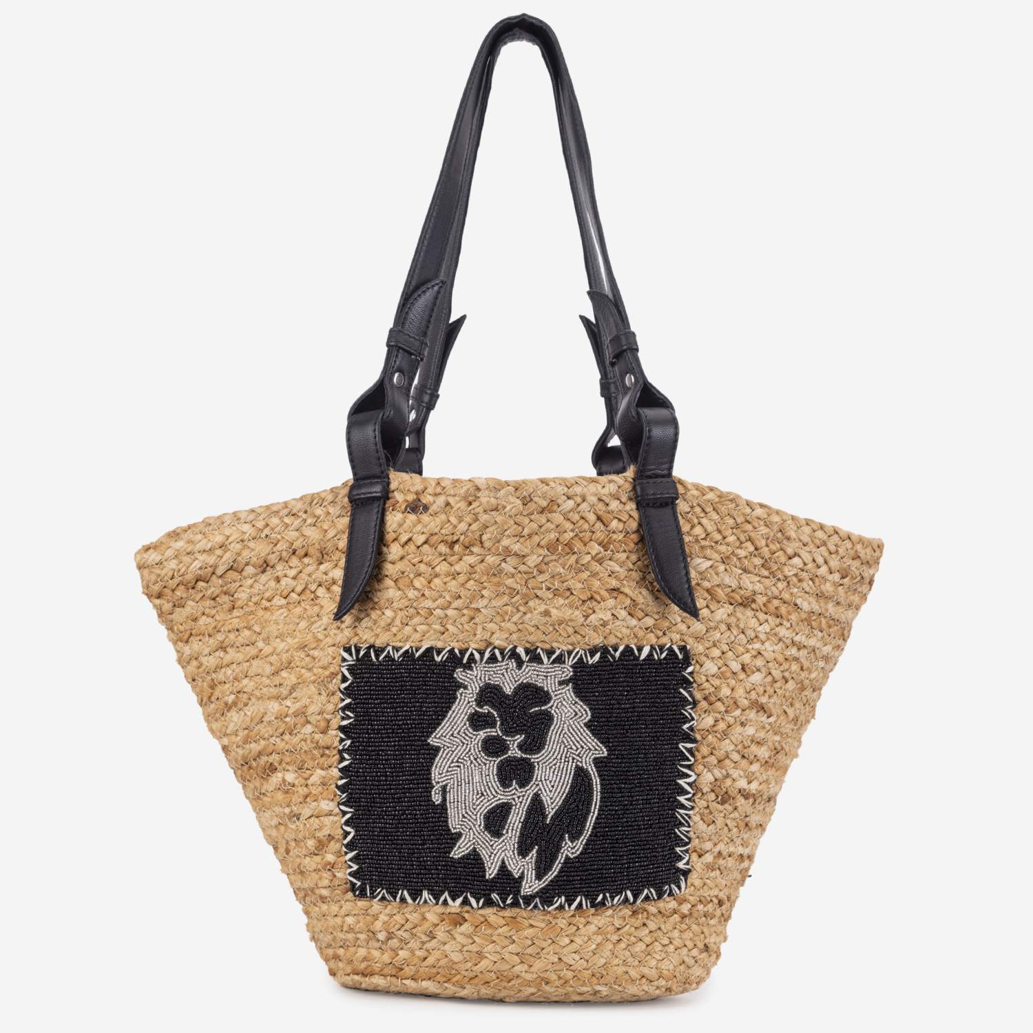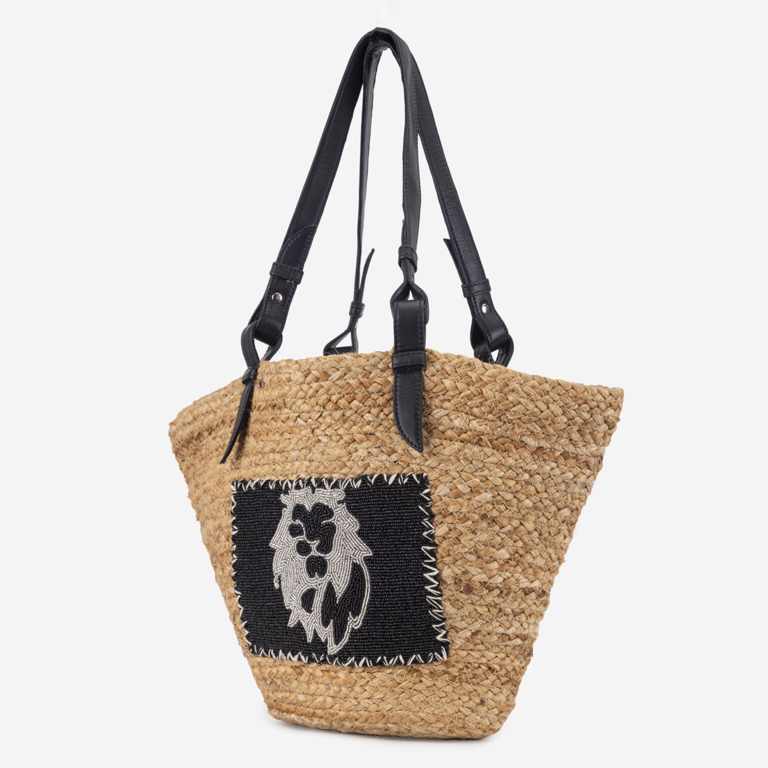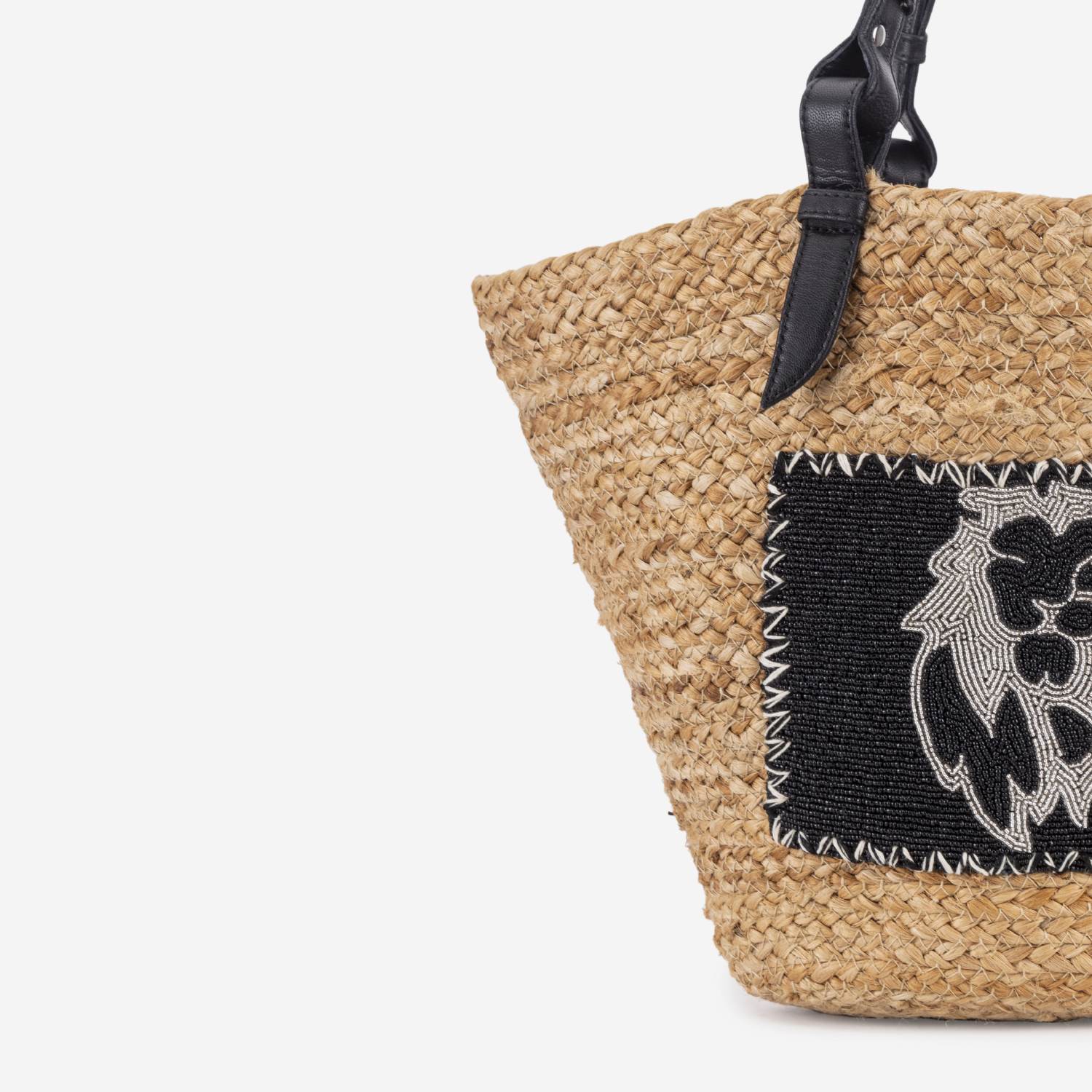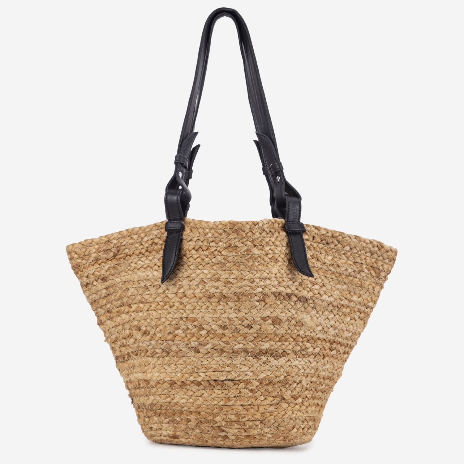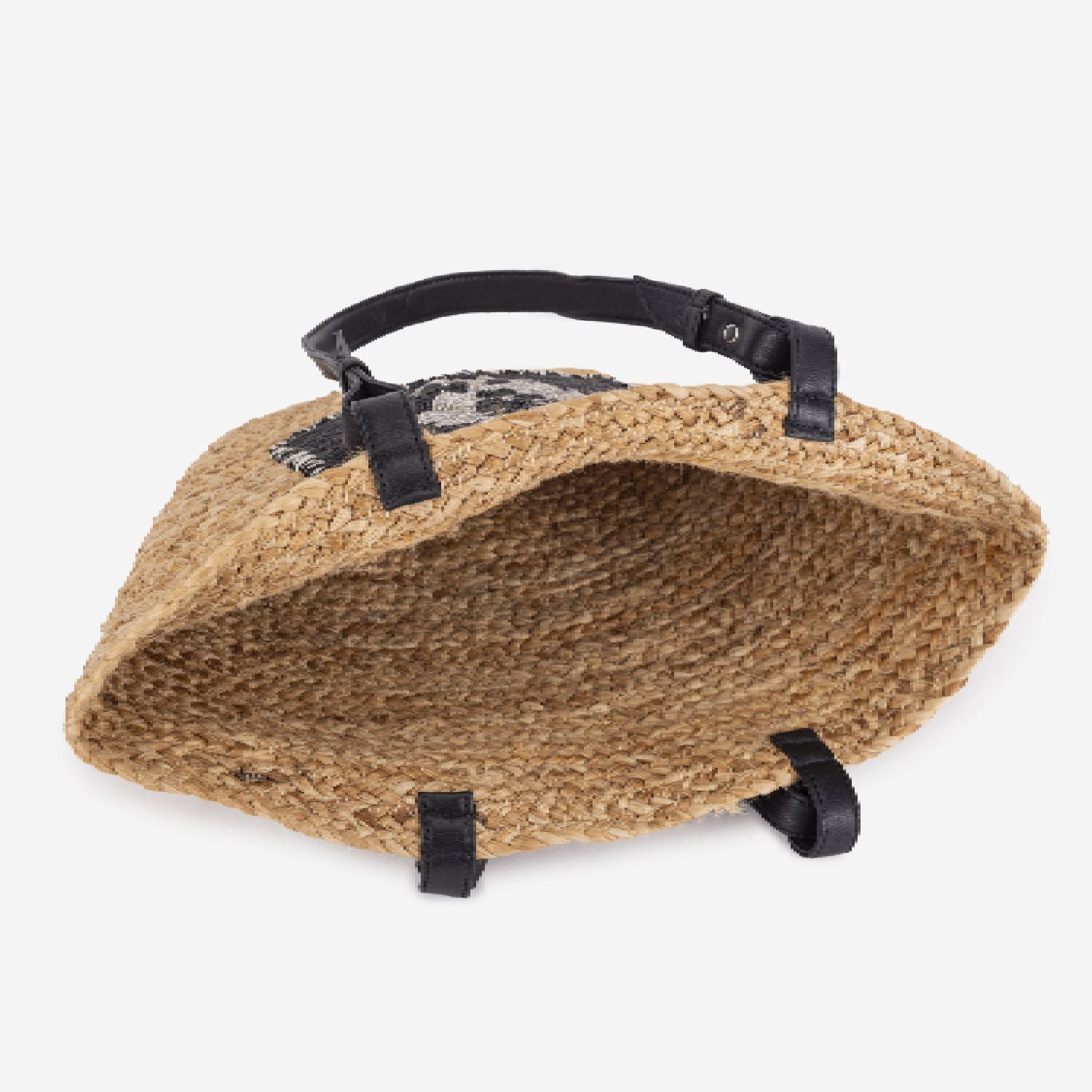 This beautiful bag features a combination of black and beige jute, giving it a natural and earthy aesthetic. It comes with a black leather handle, adding elegance and durability to the bag. This small tote has an open closure, allowing for easy access to your belongings.