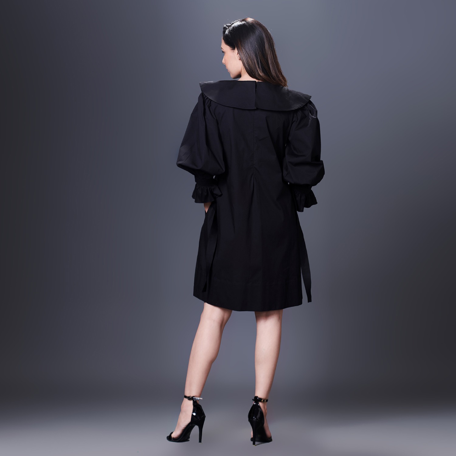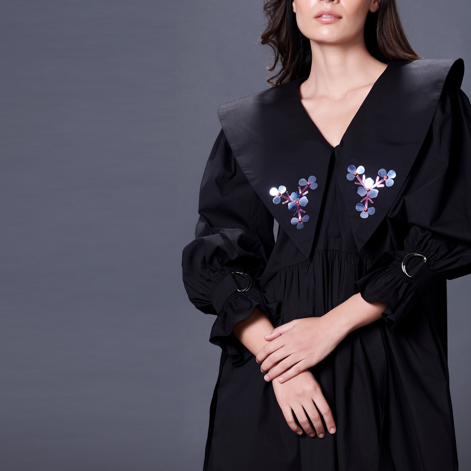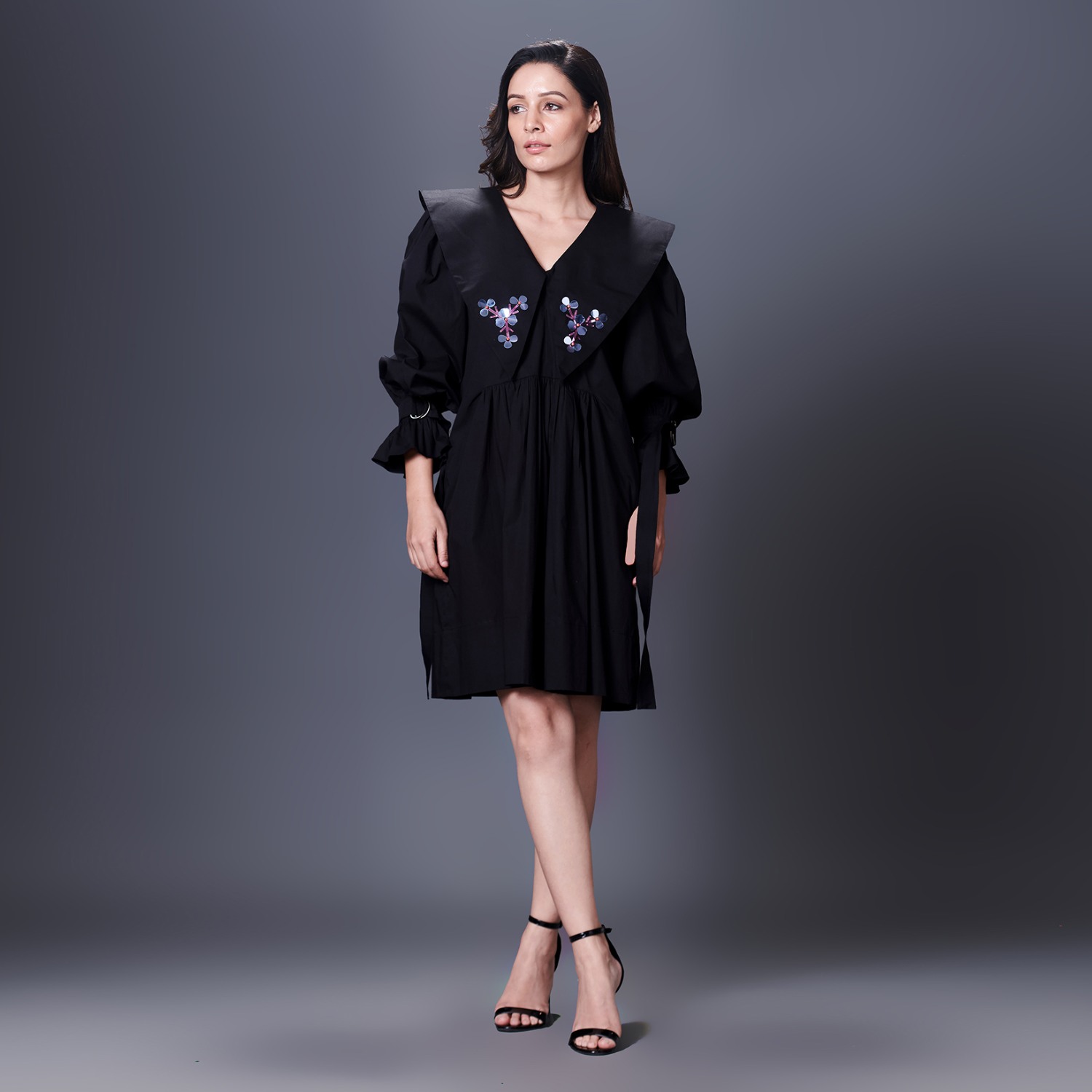 This beautiful black cotton dress comes with sailor collars, adding a touch of nautical-inspired design to the dress. It features a V-neckline and floral embroidery on the collars which provides a delicate and feminine accent. It has pleats, and balloon sleeves with belt detailing, giving it a fashionable and unique look. Pair it with delicate earrings and a sling bag for a dressy evening soiree.