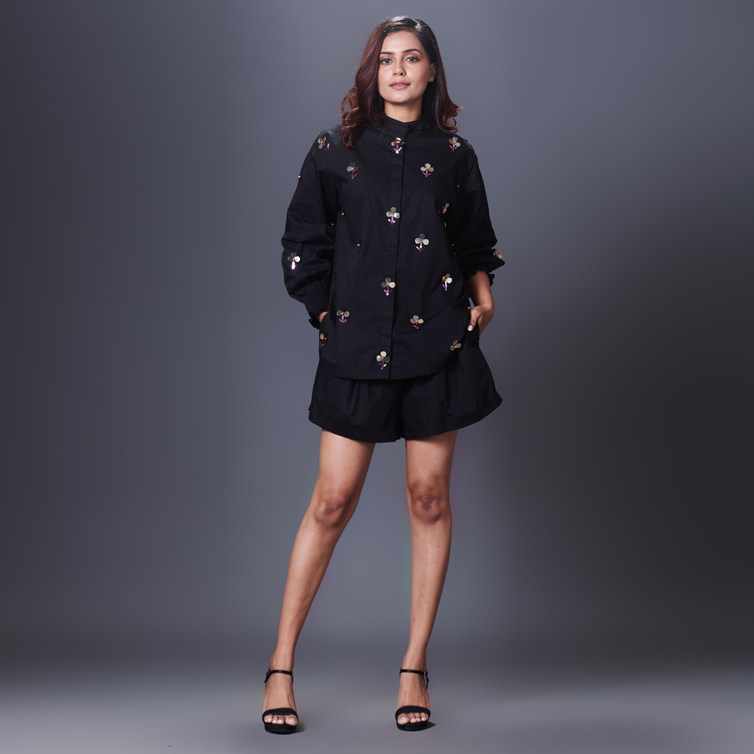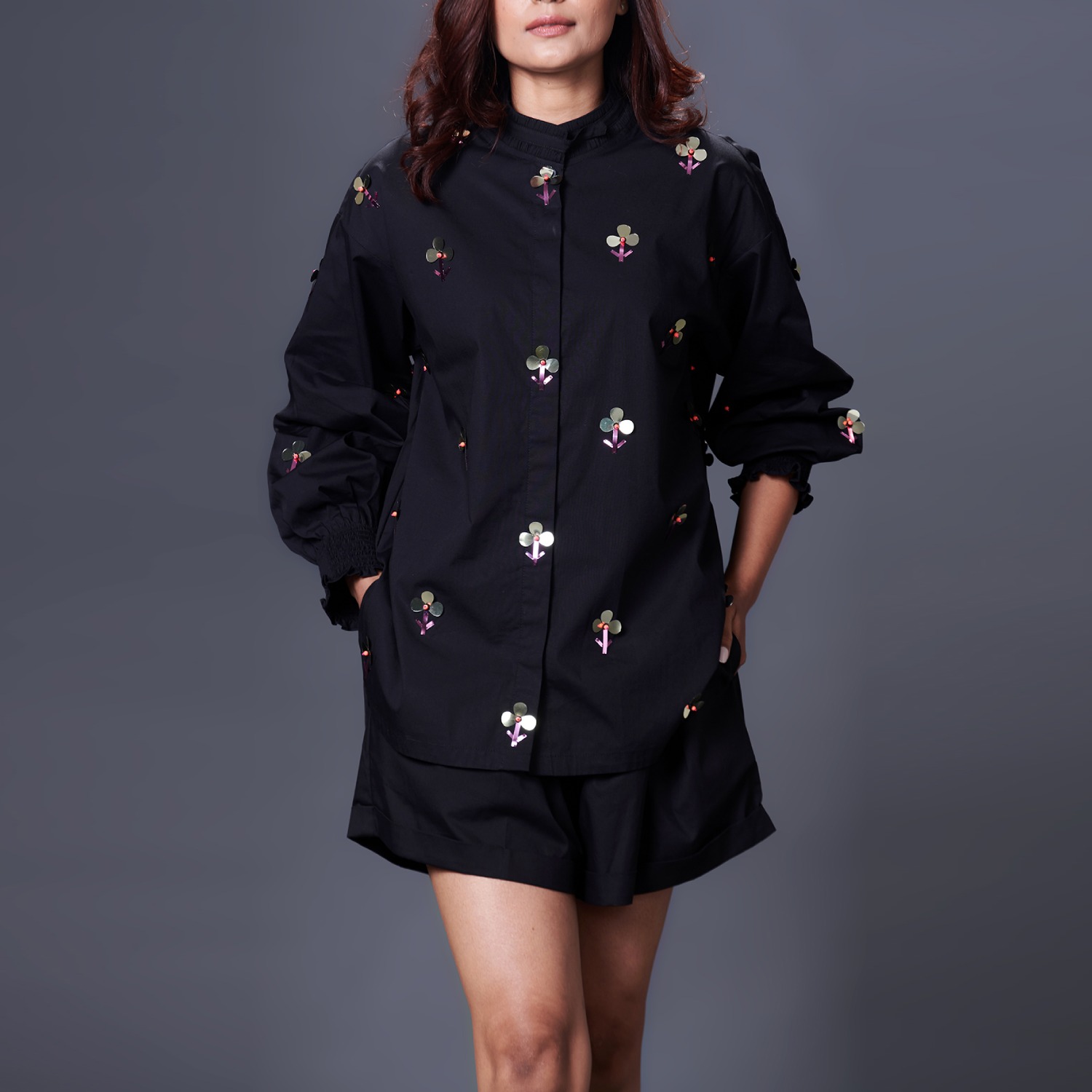 Crafted from high-quality cotton fabric, this beautiful shirt comes in a black shade. It features intricate hand embroidery, puffed sleeves, and a curved hemline, adding elegance and style to the look. Style it with dangling earrings and a sling bag for a dressy event.