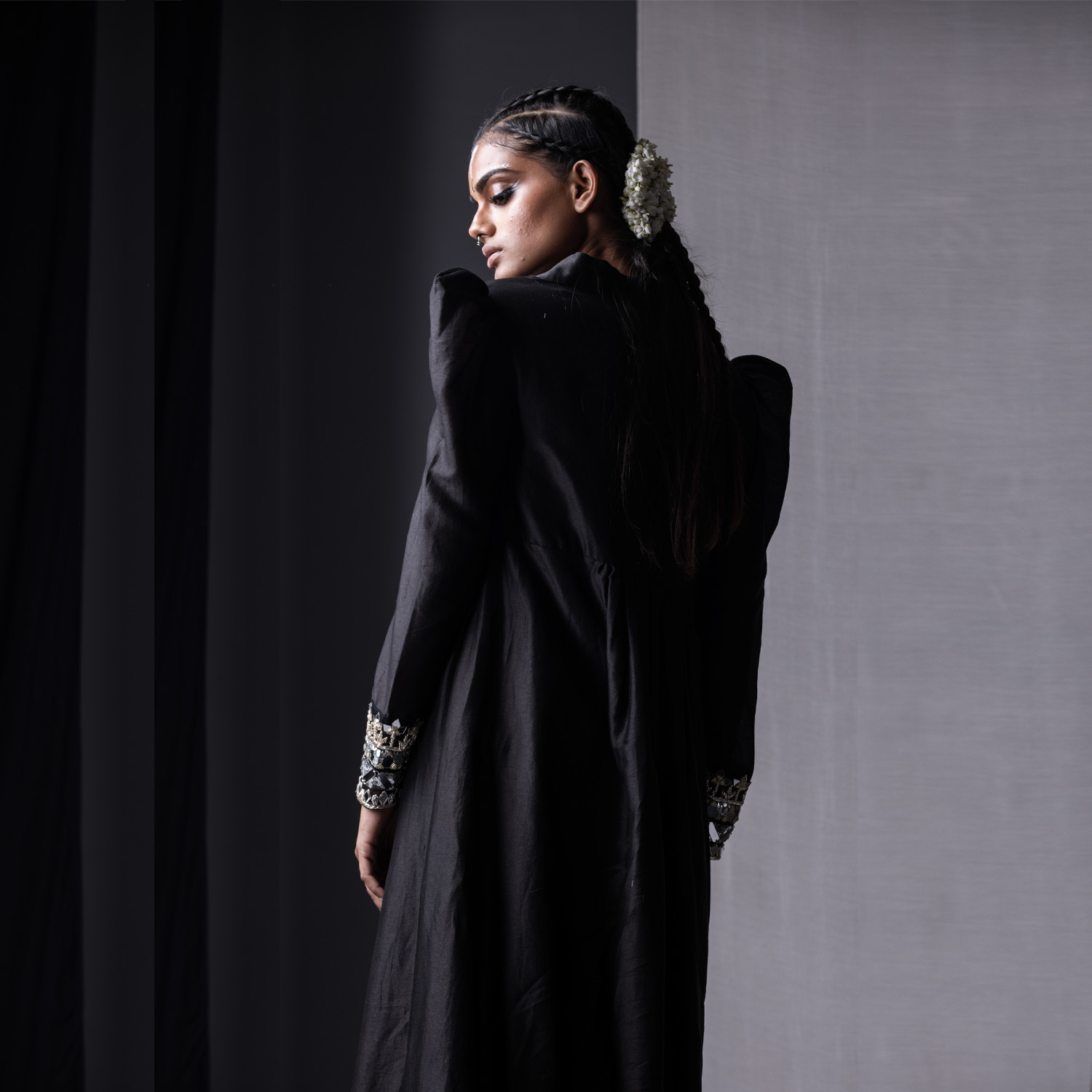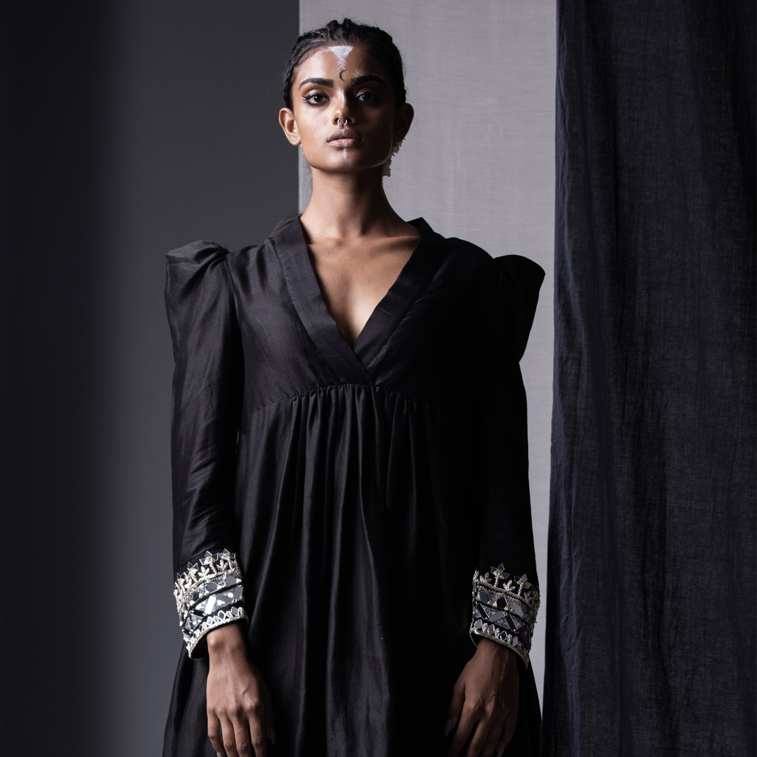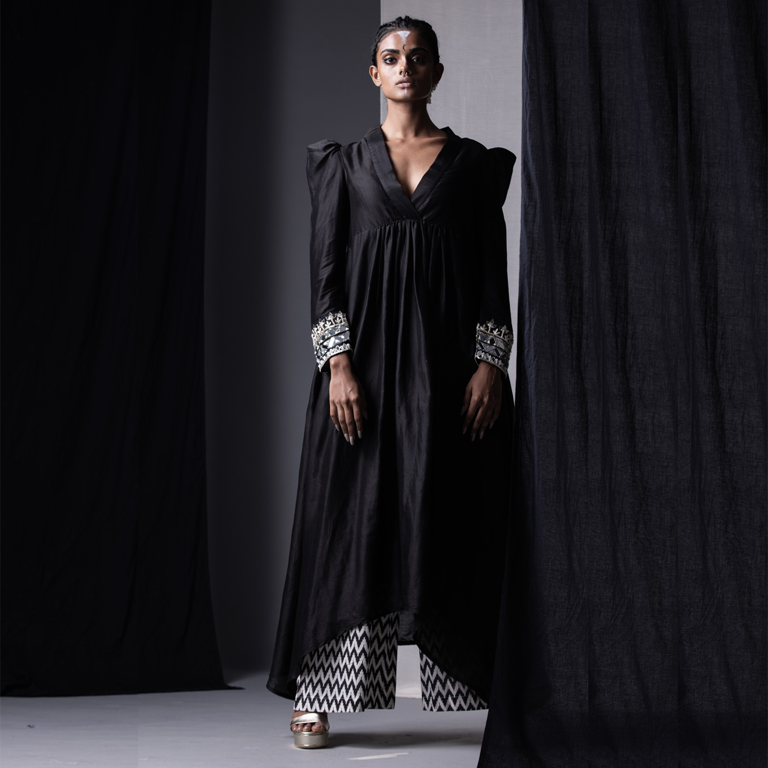 The black kurta features beautifully embroidered cuff sleeves, adding elegance to the outfit. It has a V-neck and full cowl sleeves, offering a modern and chic silhouette. The set is completed with printed pants that complement the kurta beautifully. Style it with a choker and heels for a dressy evening event.