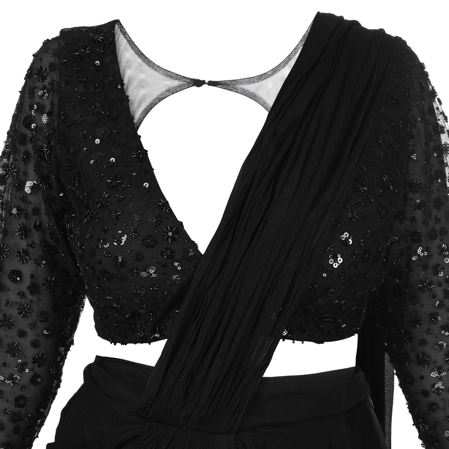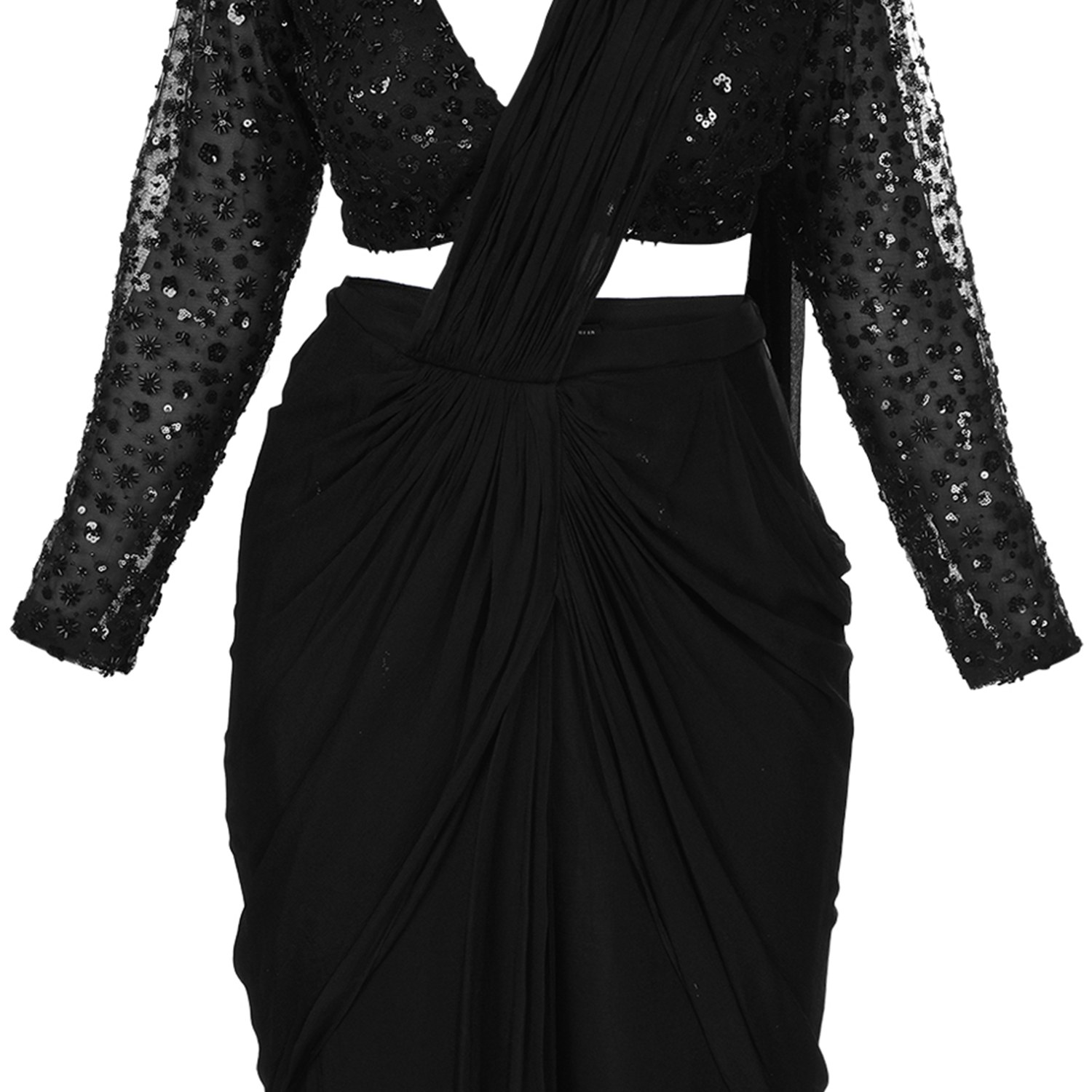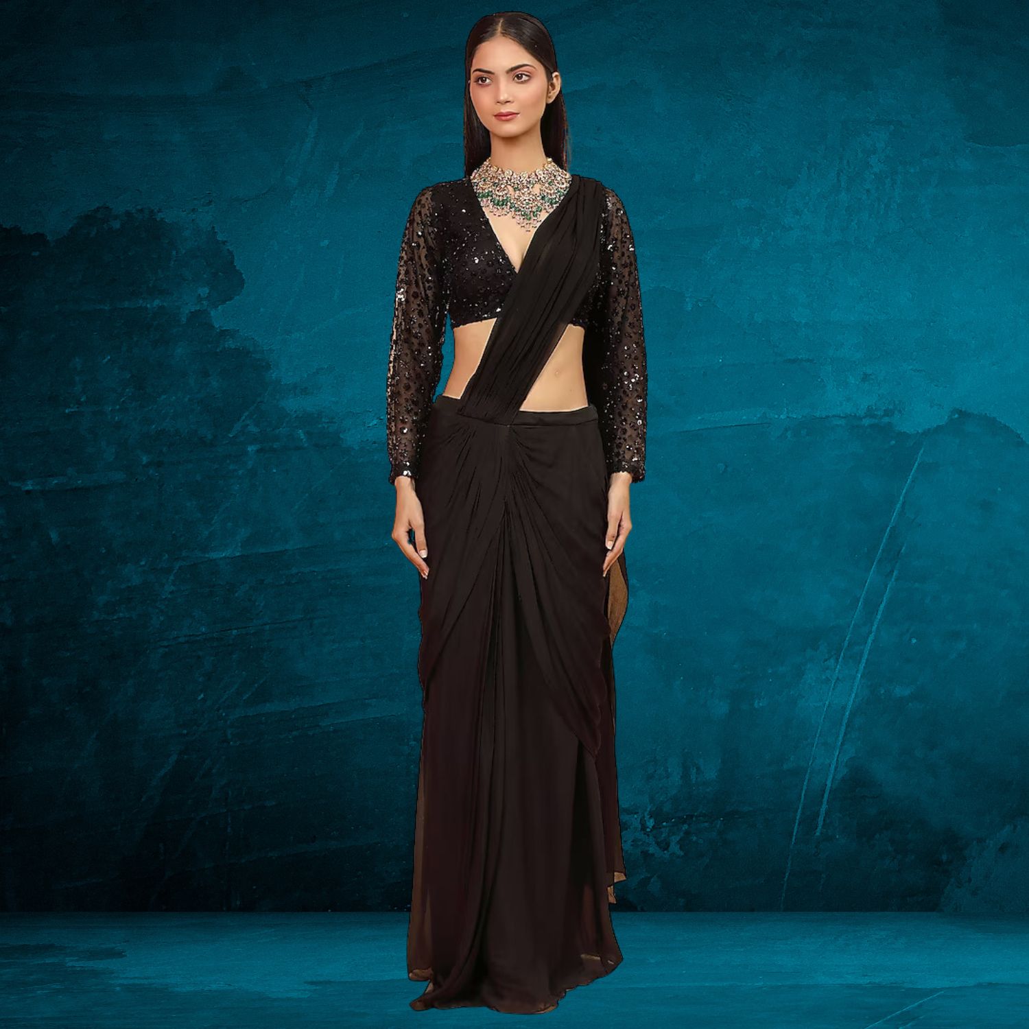 ₹ 34,000 (10% off)Get ready to stun with stunning black pre-draped saree, crafted from luxurious chiffon fabric with a lycra lining. Pair it with a dazzling sequin and floral embroidered v-neck blouse for a sophisticated, high-end look. This ensemble exudes an elevated and refined charm, perfect for any upscale occasion.