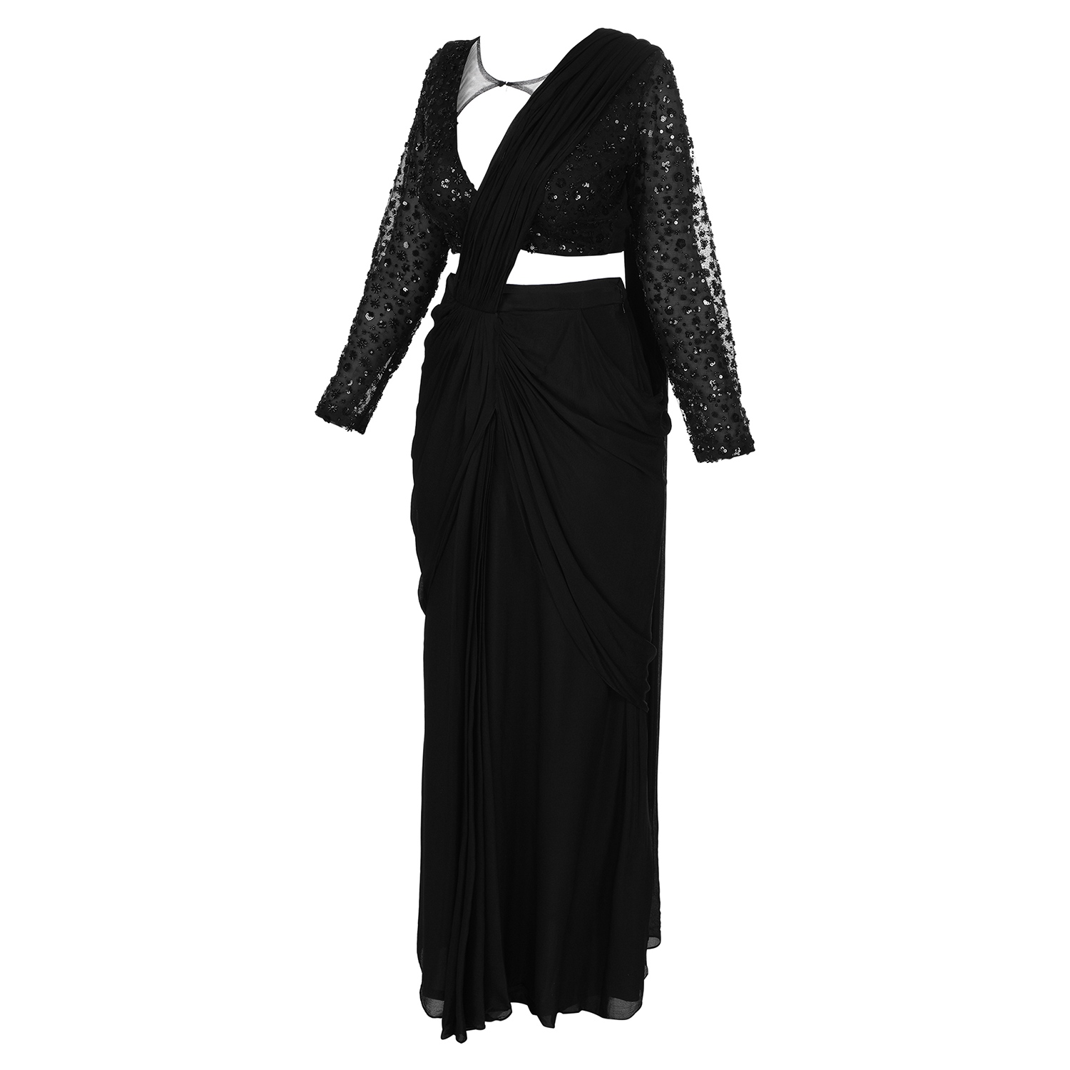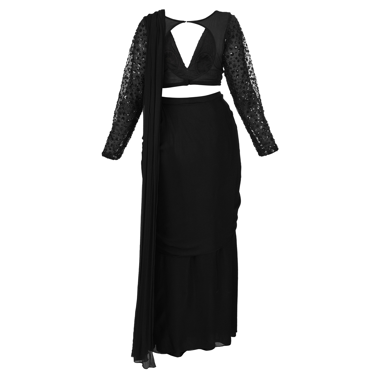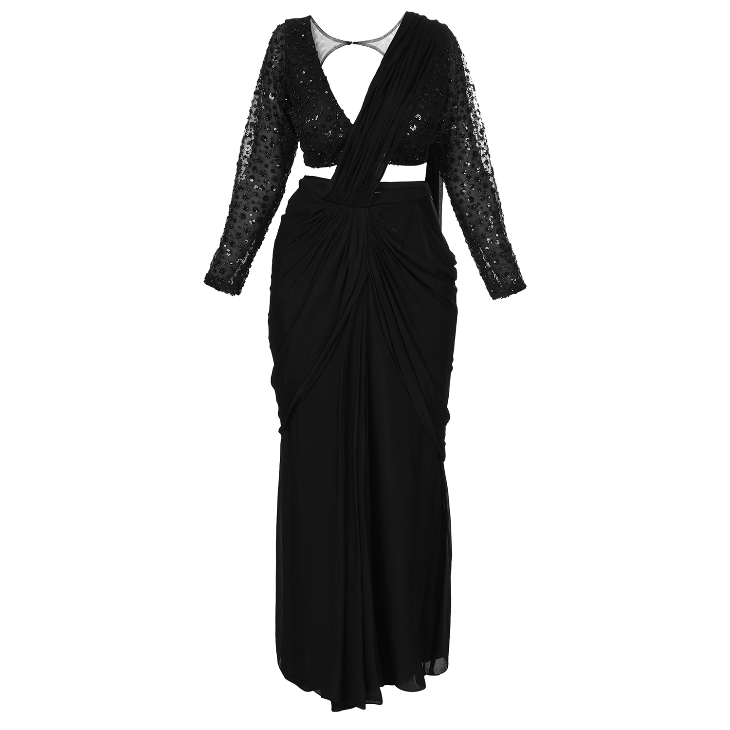 ₹ 34,000 (10% off)Get ready to stun with stunning black pre-draped saree, crafted from luxurious chiffon fabric with a lycra lining. Pair it with a dazzling sequin and floral embroidered v-neck blouse for a sophisticated, high-end look. This ensemble exudes an elevated and refined charm, perfect for any upscale occasion.