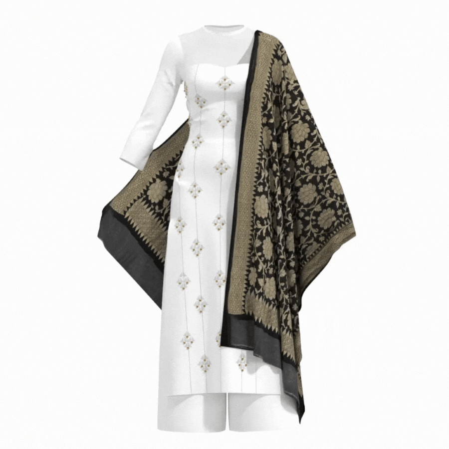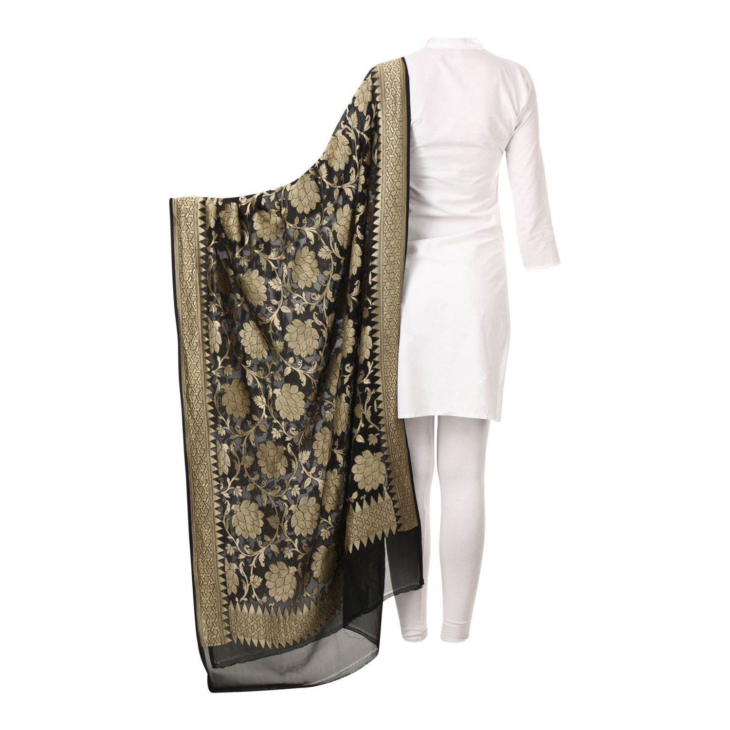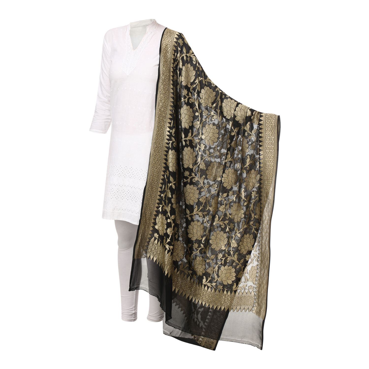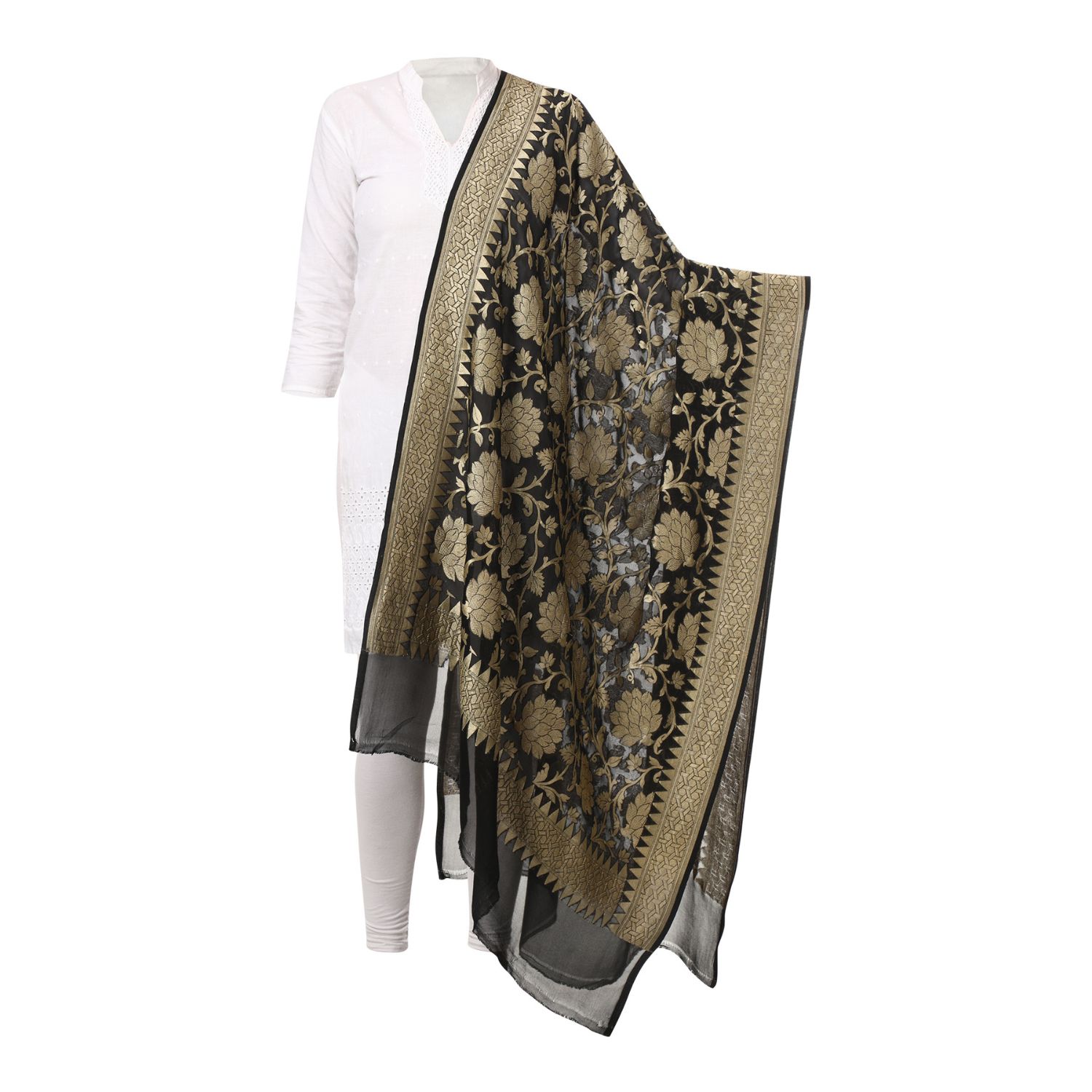 Upgrade your ethnic wardrobe with this evergreen black georgette dupatta. It features intricate zari jaal work for a stunning effect.