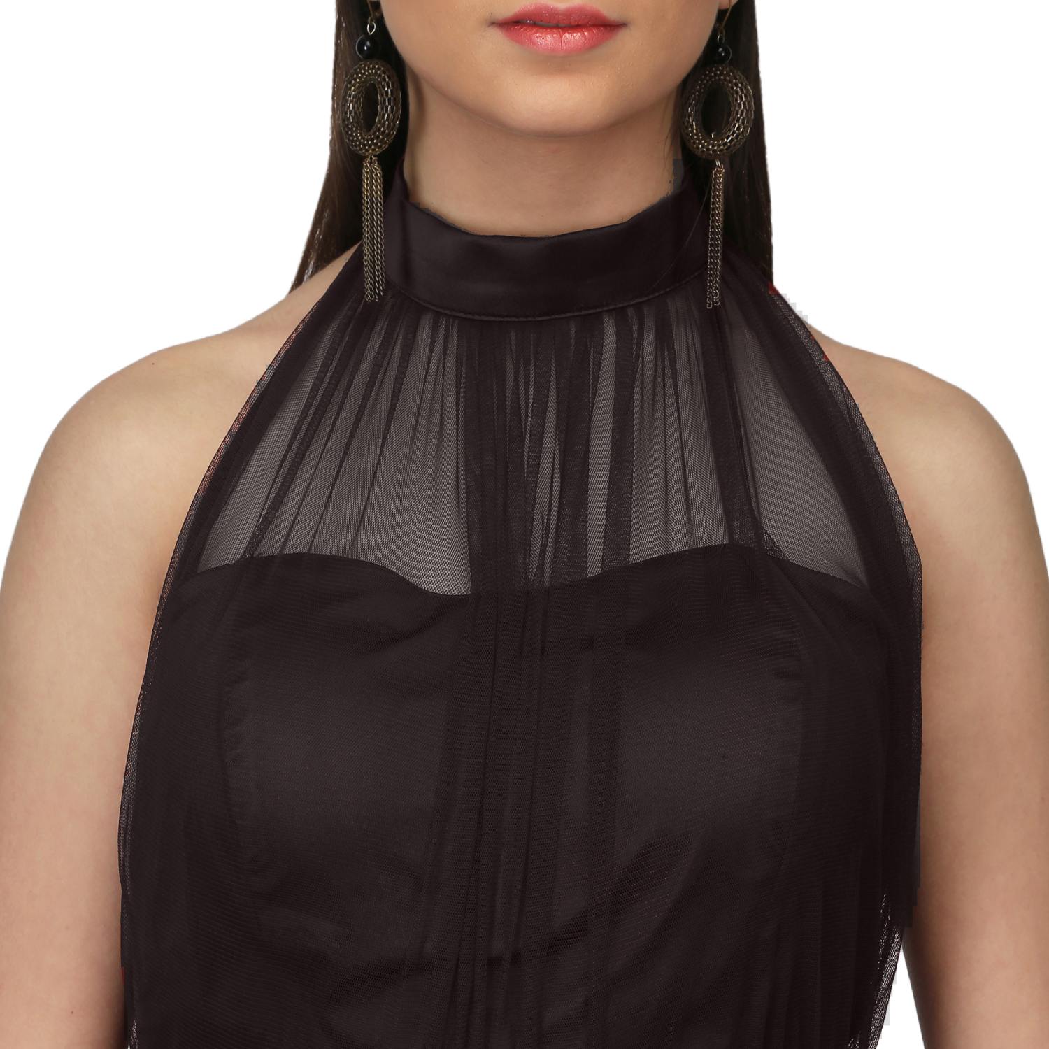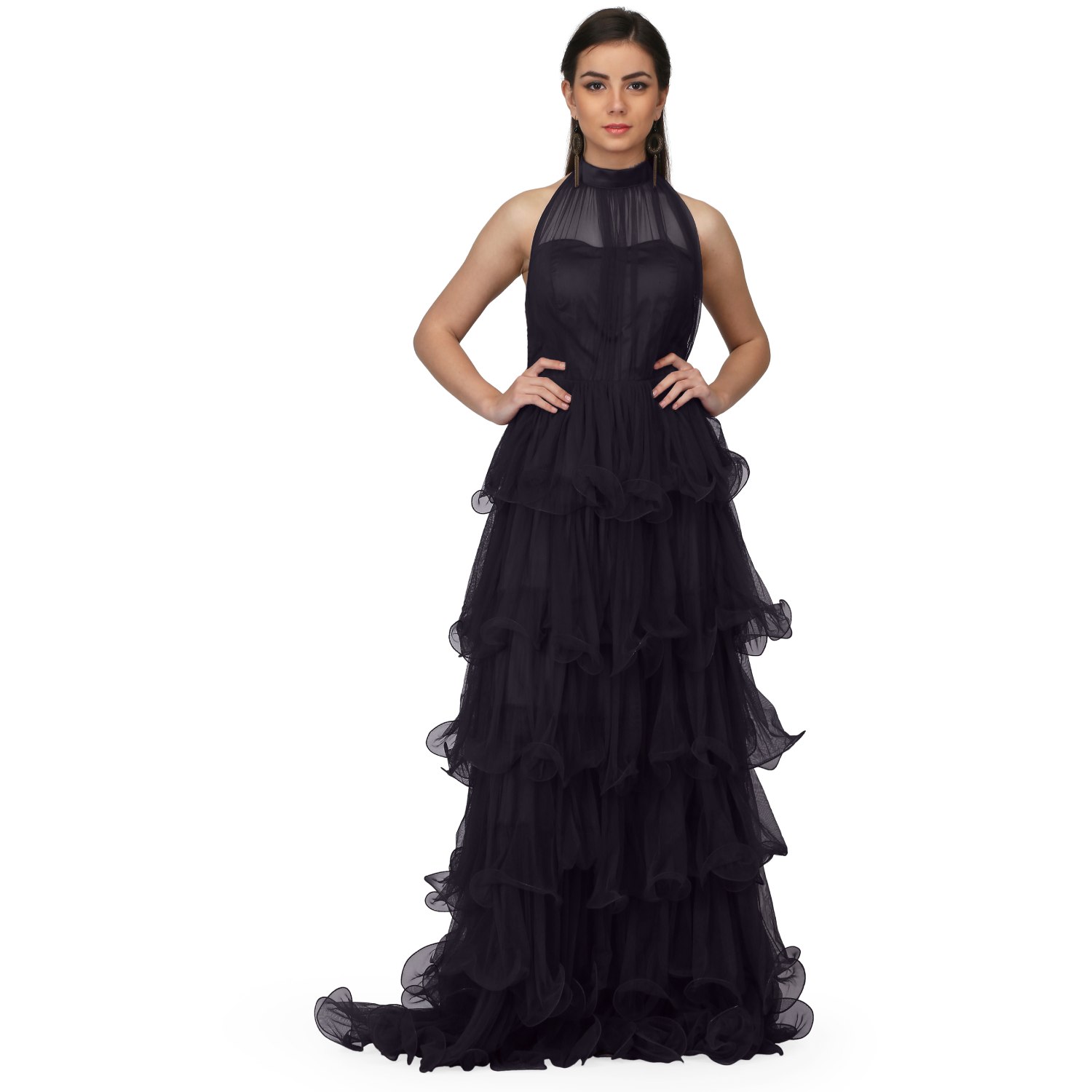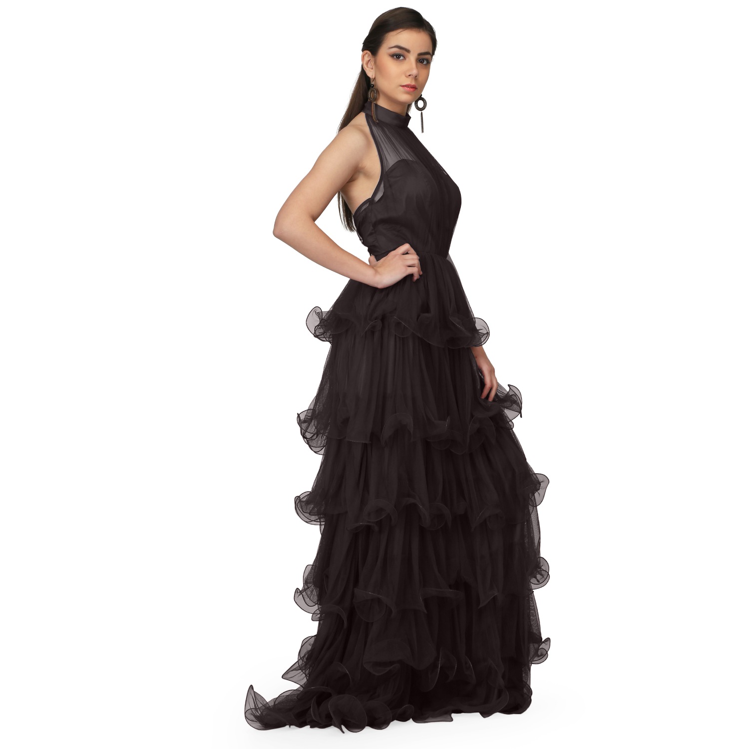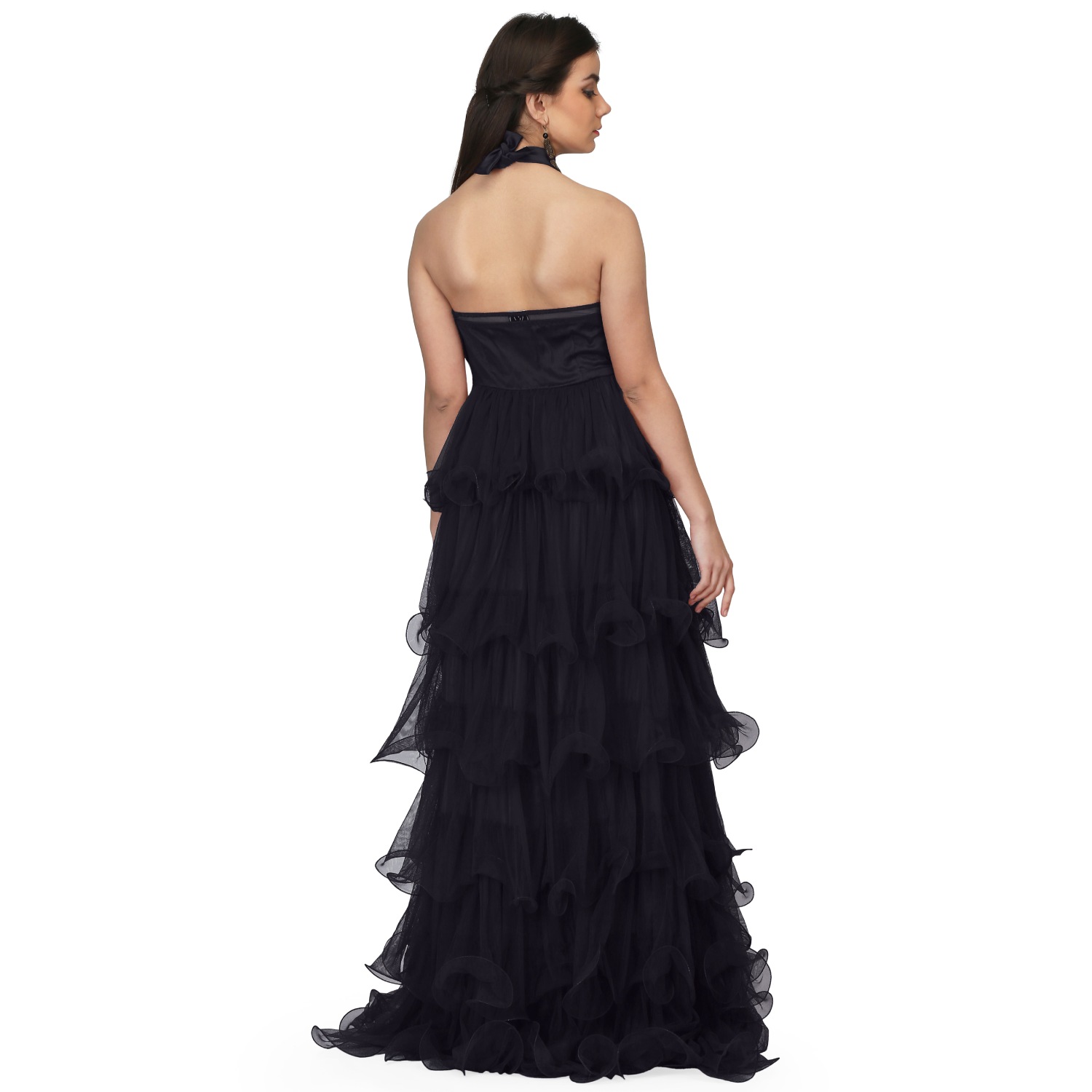 ₹ 6,500 (20% off)This gorgeous black maxi dress is crafted from a combination of net and satin fabrics, ensuring a luxurious and silky texture. The halter neck design adds a hint of sophistication to the dress, accentuating your neckline beautifully. The dress features a multitier ruffle and gathered draped design that adds uniqueness to your look. Pair it with statement earrings and a sling bag for a dressy evening soiree.