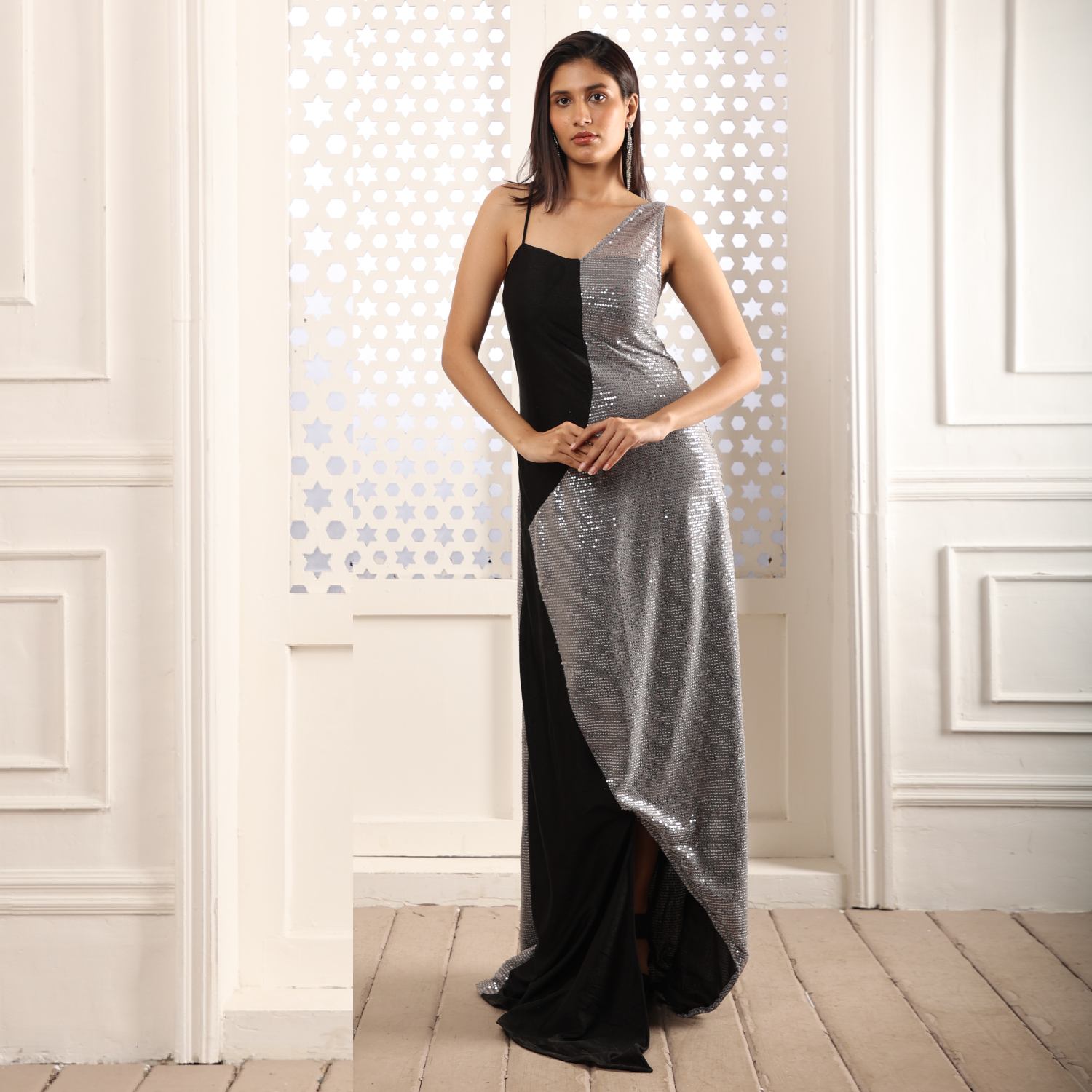 Dazzle in the black sequin gown adorned with shimmering sequins on luxurious sequin fabric. This glamorous ensemble combines sophistication with a touch of sparkle, creating a show stopping look. The sleek silhouette enhances your allure, making it an ideal choice for glamorous events where you aim to make a lasting impression.