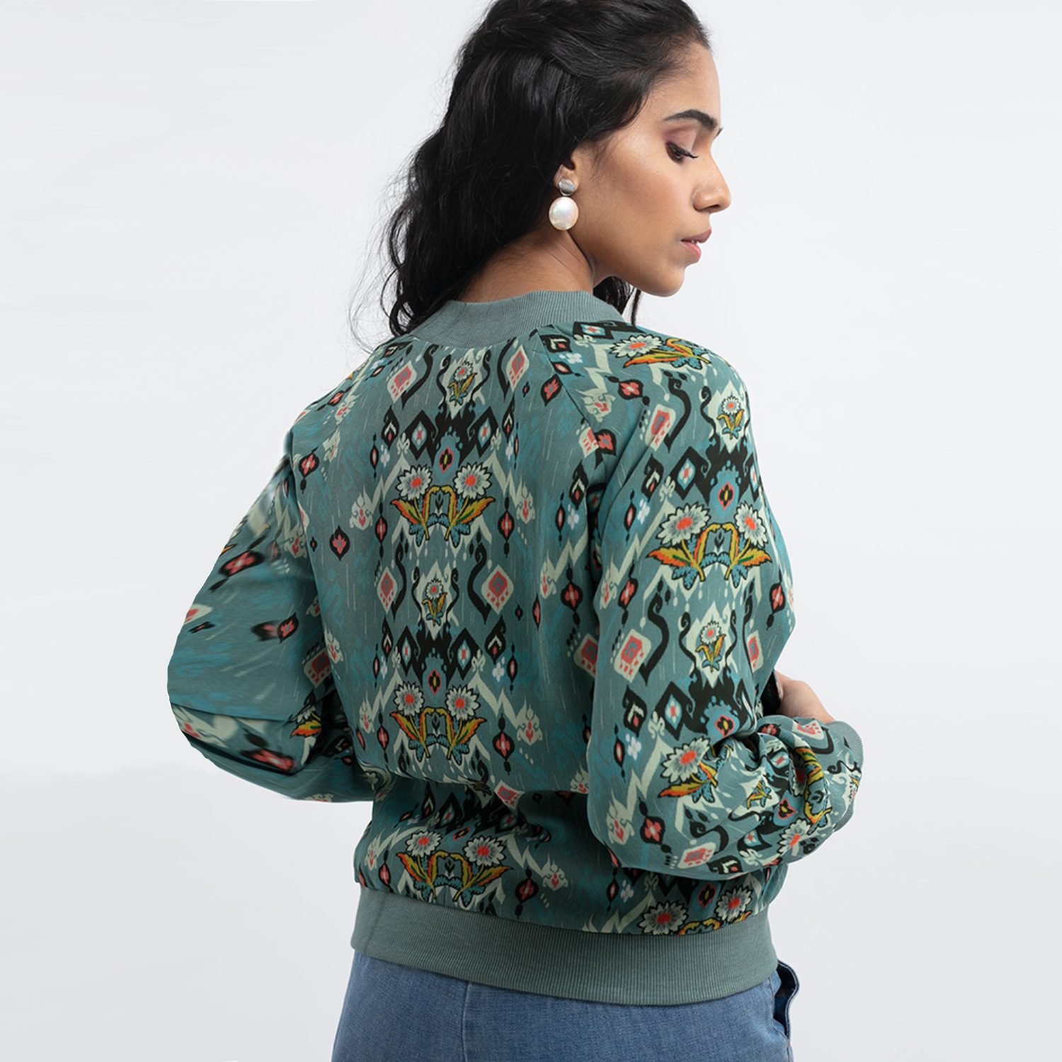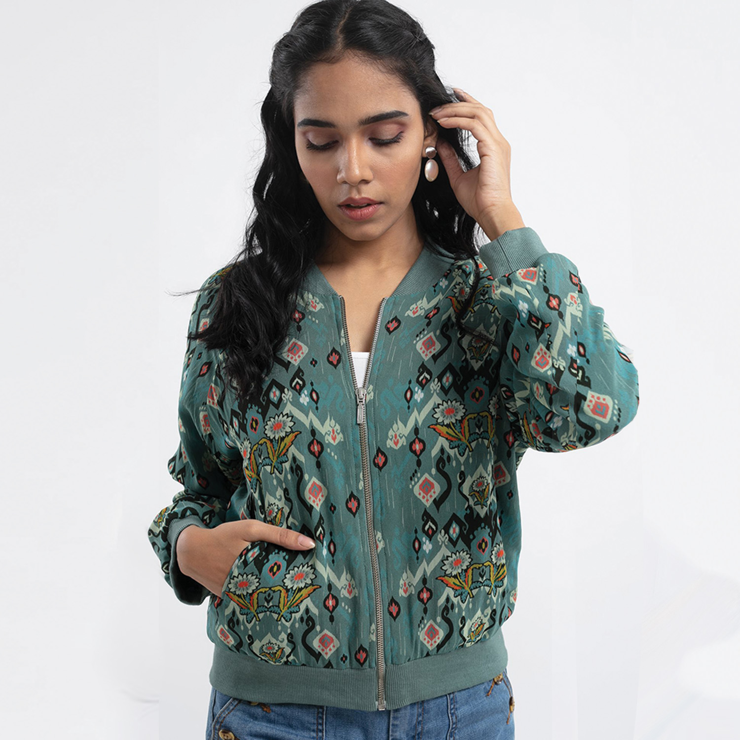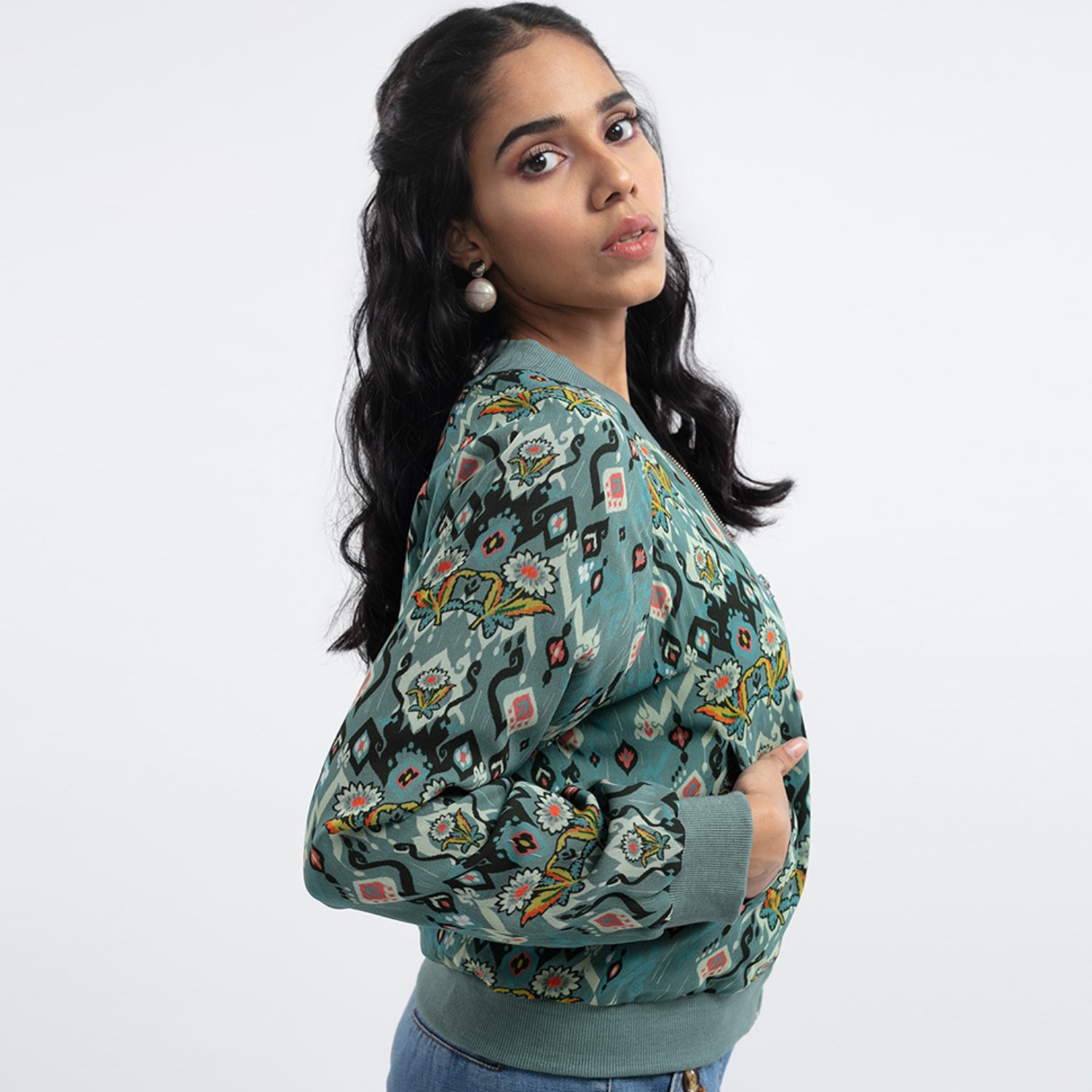 Indulge in style with a blue Ikat love print art georgette bomber jacket. This chic piece effortlessly combines contemporary flair with timeless design. The vibrant print adds a playful touch, while the bomber silhouette offers versatility. Elevate your fashion statement, making every moment a celebration of artistry and sophistication.