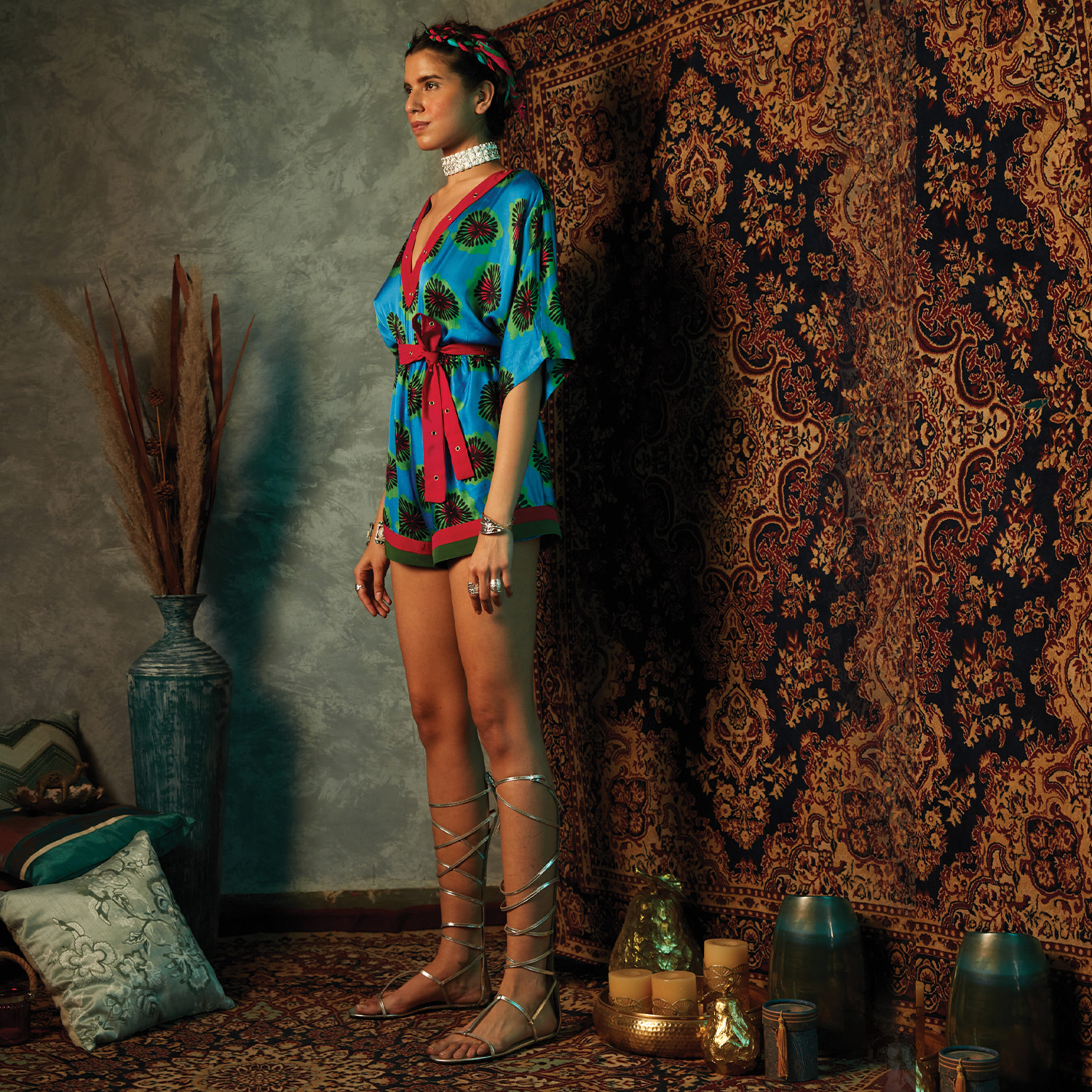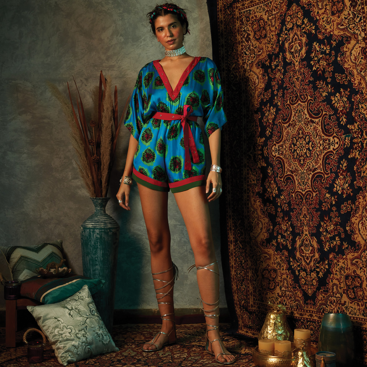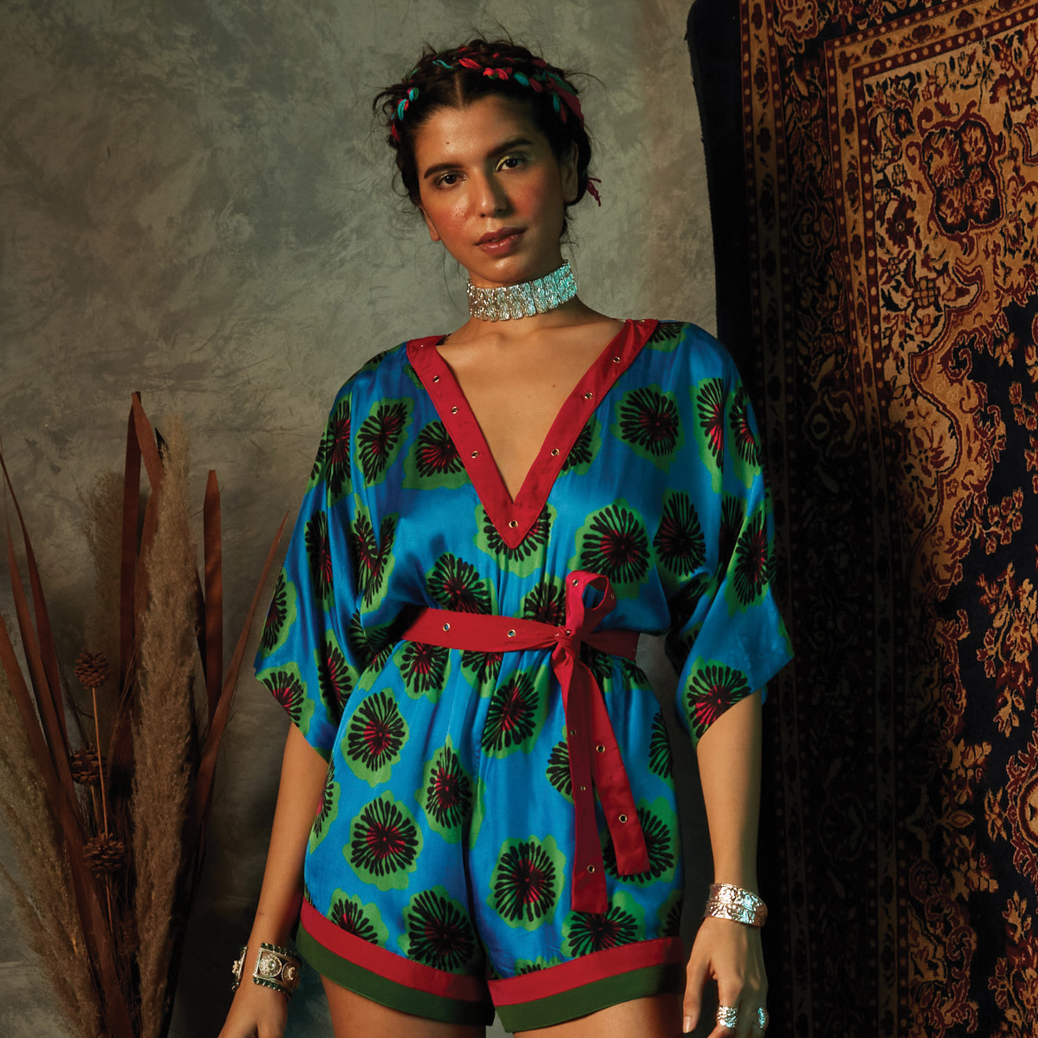 This romper has a royal blue base with a beautiful contrasting print. It features a red deep V neck and a red fabric belt, allowing you to cinch the waist for a flattering silhouette. Style it with statement gold earrings and heels for an evening party.