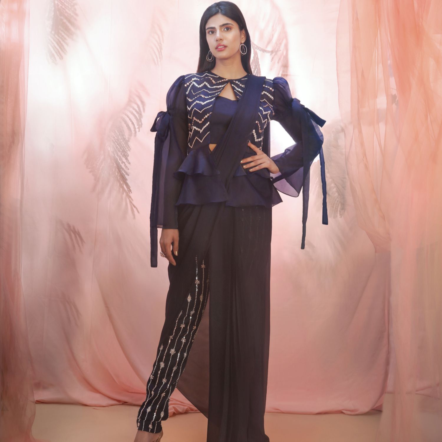 ₹ 38,000 (10% off)This blue chevron embroidered oversize jacket is paired flawlessly with a plain bustier and embroidered pant saree. The chevron embroidery on the jacket exudes contemporary charm, while the plain bustier adds a touch of simplicity. Complete the look with the embroidered pant saree.
