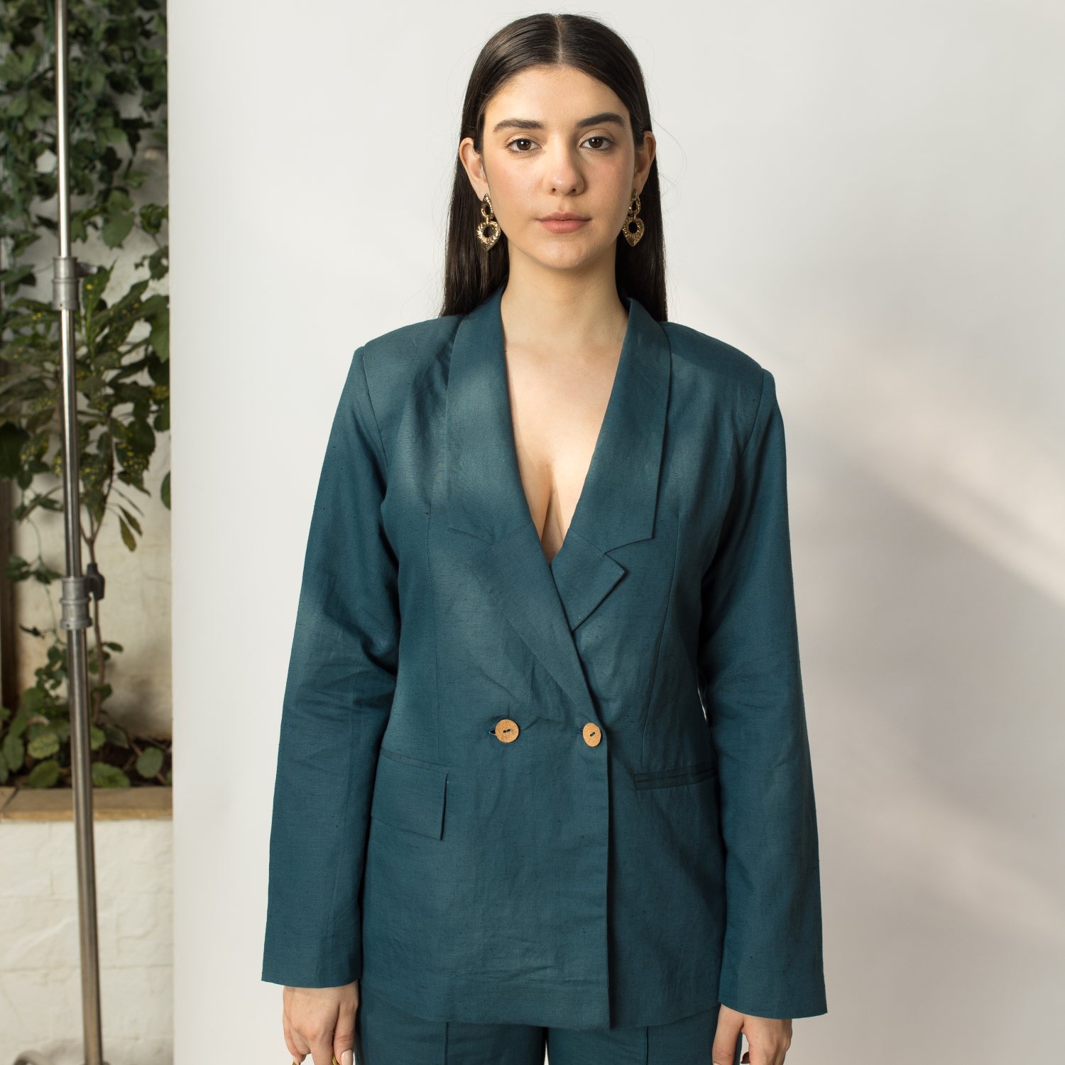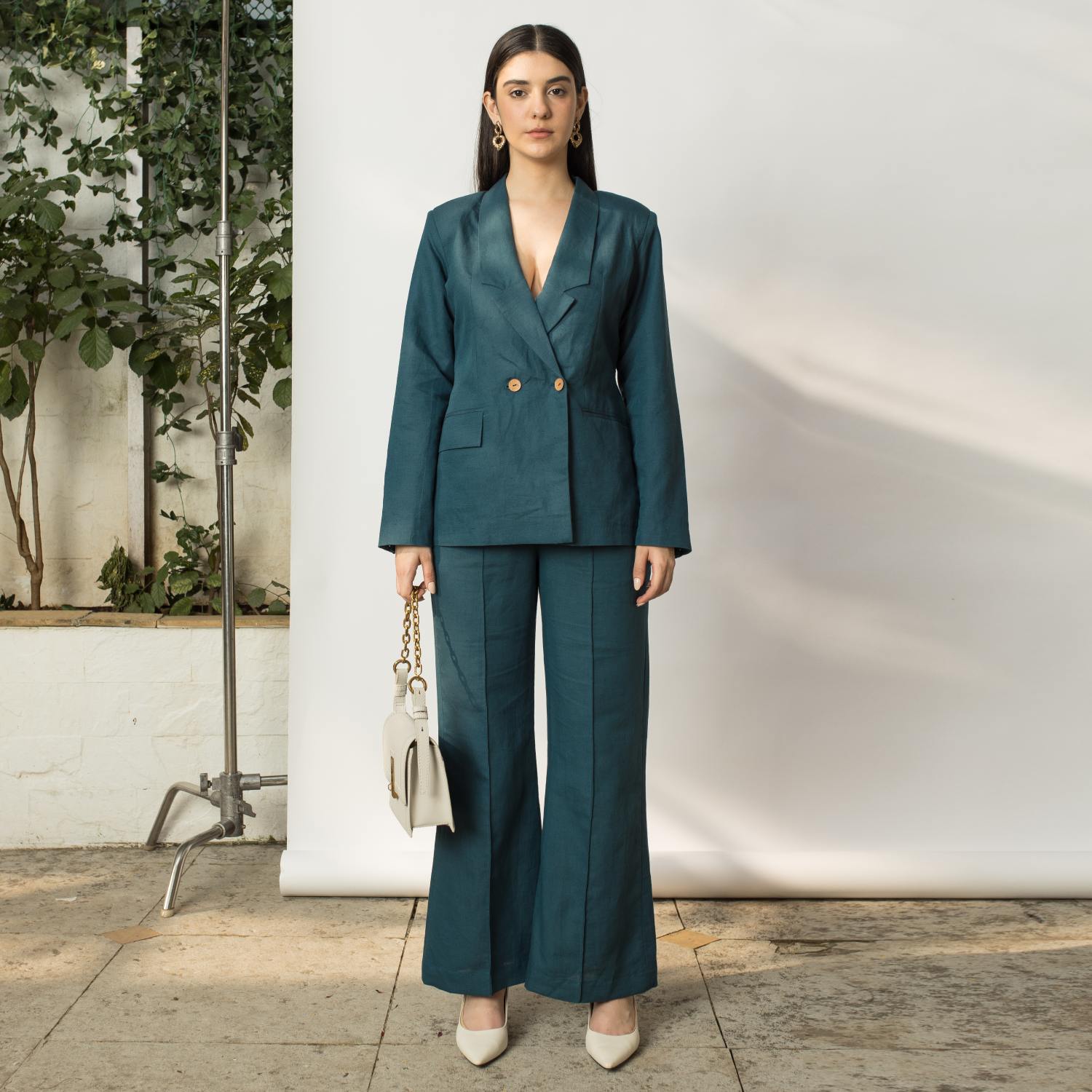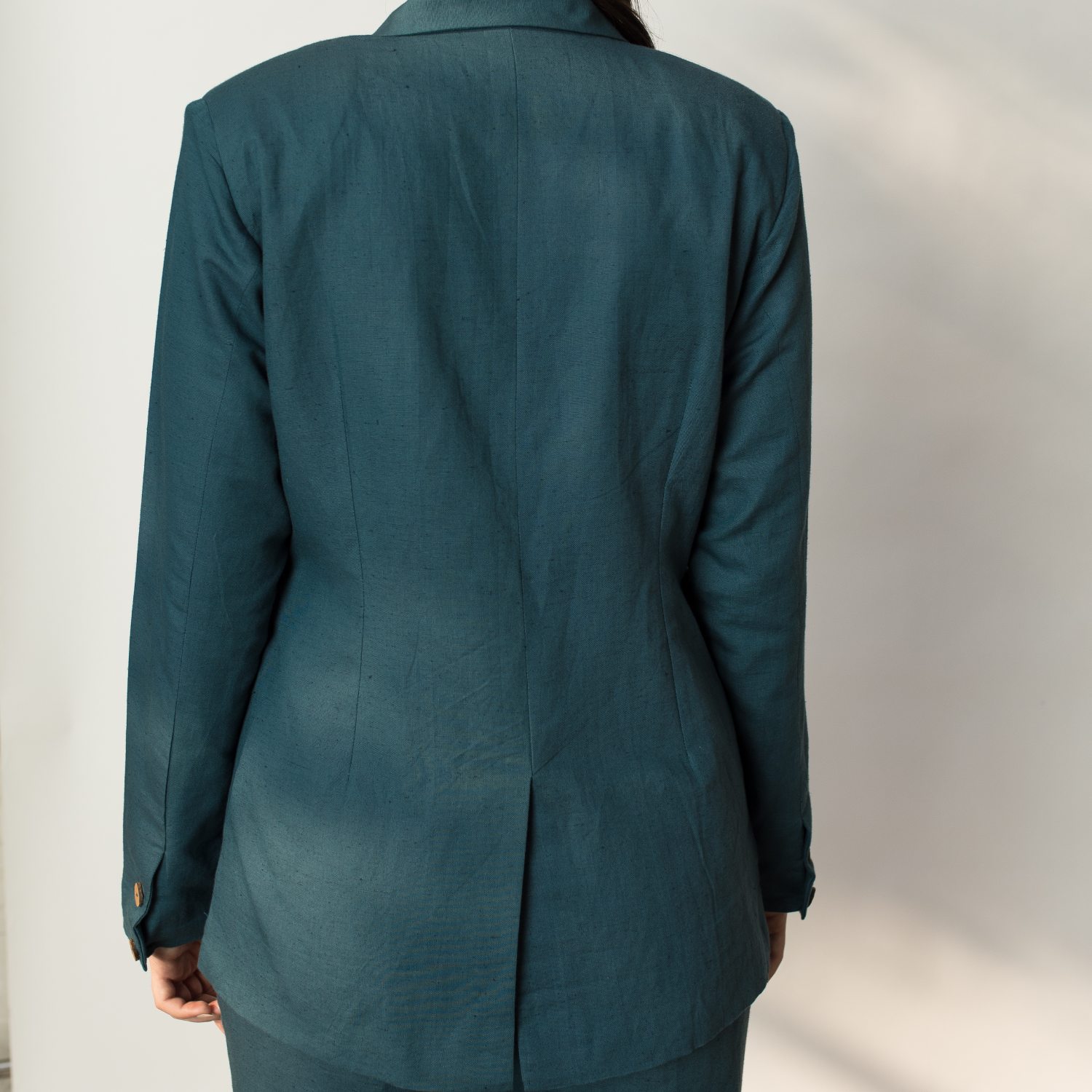 Crafted with precision, this impeccably tailored blazer features subtle waist shaping through front and back darts. Its elongated collar and structured shoulder pads exude sophistication. Finished with buttoned cuffs, flap pockets and a single vent at the back, it pairs seamlessly with the boot-leg pants for a flawless pant suit ensemble.