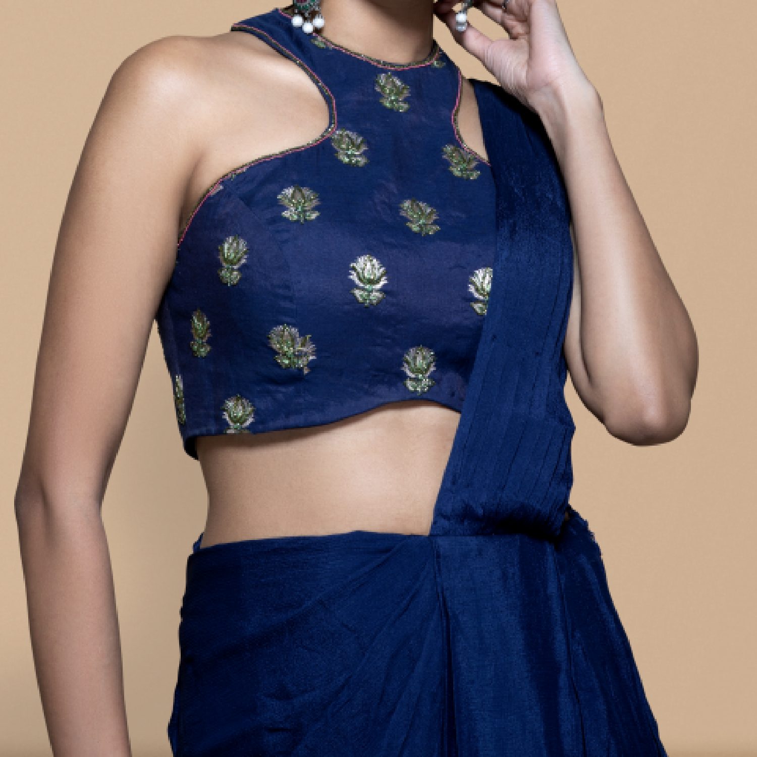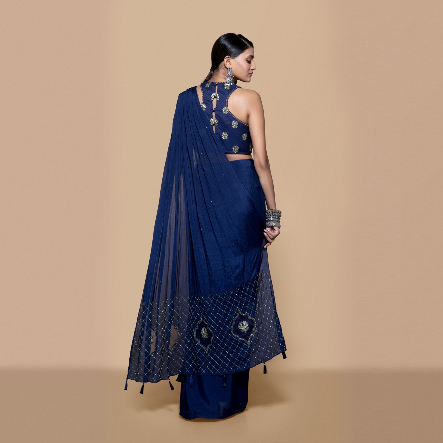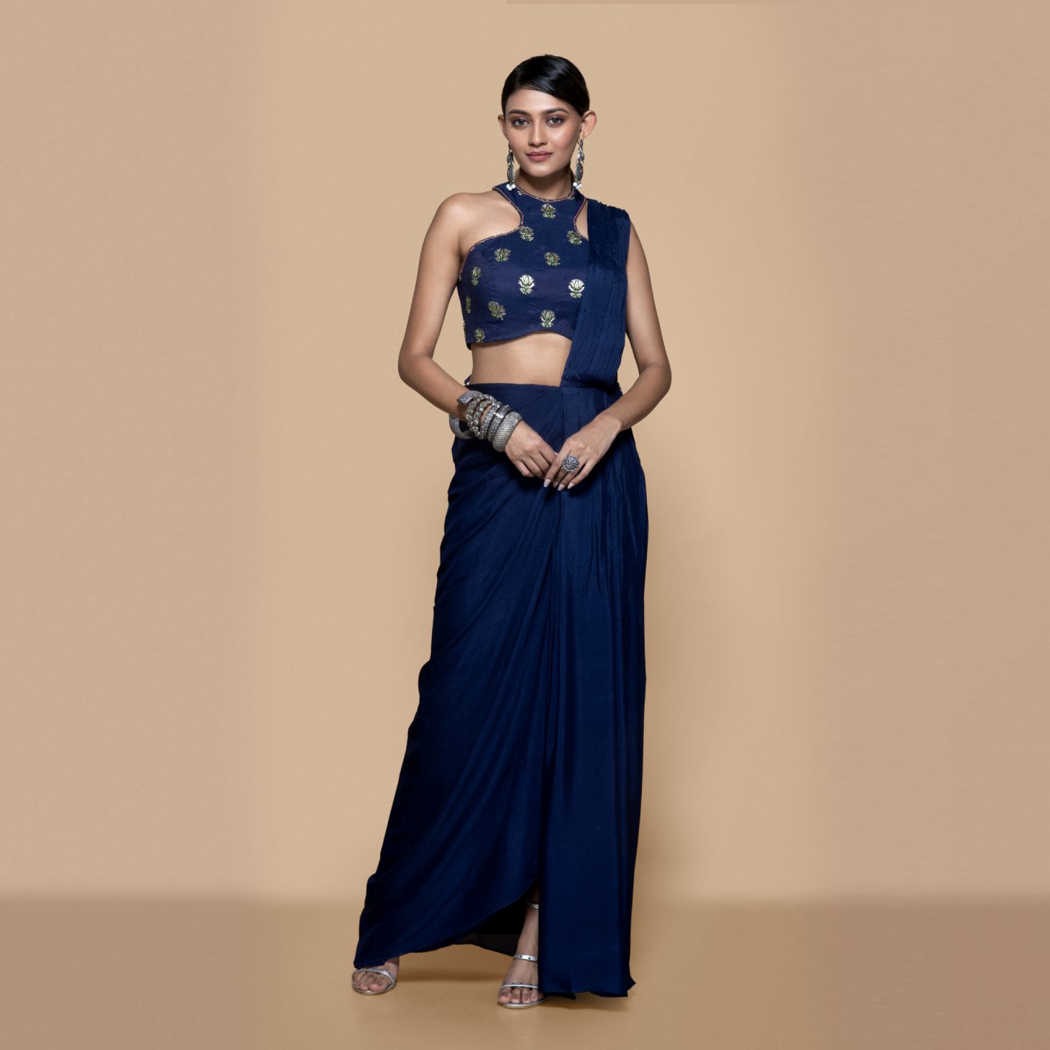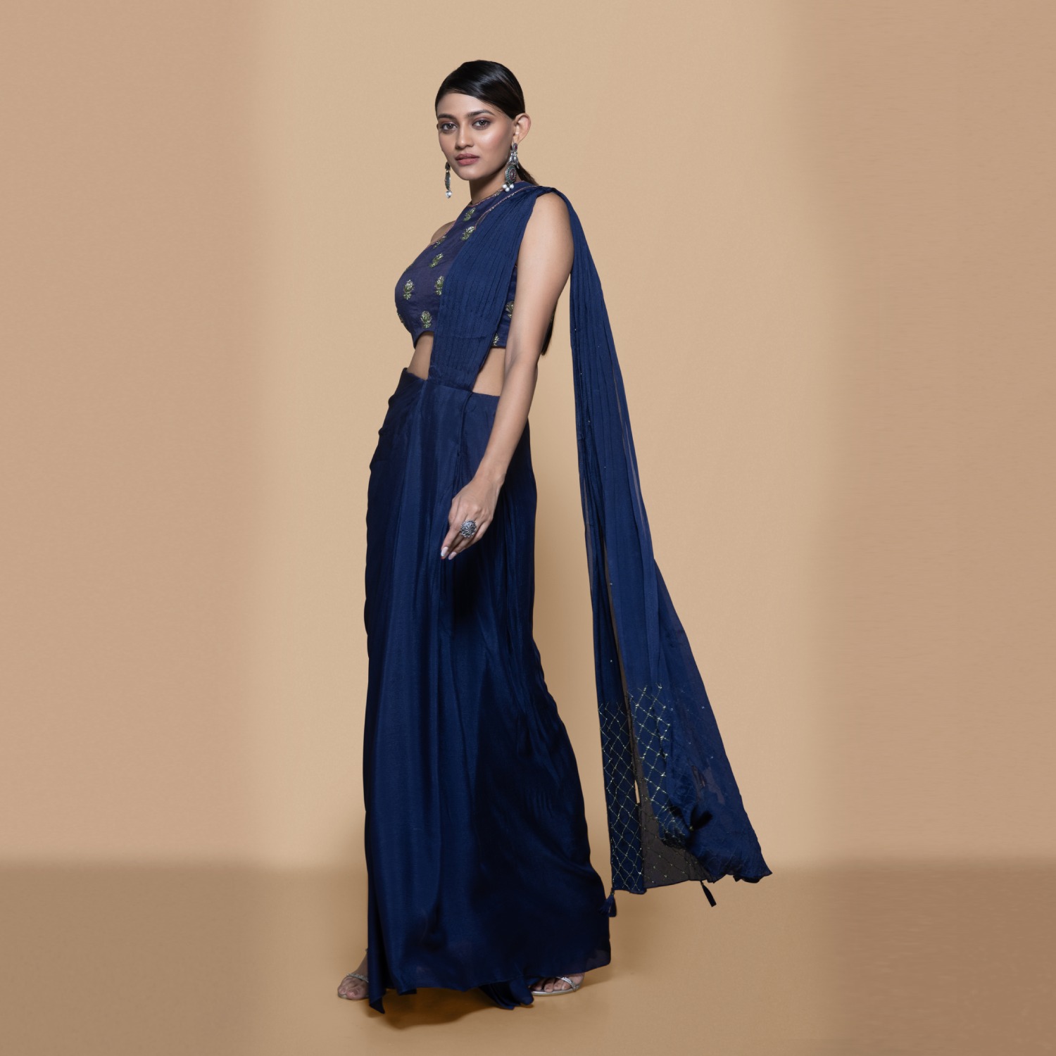 Crafted from a blue chinon chiffon saree with a woven chanderi blouse in a very young and trendy silhouette. Pair it with statement earrings and heels for weddings or festivities.