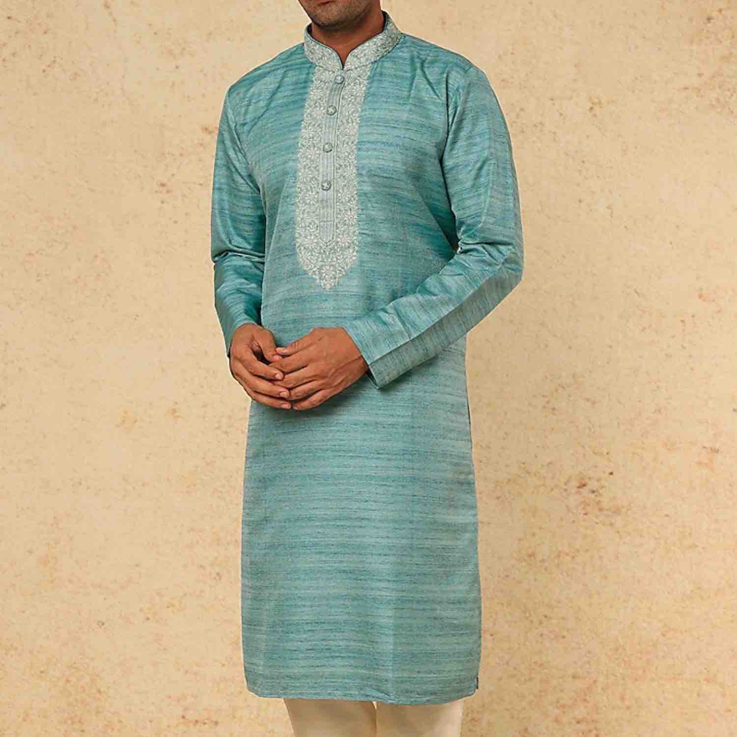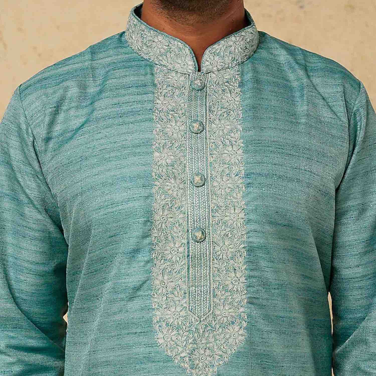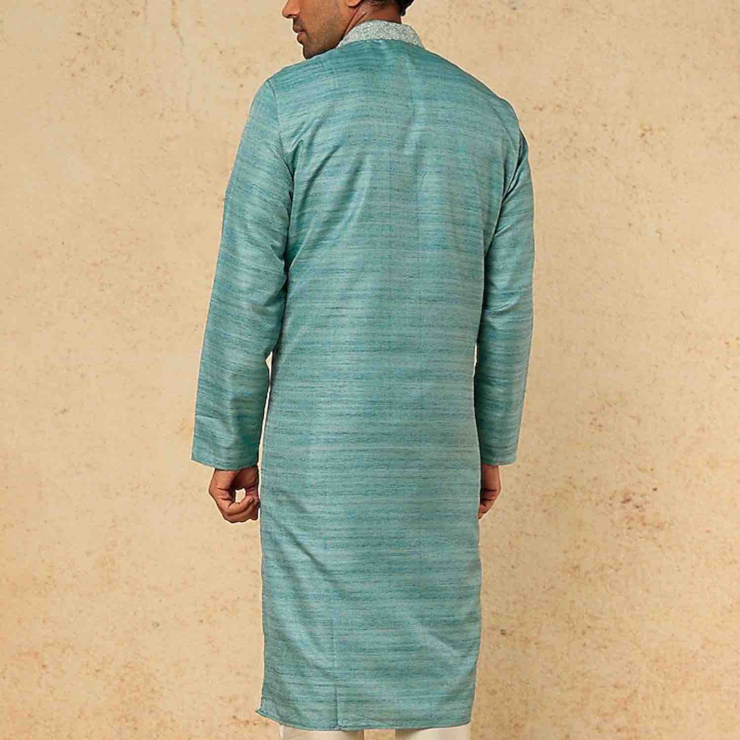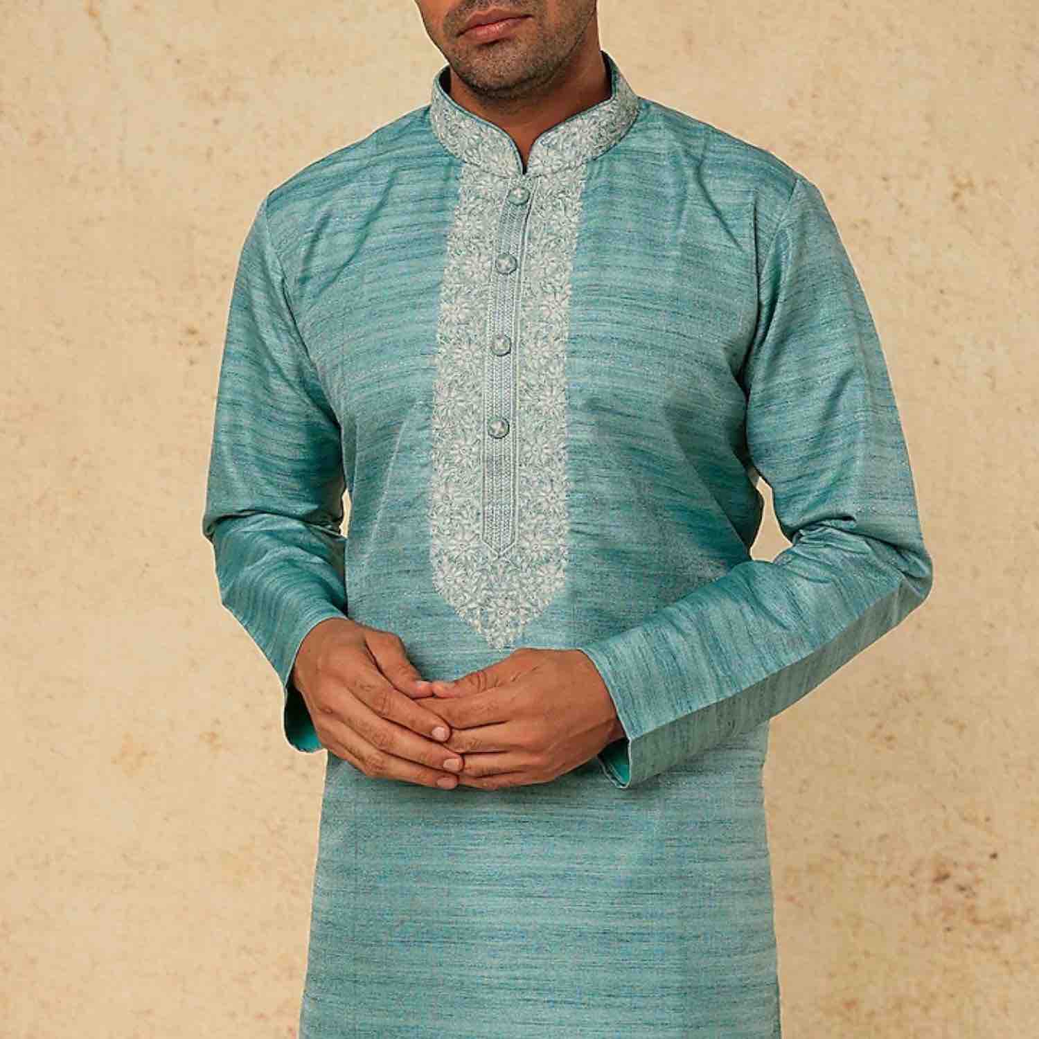 ₹ 12,500 (15% off)Embrace the serenity of this azure blue dupion silk kurta. Enhanced with exquisite thread and pearl embroidery, it exudes elegance and grace. Paired with off-white dupion silk churidar pants, this ensemble combines traditional charm with contemporary style. Make a statement of refined beauty with this stunning outfit.