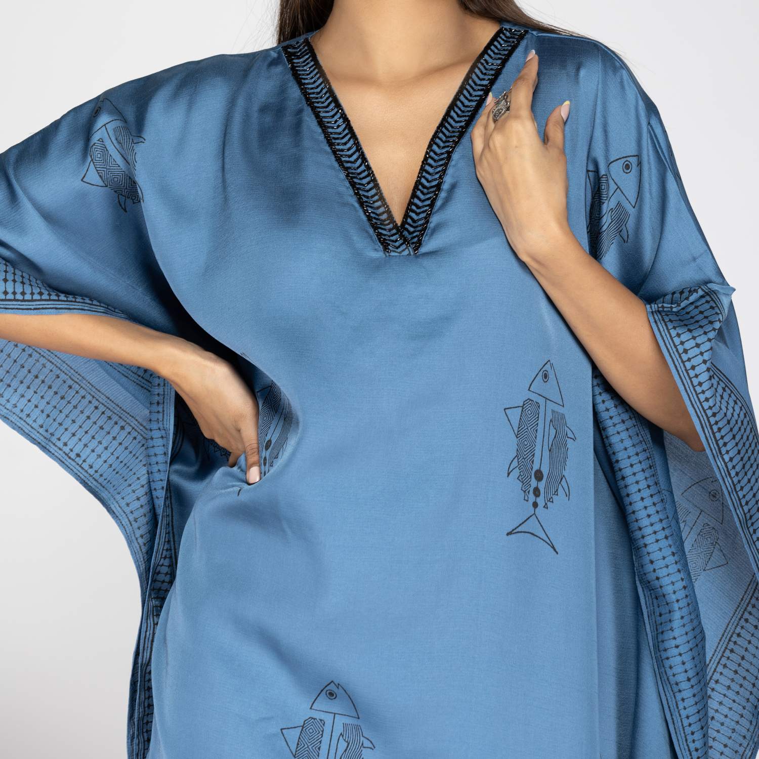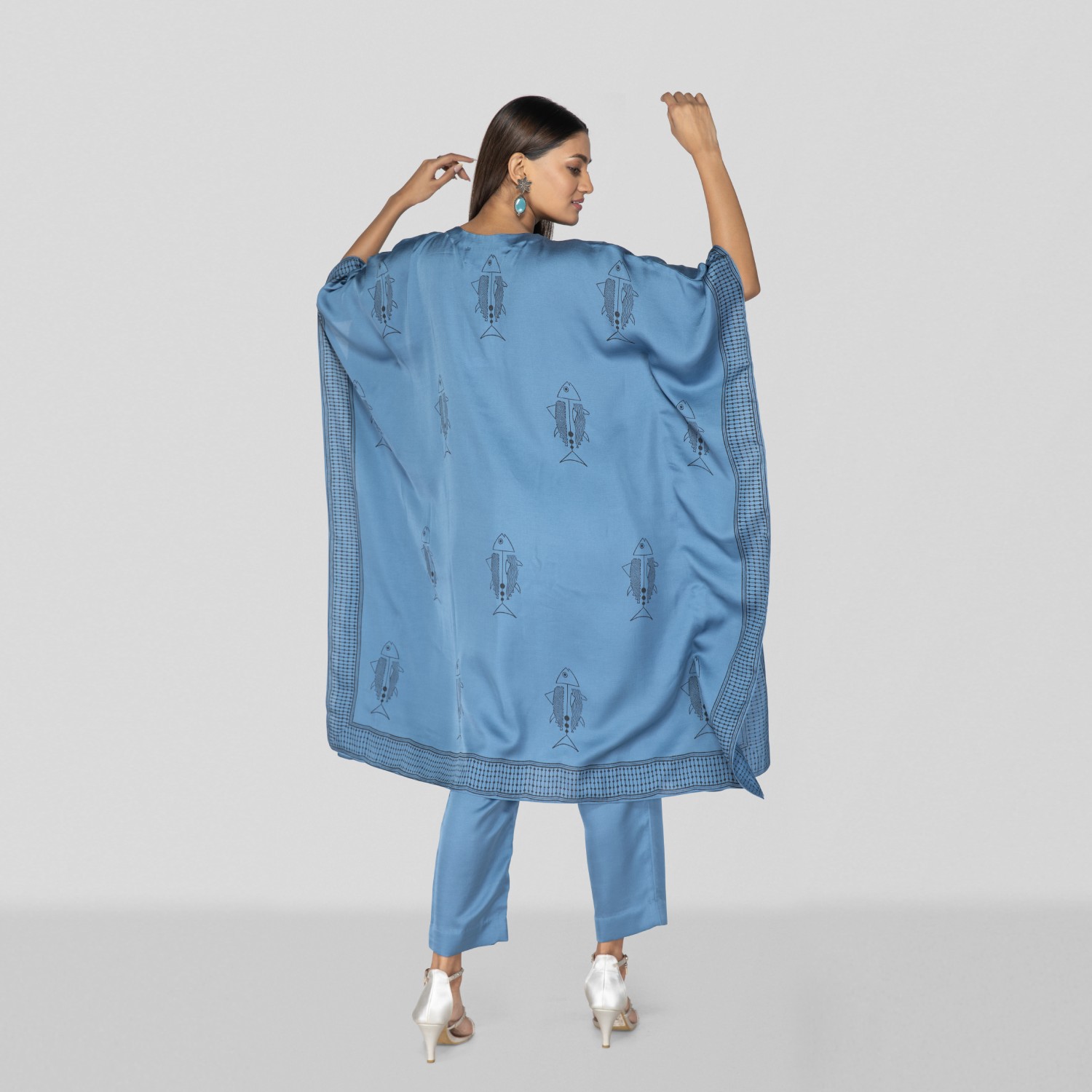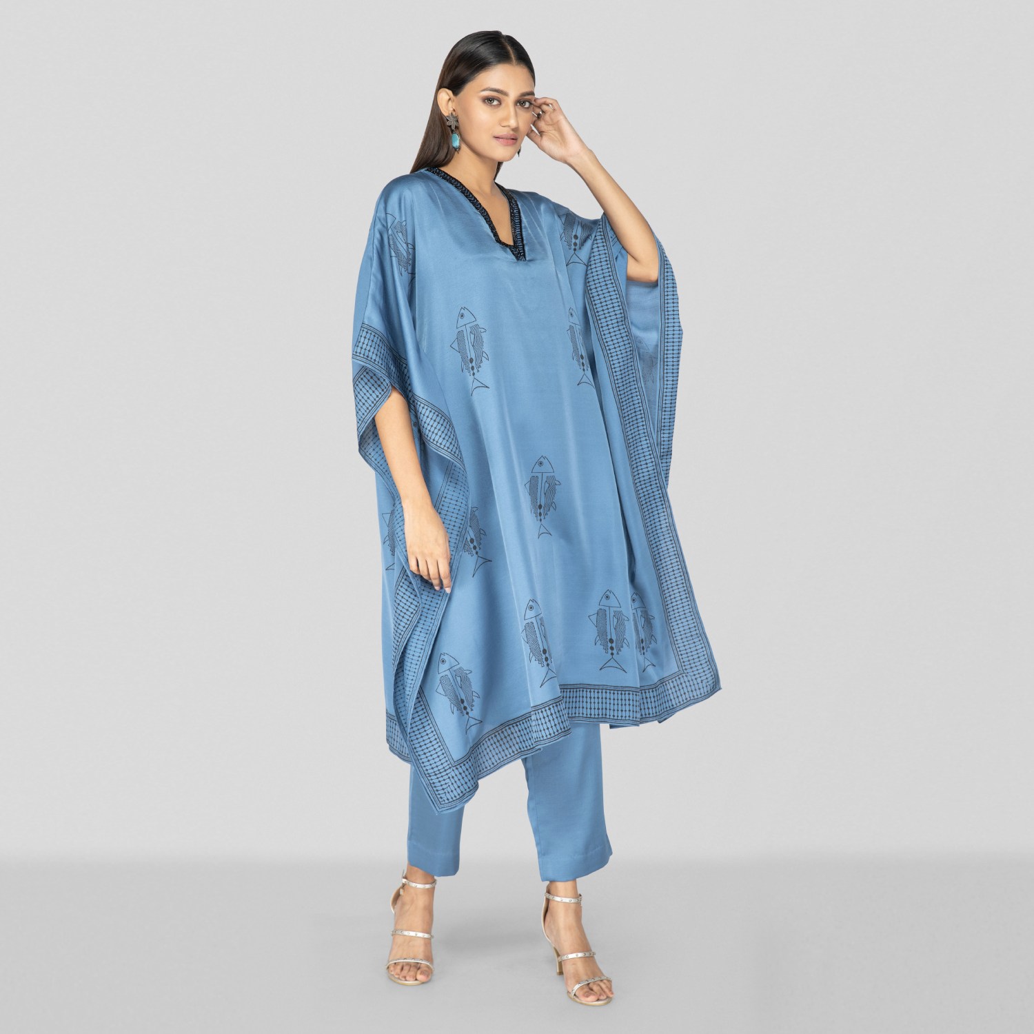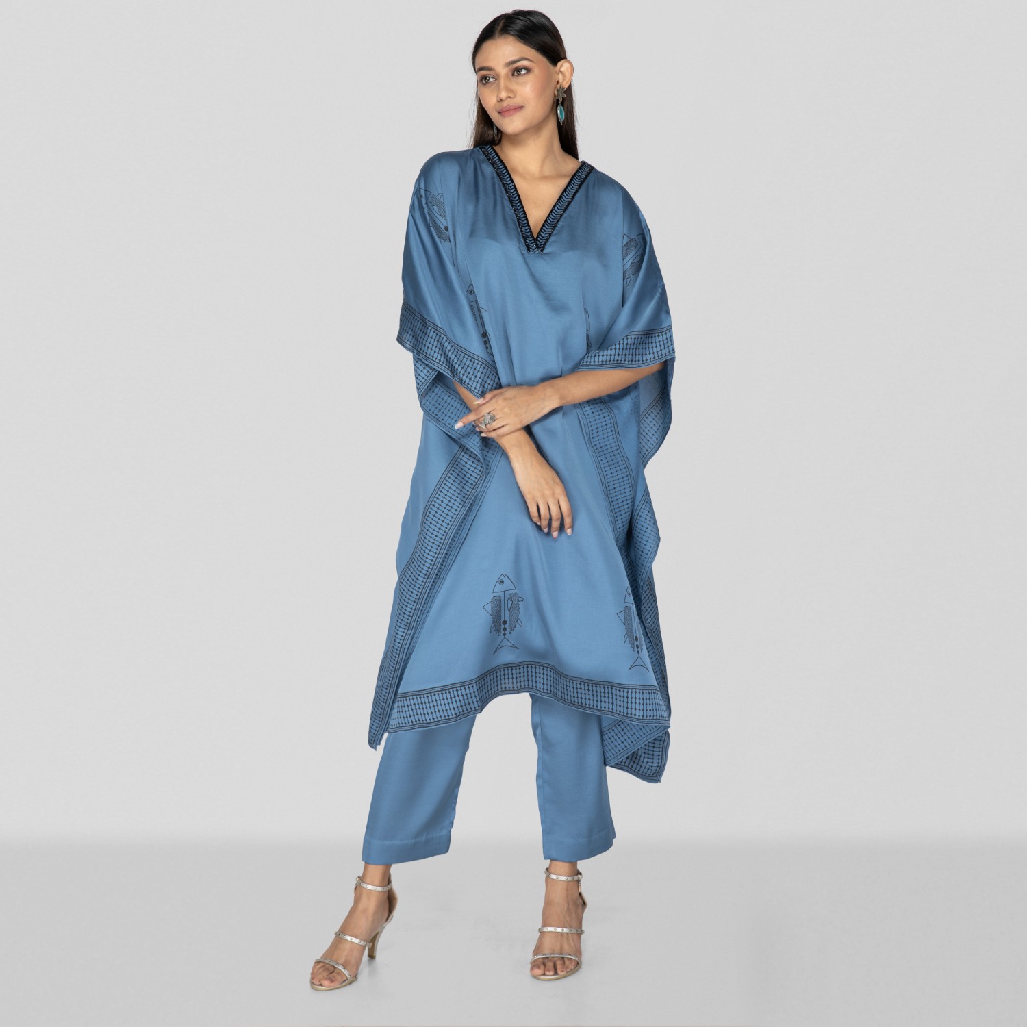 Experience elegance in the porcelain rose hand block printed kaftan set, featuring an abstract fish motif and delicate neck embroidery. This graceful ensemble is thoughtfully paired with a matching pant, creating a cohesive and eye-catching look. Ideal for those who appreciate the fusion of traditional craftsmanship and modern design, it offers a distinctive appearance for special occasions.
