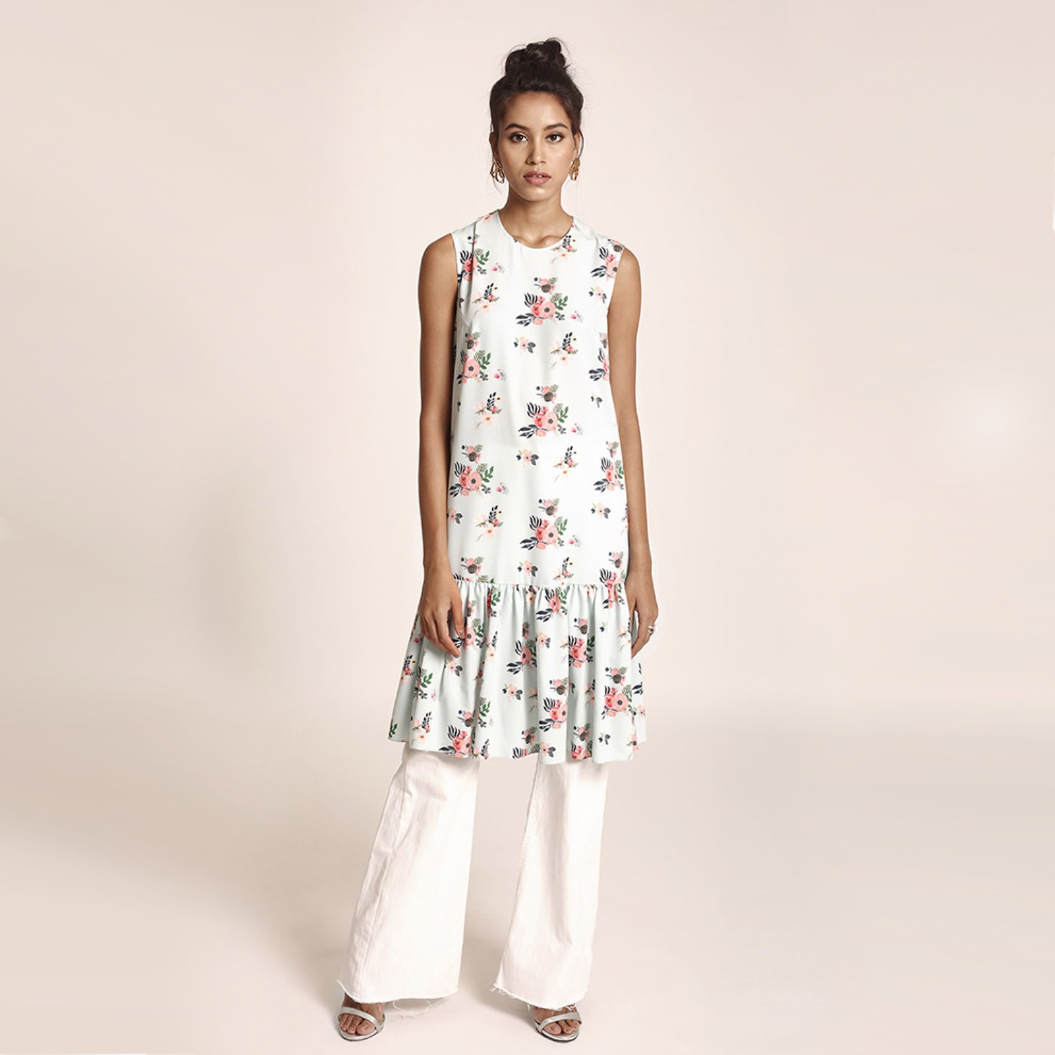 This beautiful tunic features a pink print on a blue base. It's crafted from high-quality art crepe fabric and has a sleeveless design with a frill hem, adding playfulness and femininity to the outfit. Pair it with bold earrings and heels for a dressy day soiree.