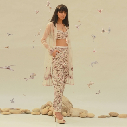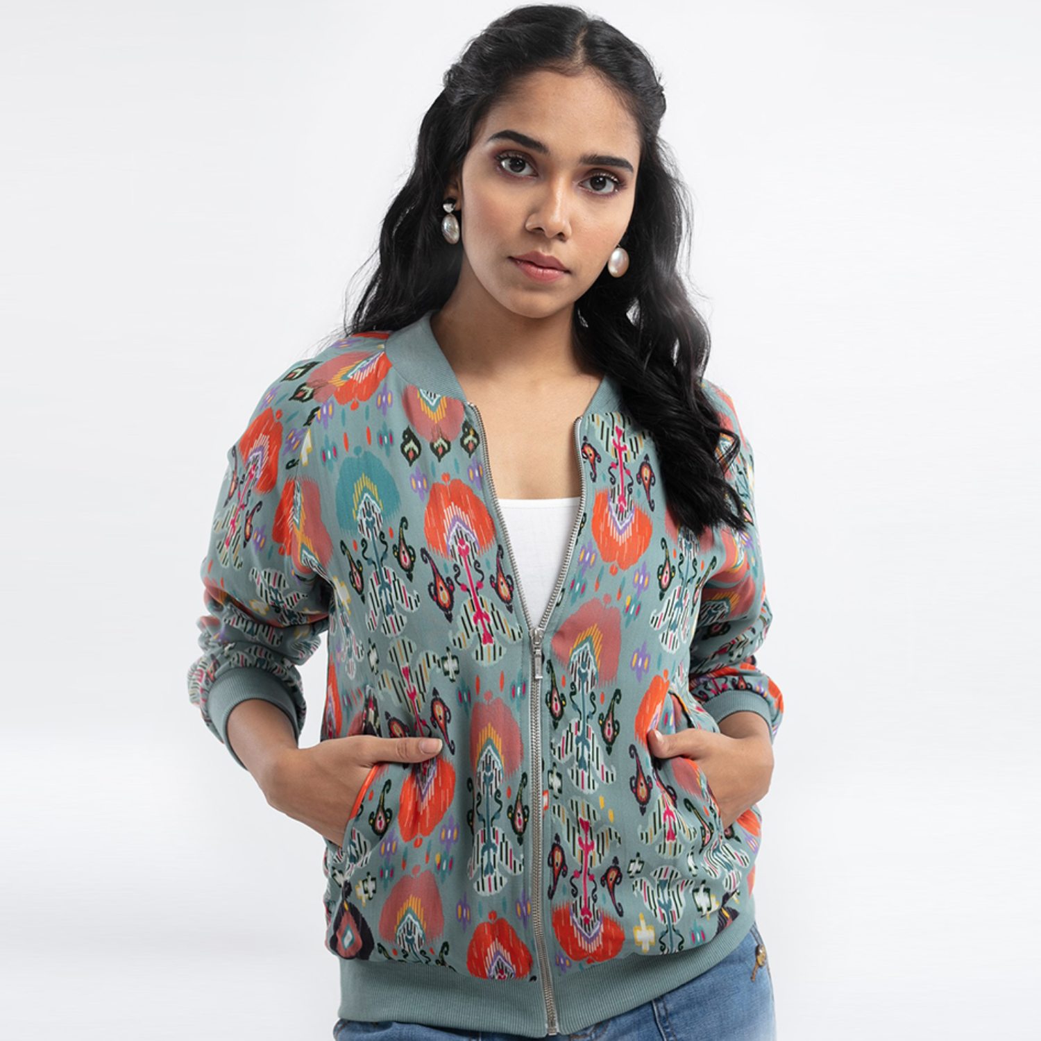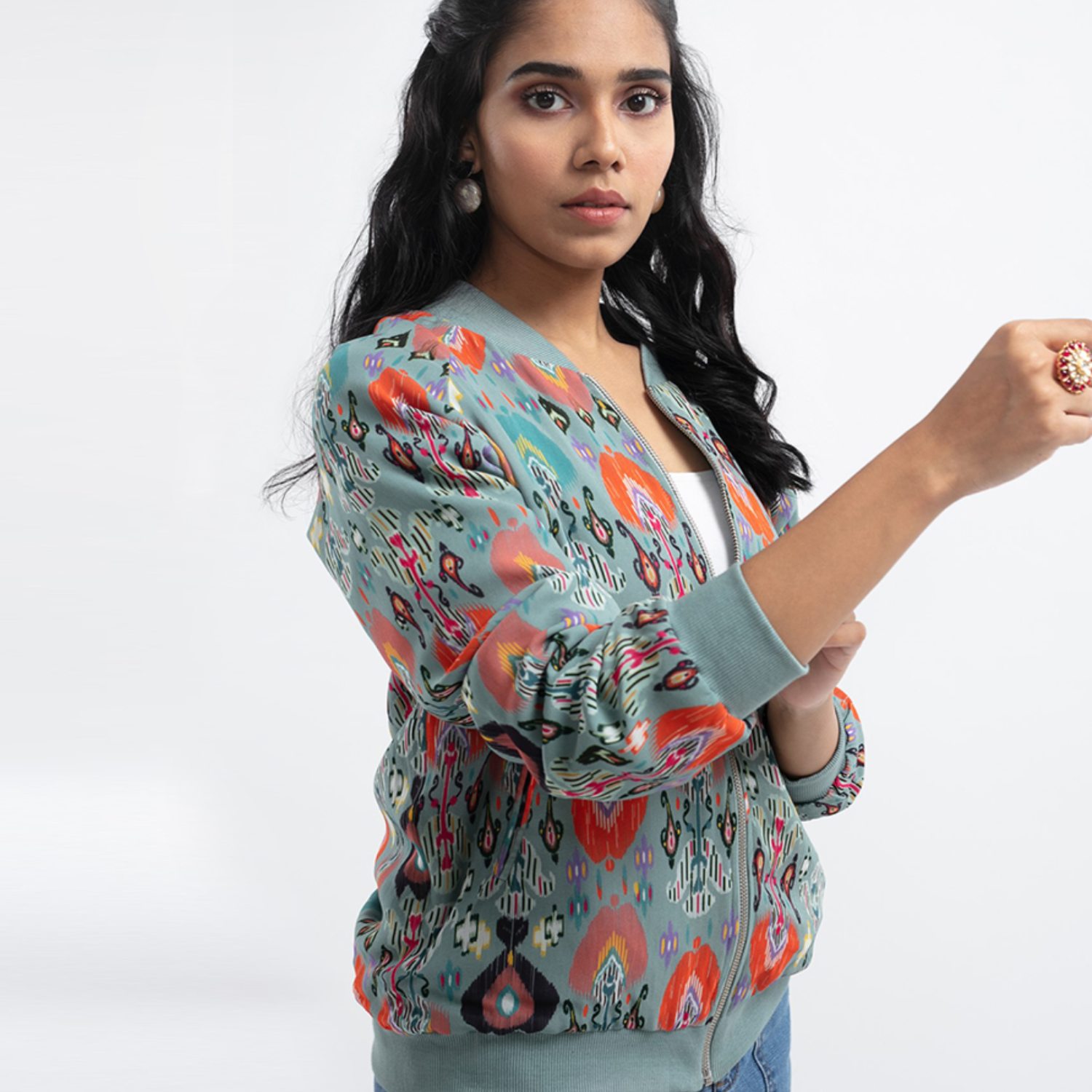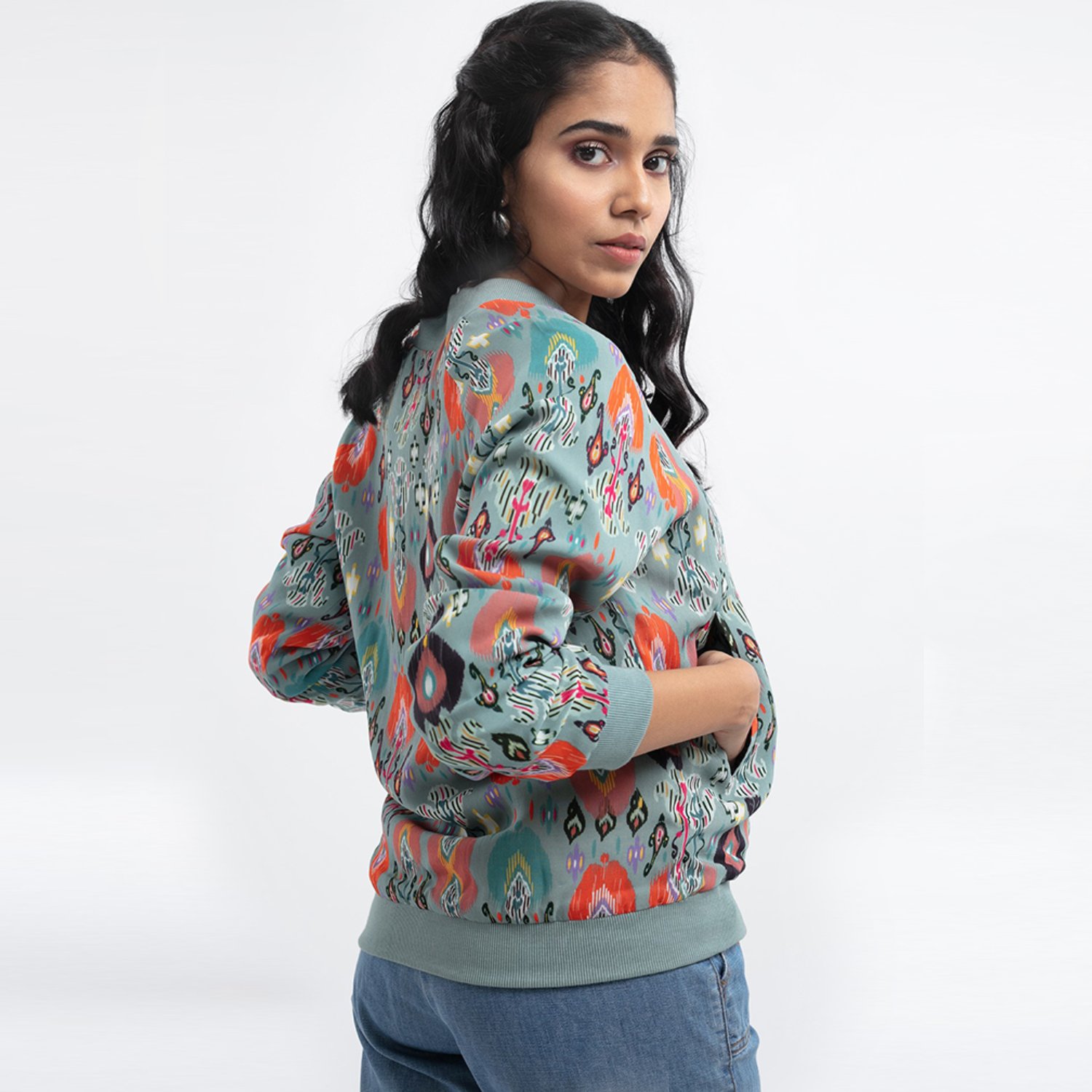 This beautiful bomber jacket is crafted from high-quality georgette fabric. It features a blue shade, full sleeves, and a pink ikat love print, offering a beautiful contrast and elegance to the look. It provides a relaxed fit, ensuring comfort and ease of movement. Pair it with cargo pants and sneakers for a dressy day out.