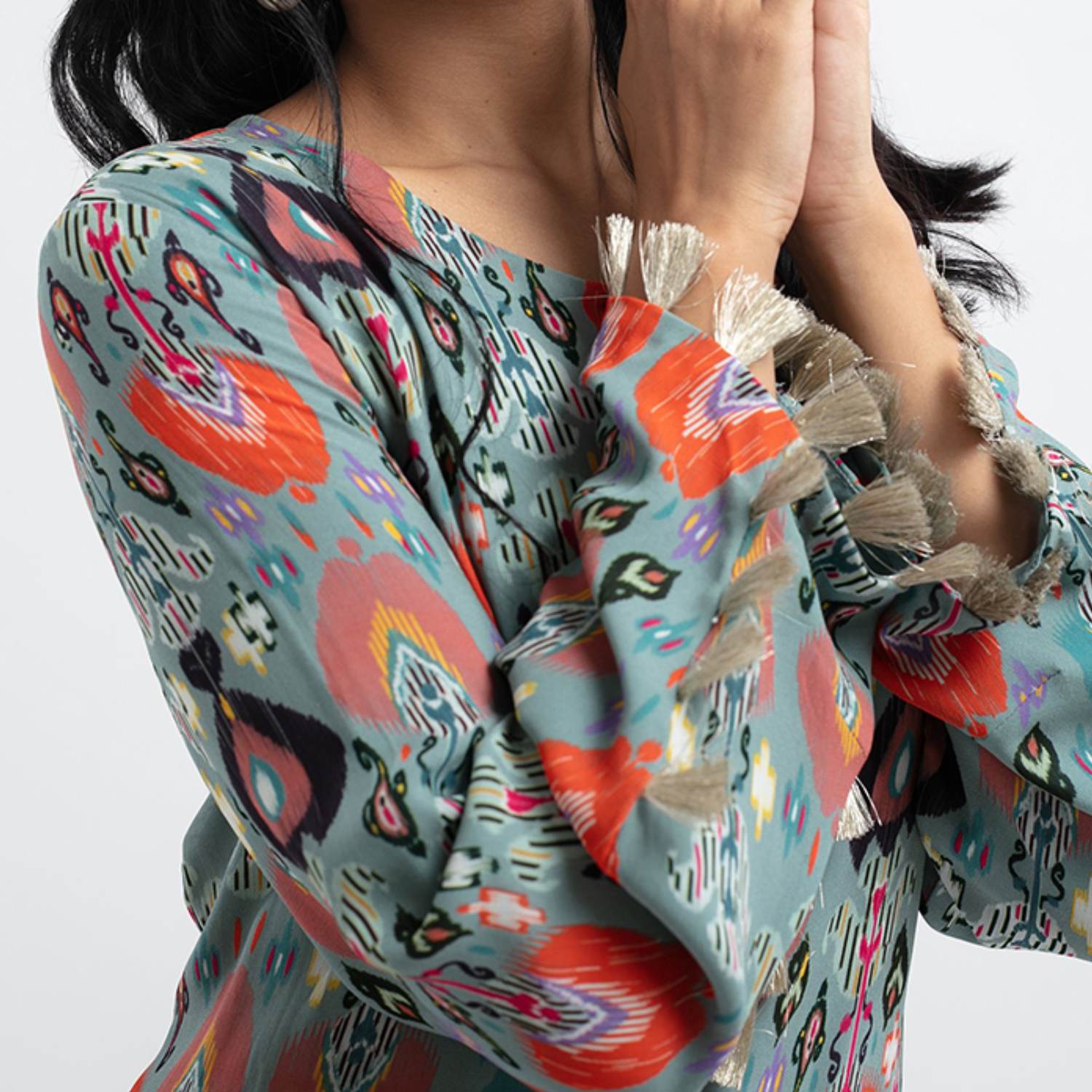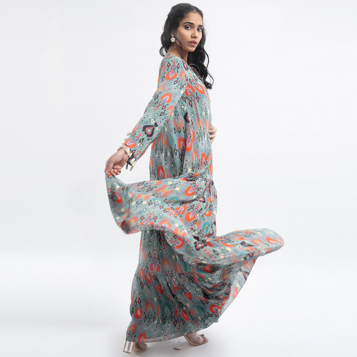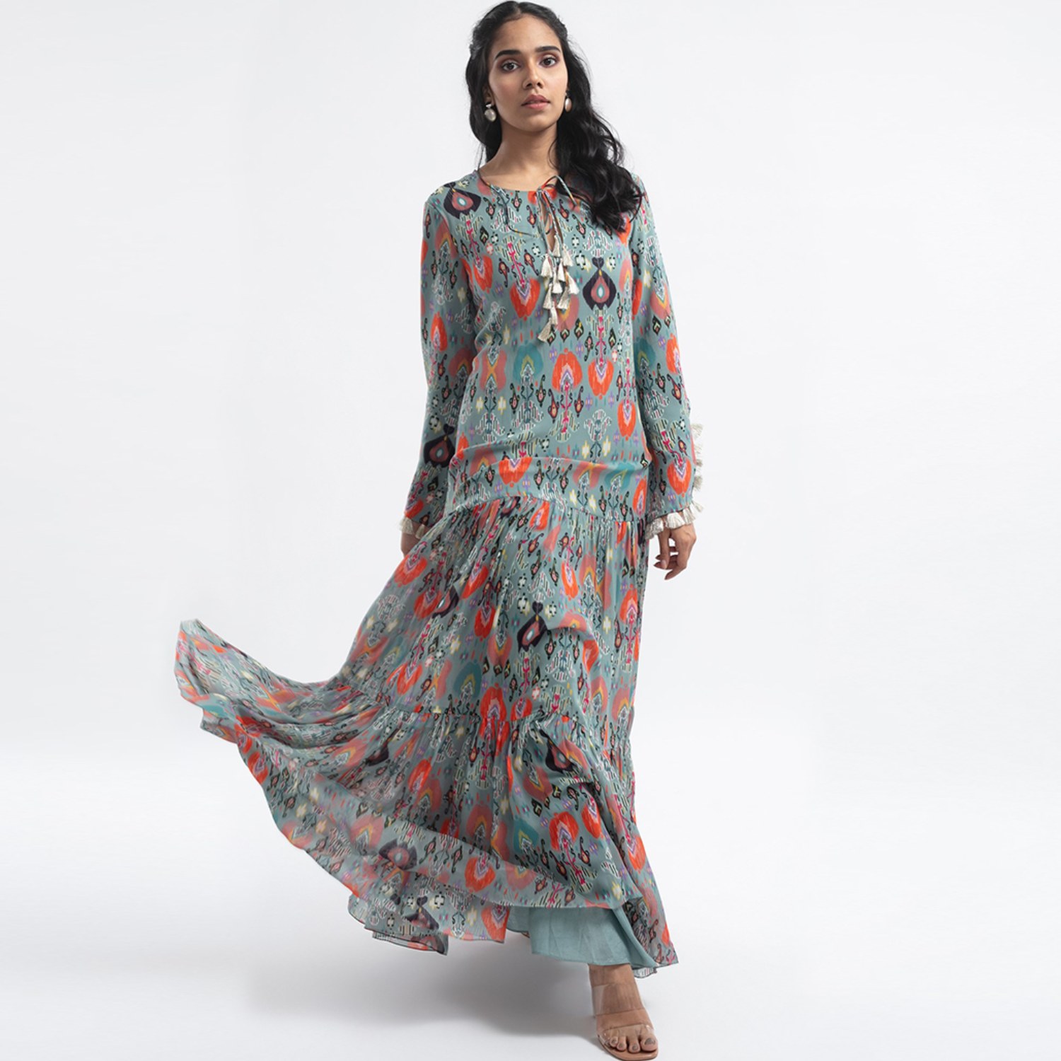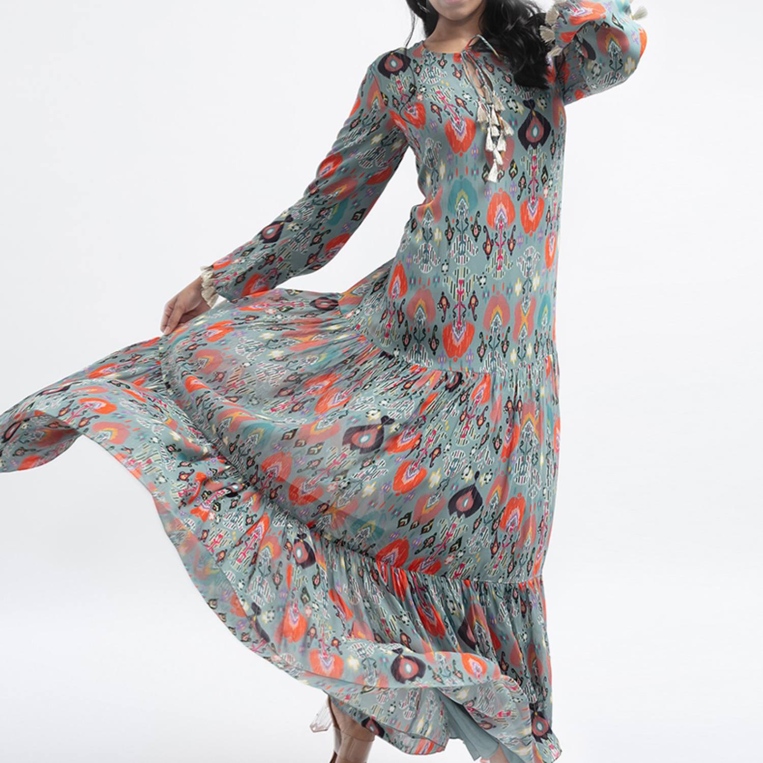 This beautiful dress is made of art georgette, offering a light and flowing texture. It features a blue shade, an ikat garden print, and a long length. The dress is designed with a tiered structure, adding playfulness to the design. It offers a relaxed fit, ensuring comfort and ease of movement. Style it with statement earrings and a sling bag for a dressy day event.
