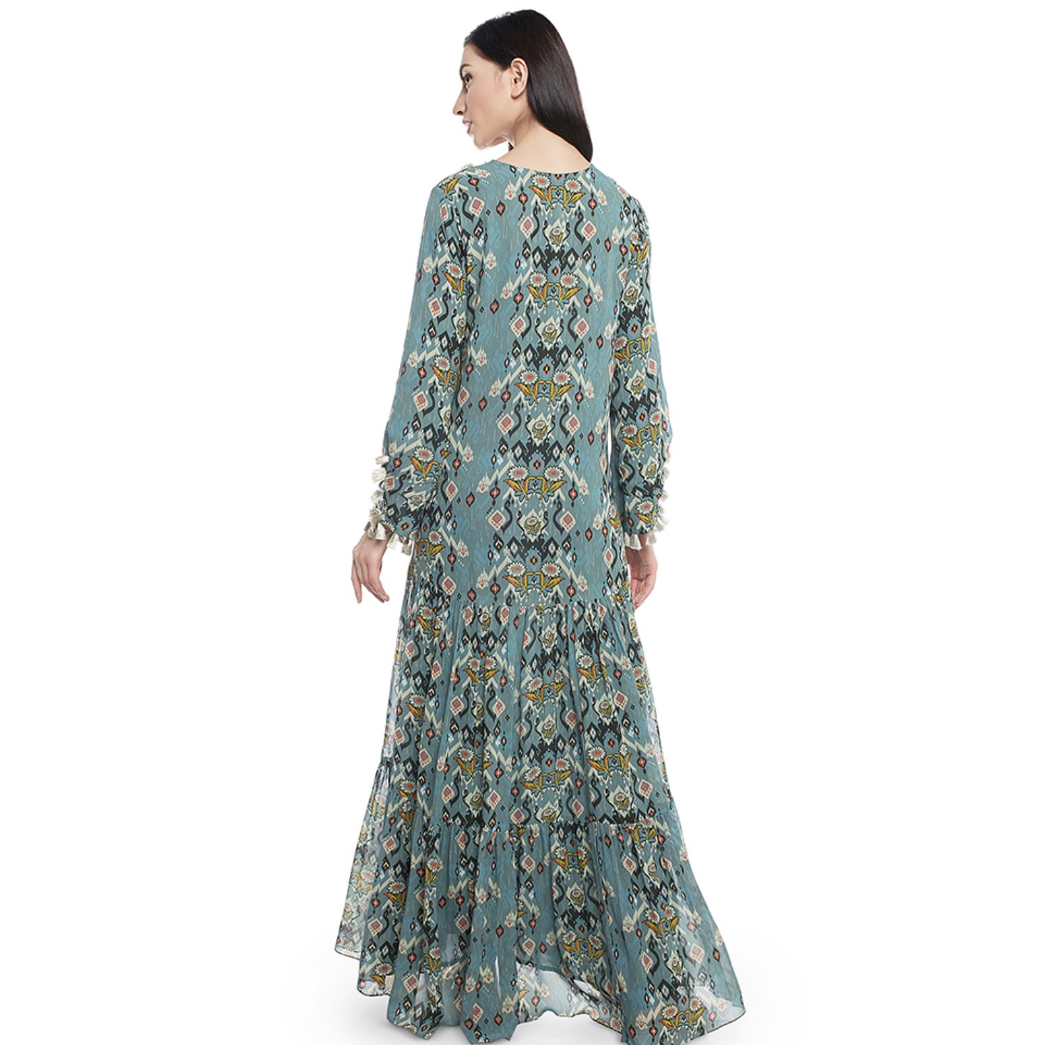 Crafted from high-quality georgette fabric, this dress has a blue shade. It features an embroidered yoke, a tiered design and tassel detailing, adding playfulness to the look. Pair it with minimal jewellery and heels for a dressy event.