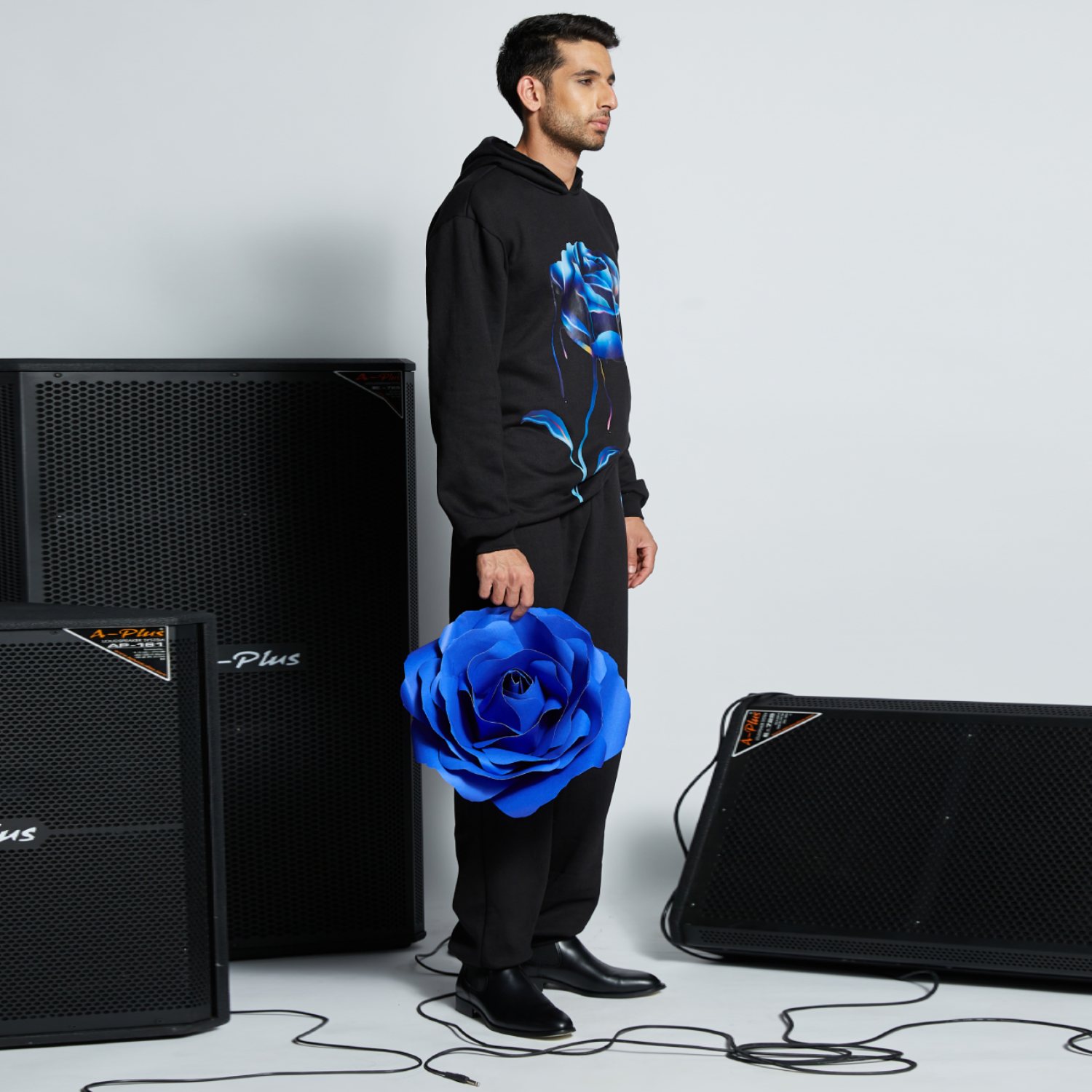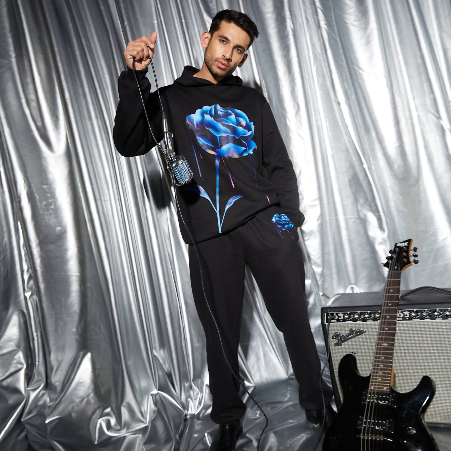 Revamp your loungewear with our relaxed joggers, boasting an elasticated waistband and practical front pockets for added convenience. The front showcases a striking blue rose graphic print, while the ribbed bottom hem adds a touch of style. These joggers effortlessly combine comfort and trend, making them perfect for a laid-back and fashionable ensemble.