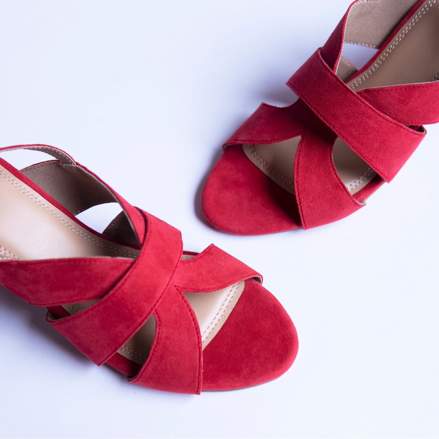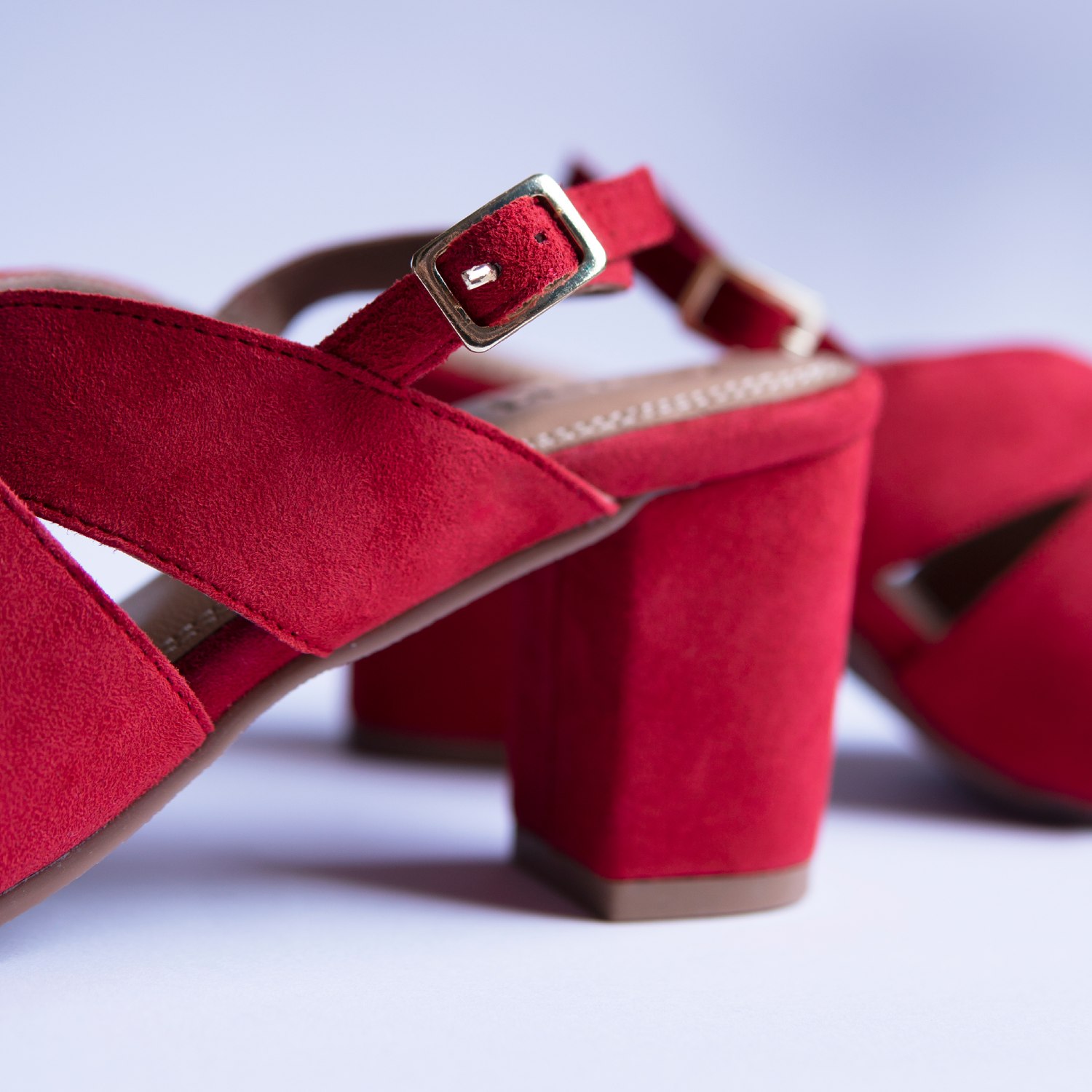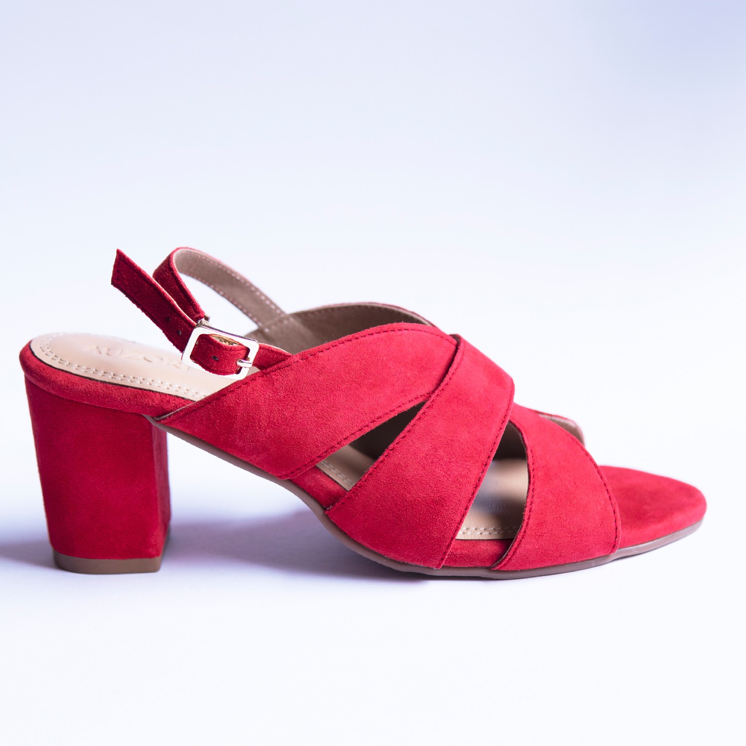 These beautiful heels are crafted from luxurious suede leather. They come in a vibrant red and can add a pop of color to any outfit. They feature a comfortable back strap for added support and style. Pair them with a monochromatic outfit for a day or night event.