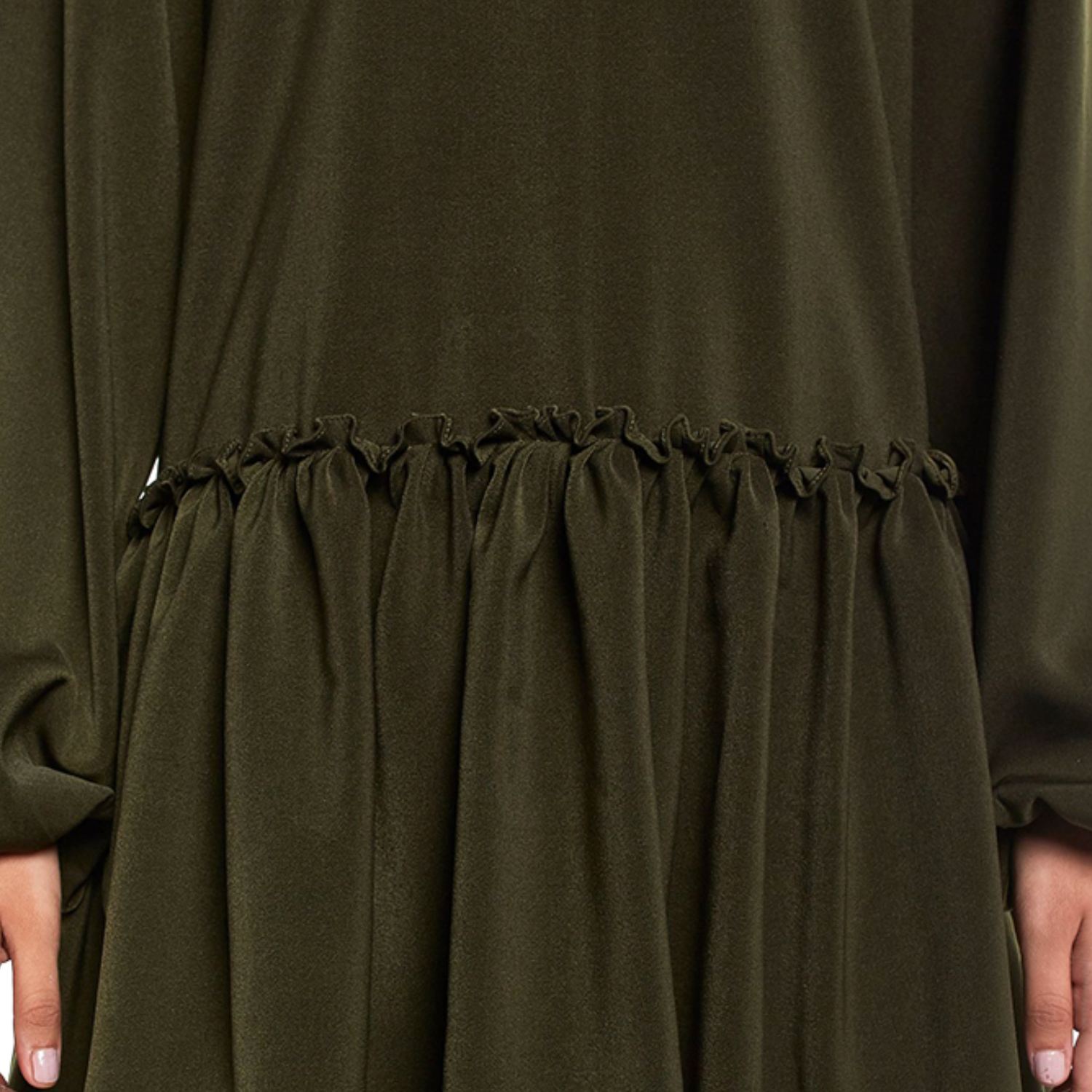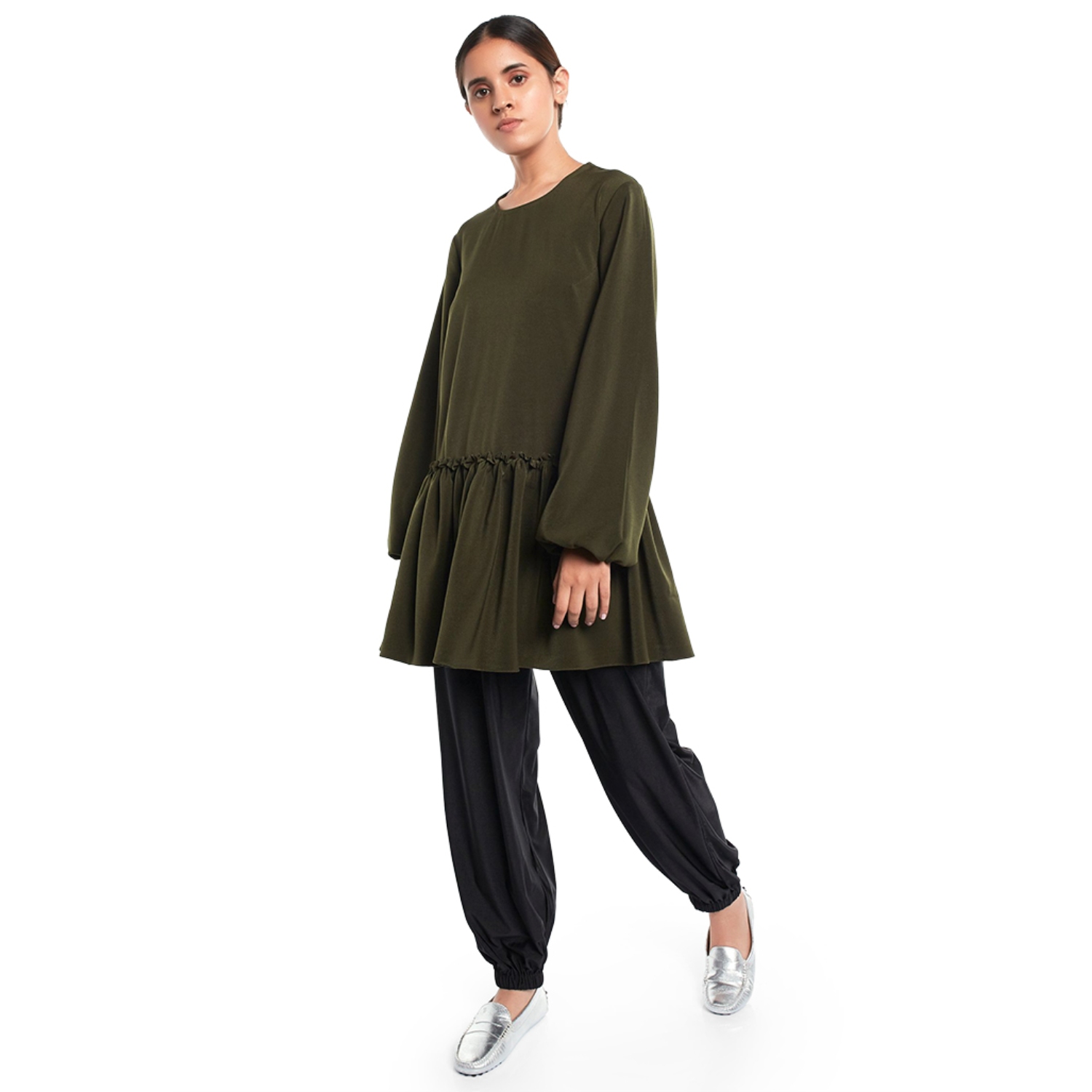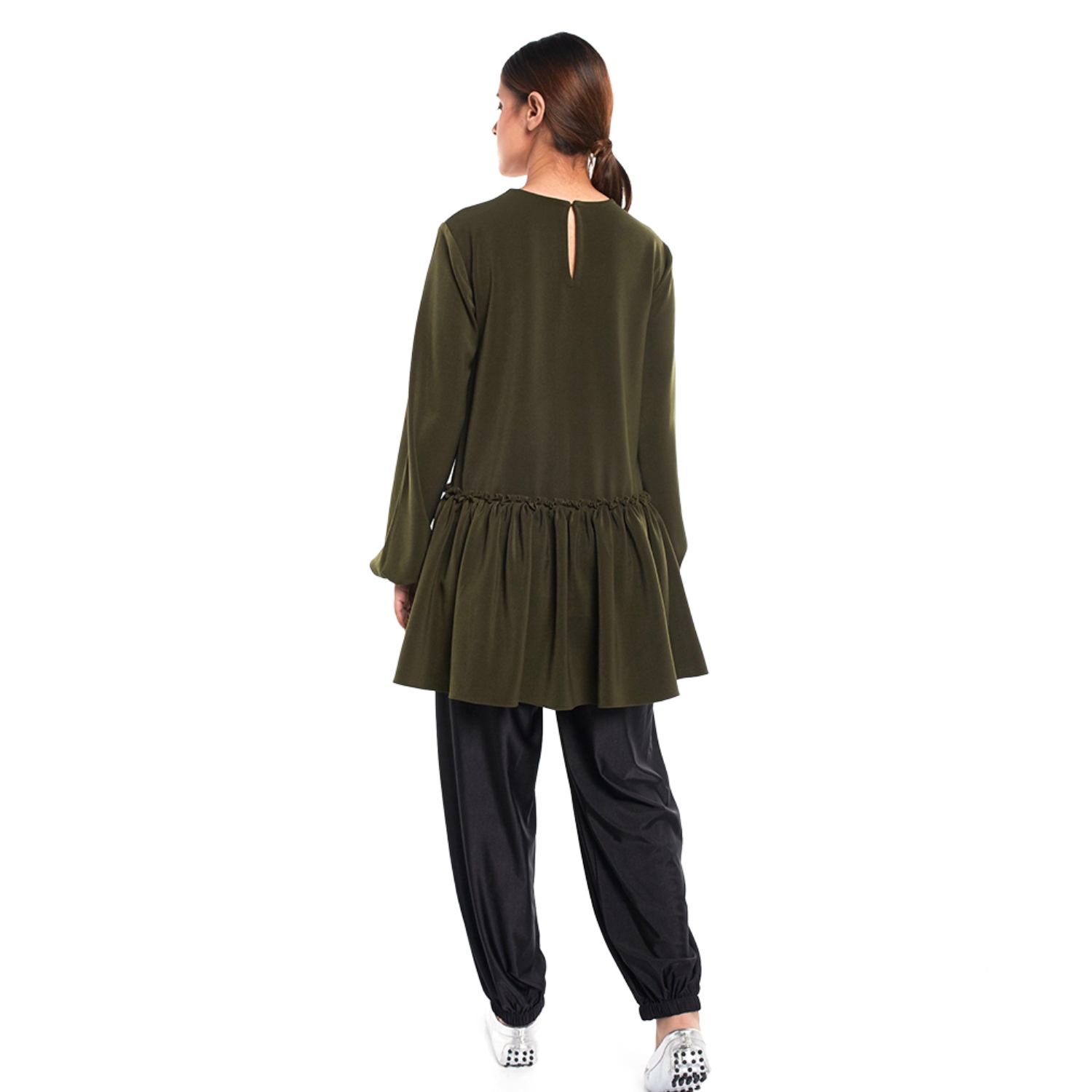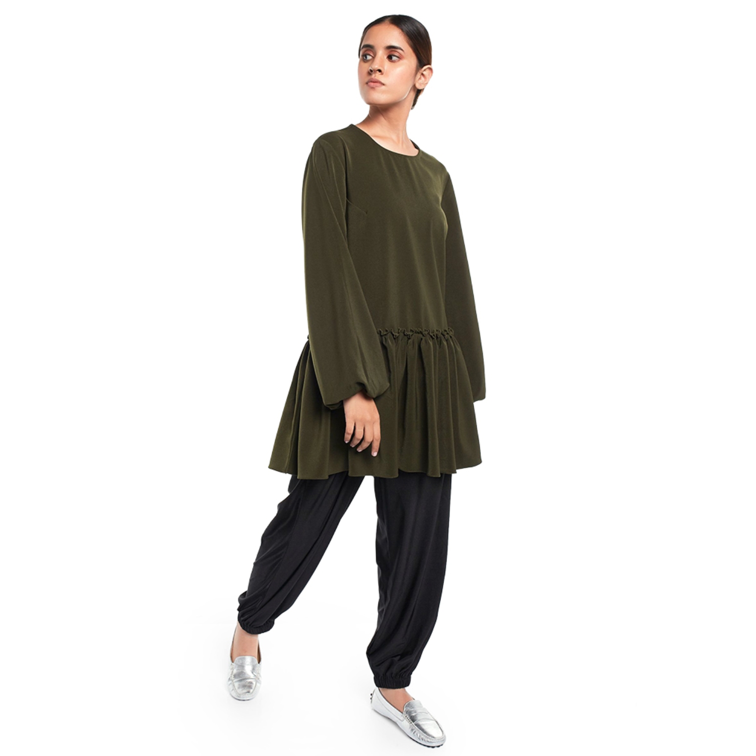 The bottle green frill hem tunic is a blend of sophistication and style. Crafted from georgette fabric, it features a chic frill hem, adding a touch of flair. The rich bottle green color enhances its elegant appeal, making it a versatile and fashionable choice for various occasions, combining timeless grace with modern trends.