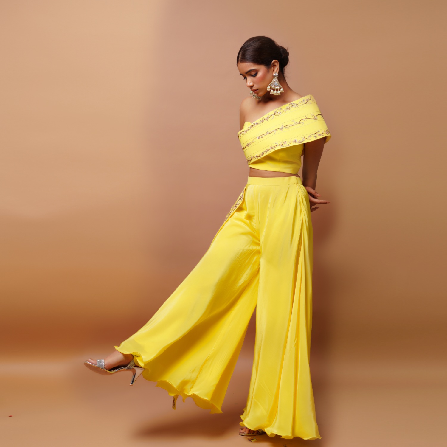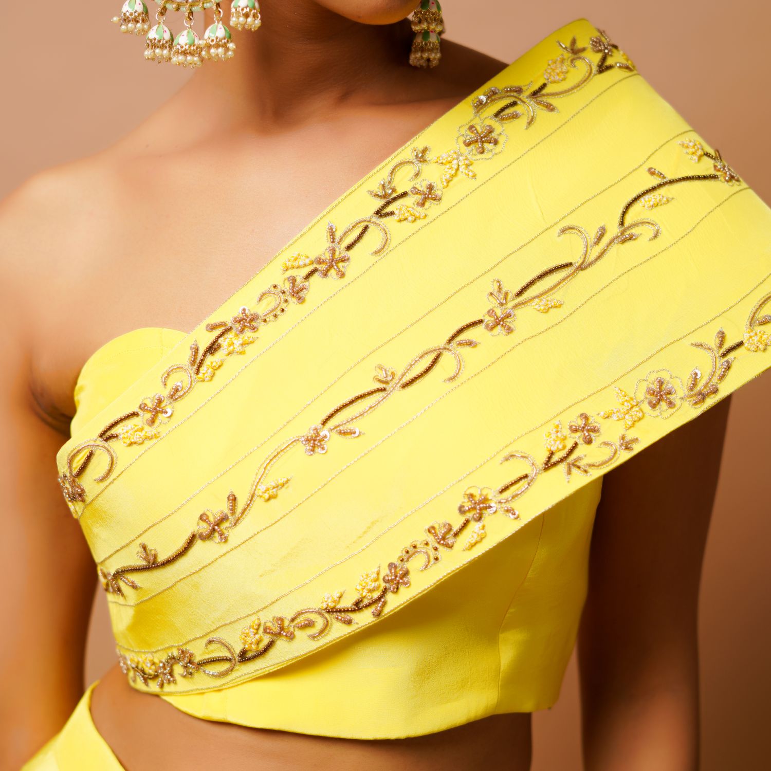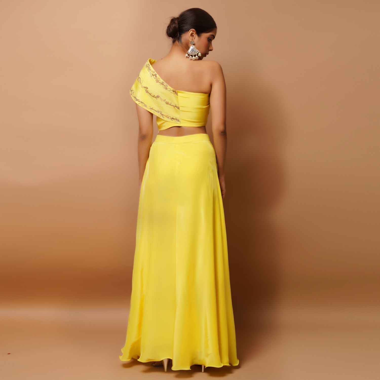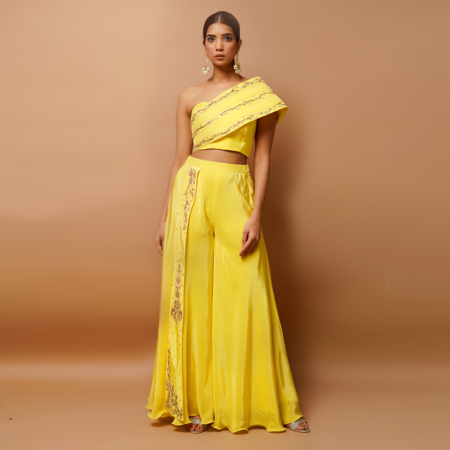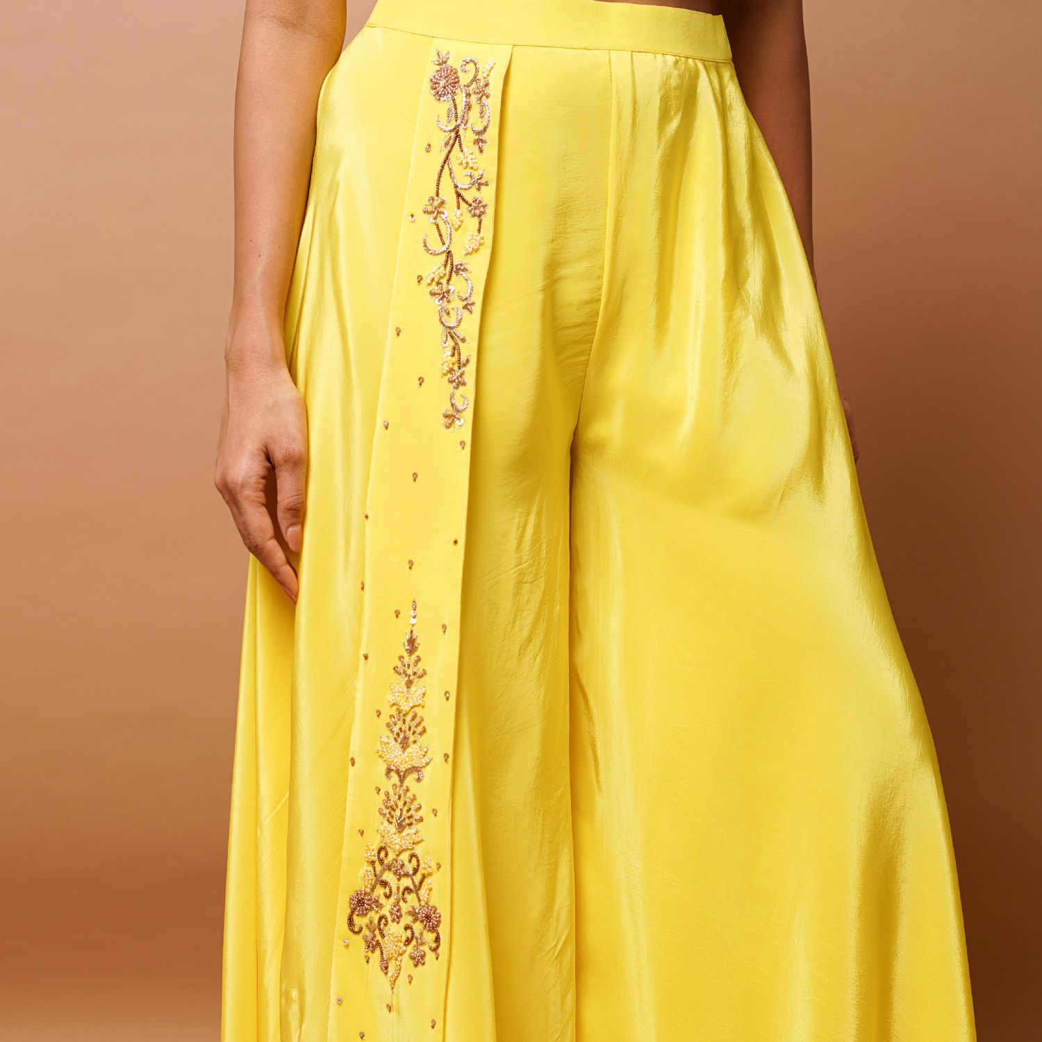 ₹ 20,995 (5% off)This beautiful set is made from crepe and is in a vibrant bright yellow shade. The one-shoulder kali pattern bustier is padded and adorned with handwork of zardozi, moti, sequins, thread and zari, adding opulence to the design. The high waist flared palazzo with attached kali features intricate embroidery, enhancing its overall elegance. Pair it with statement earrings and a cuff bracelet for weddings or festivities.