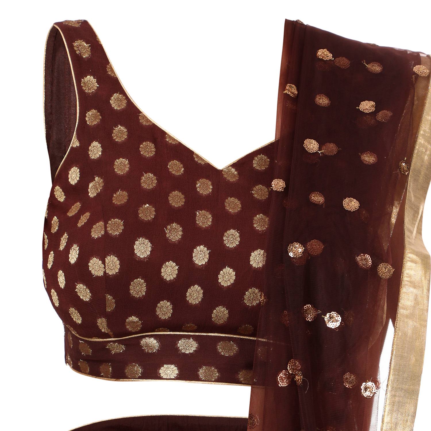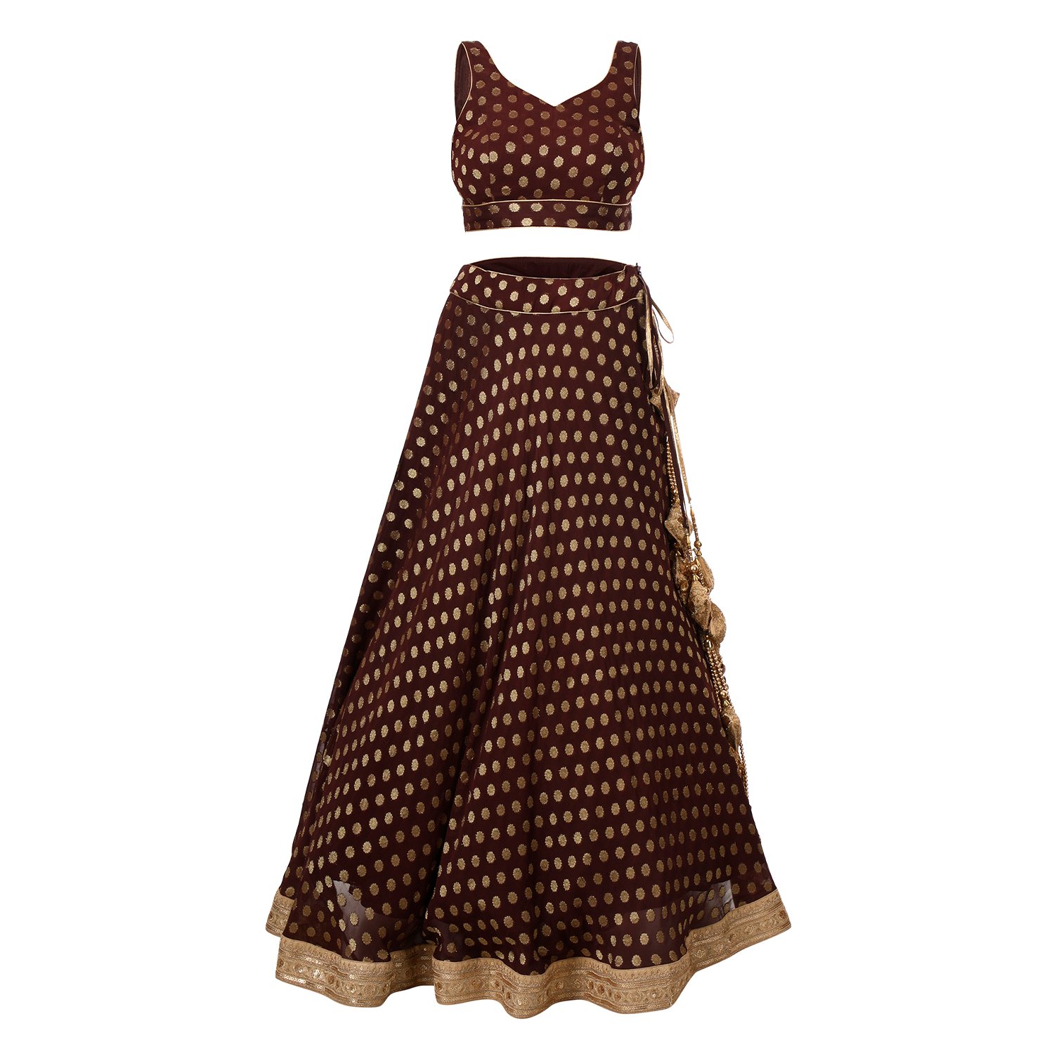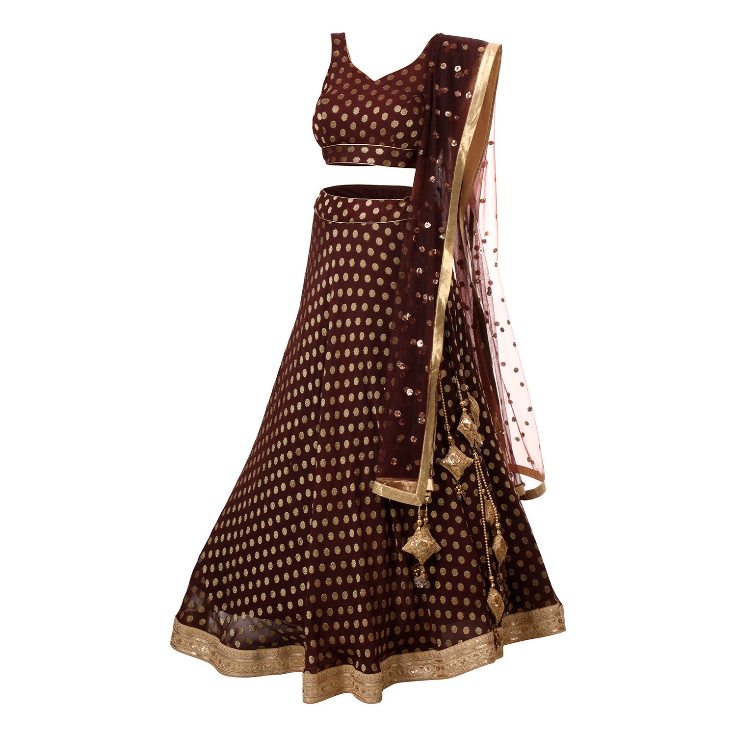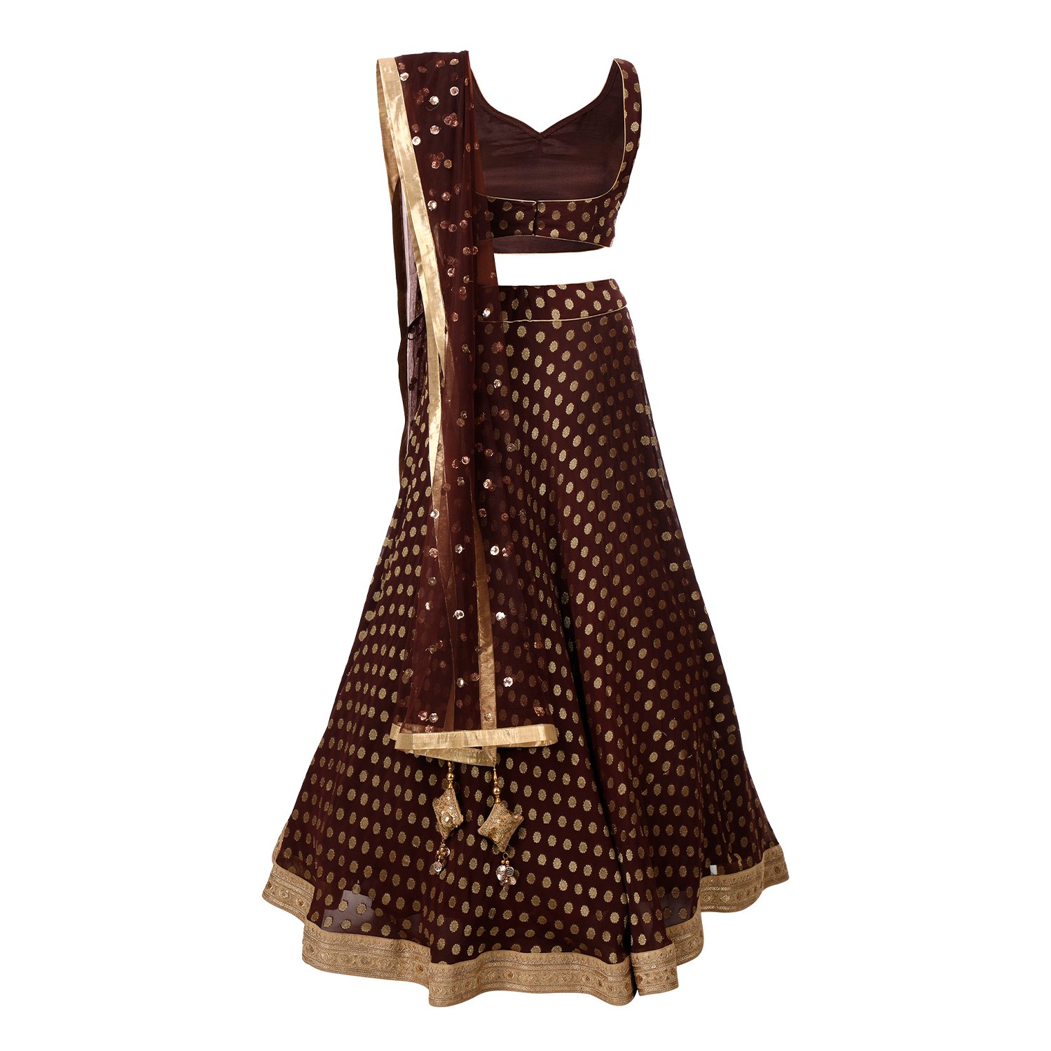 Featuring the cultural beauty of India, this beautiful brown georgette lehenga with all over banarasi butti is paired with an embroidered matching net dupatta and a matching blouse.