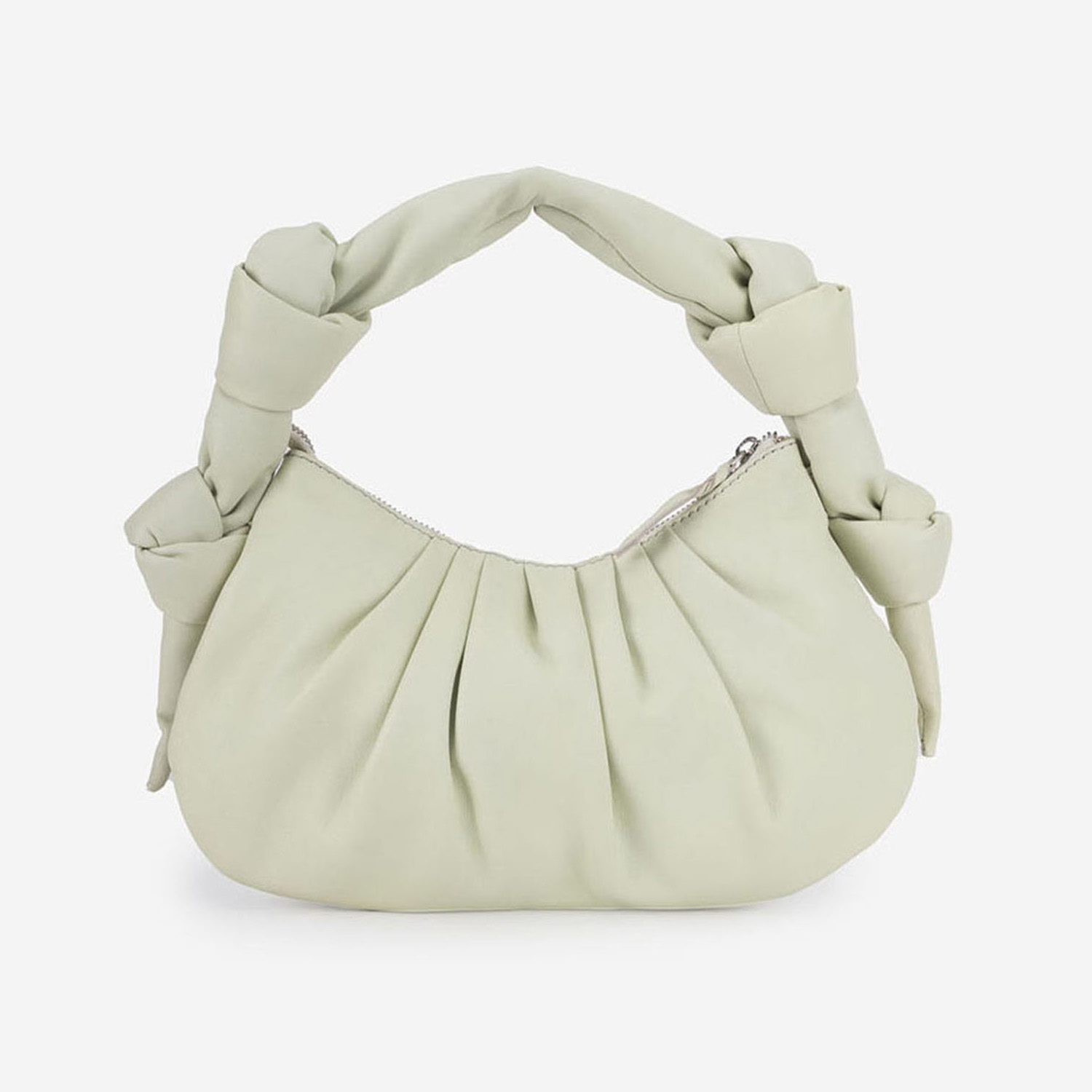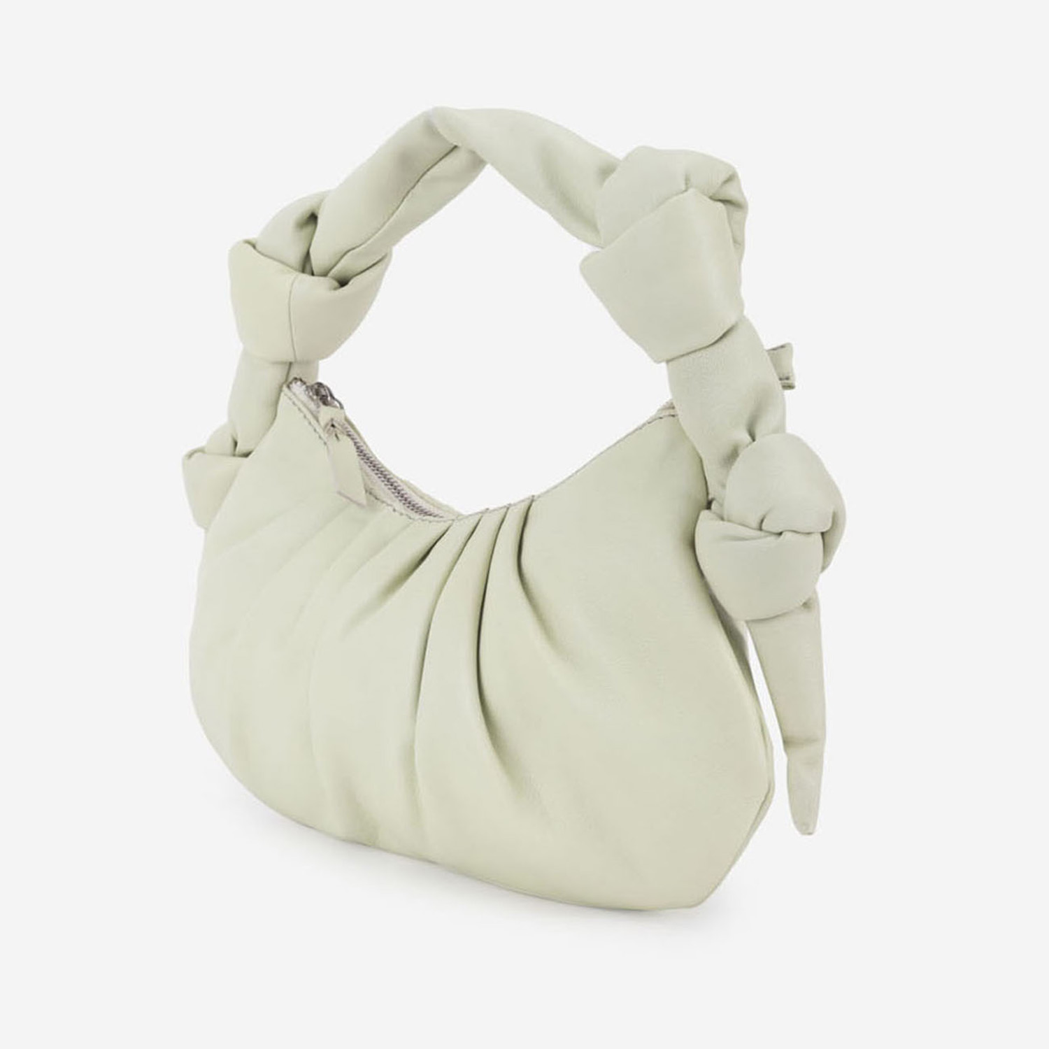 This leather hand bag features a soft beige color and a braided strap design. The zipper closure ensures the security of your belongings. Style it with a retro-style dress and classic pumps for a dressy day out.