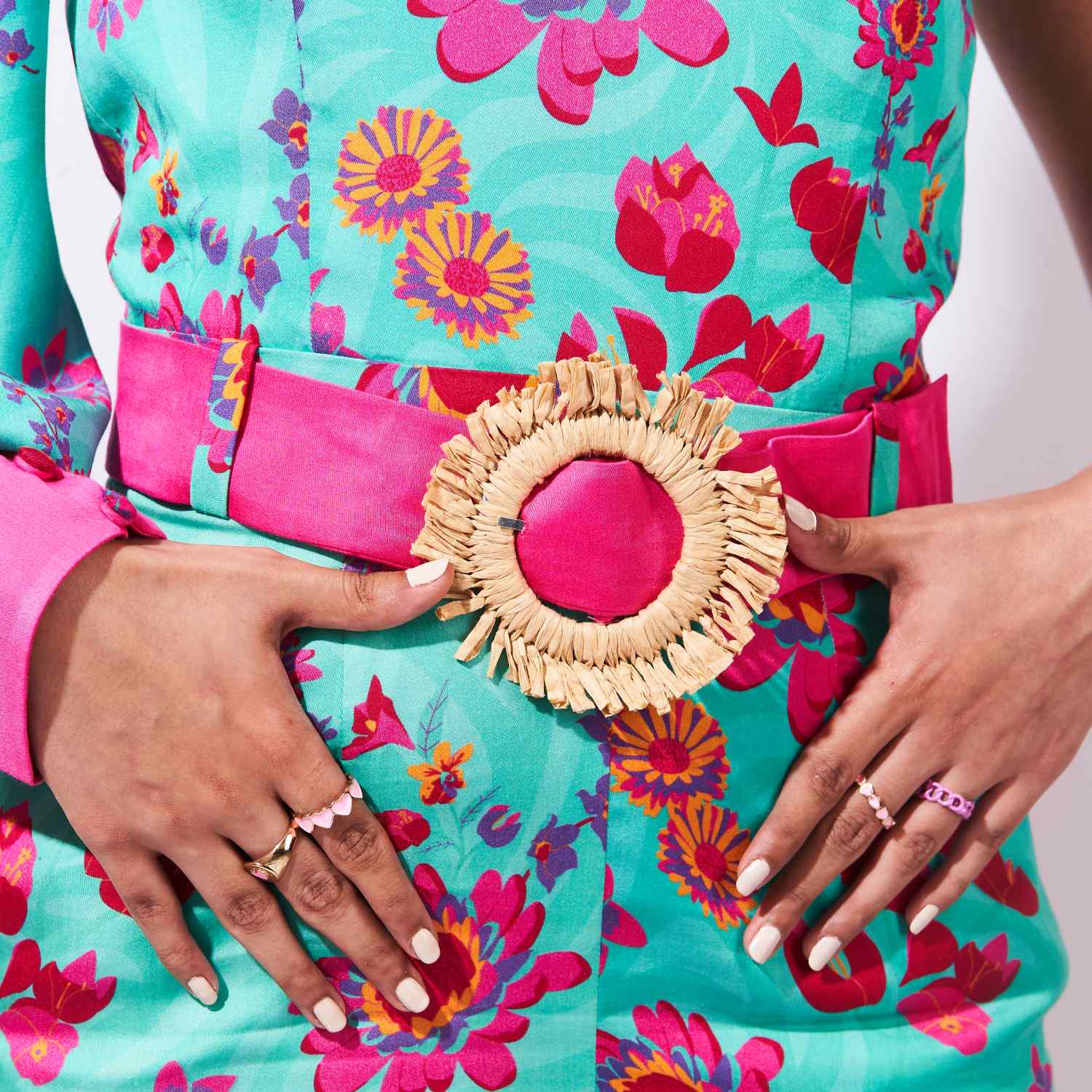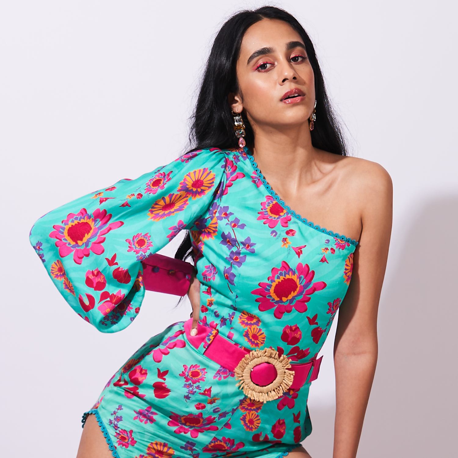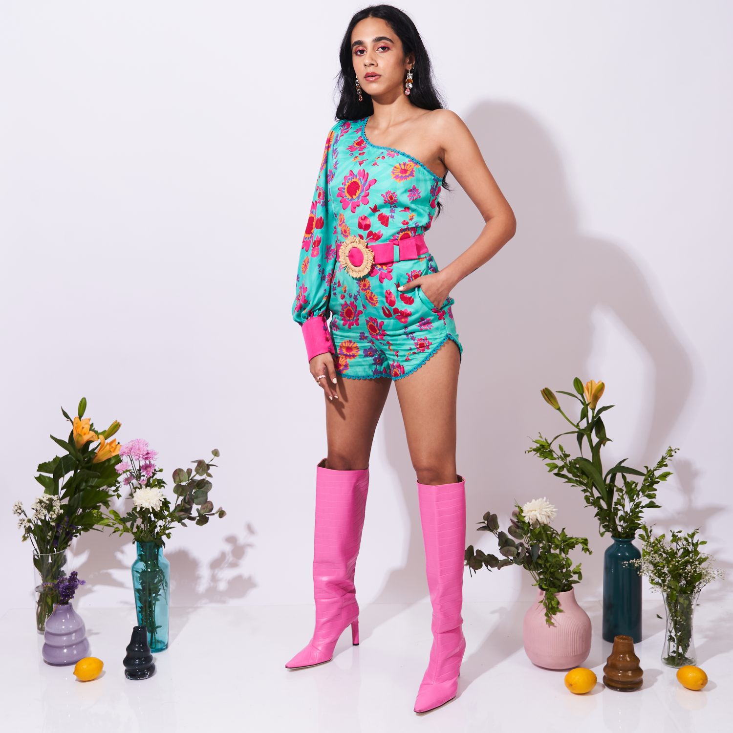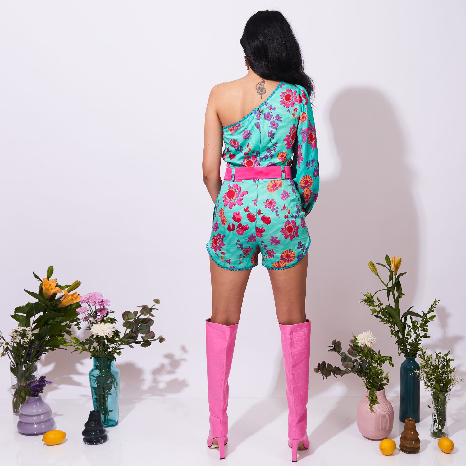 Adorn yourself in sophistication with this one shoulder jumpsuit featuring lace detailing, bishop sleeves with solid cuffs, and cloth buttons. The mini-length finished with lace detailing enhanced by a concealed zipper closure at the back. The jumpsuit boasts side pockets and a detachable belt with a handmade raffia buckle, all complemented by a captivating digitally printed design.