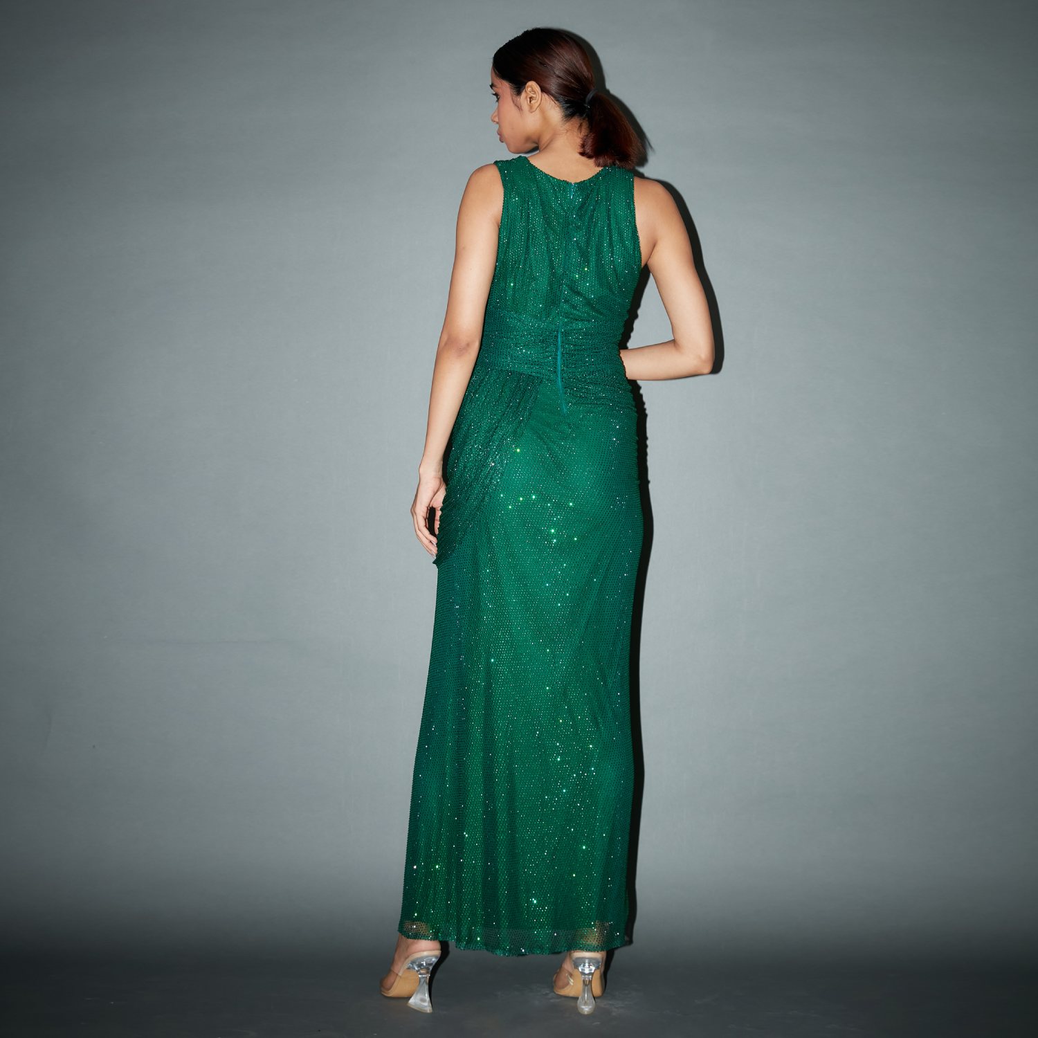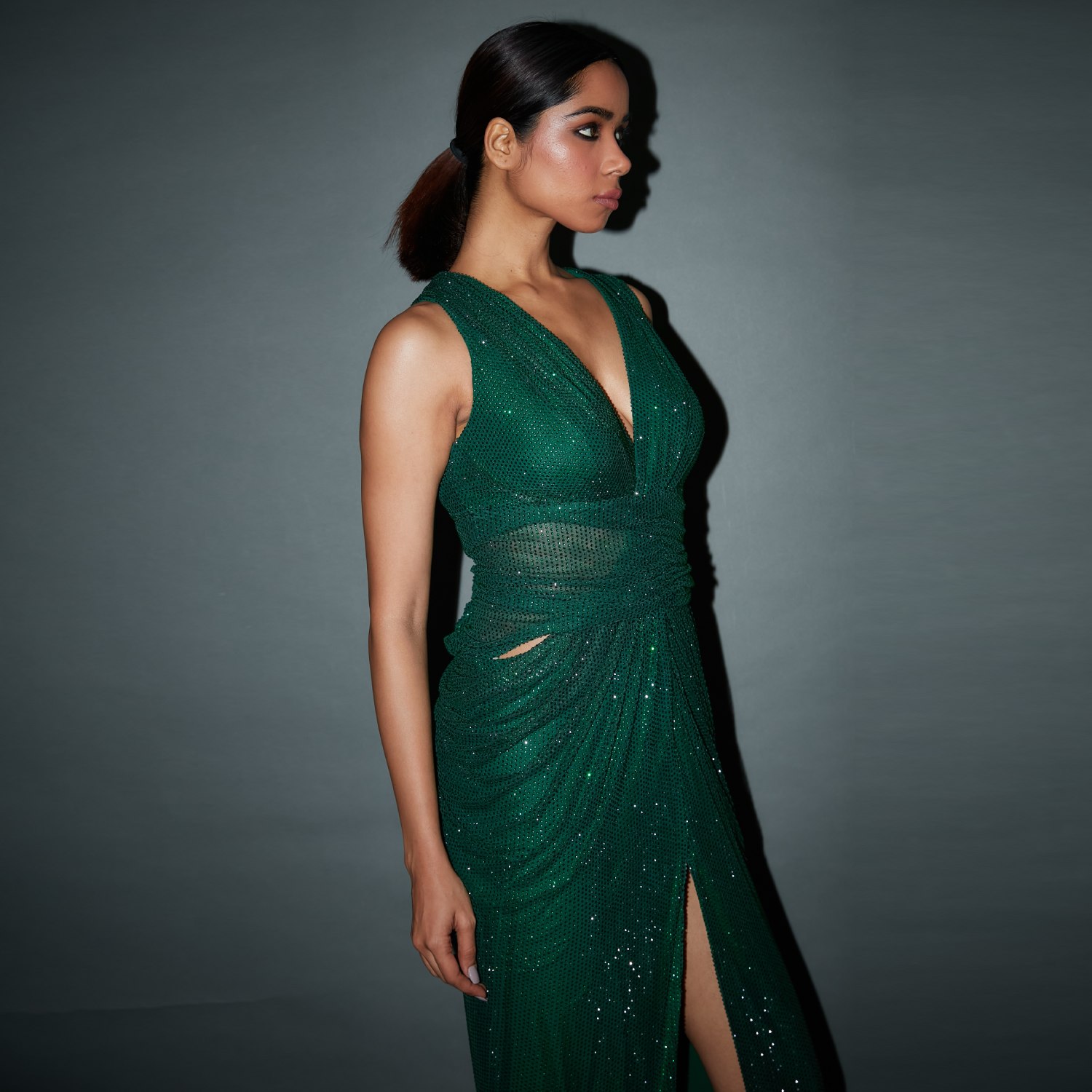 Radiating sophistication a bottle green crystal embellished drape gown captivates with its timeless charm. The cascading crystals adorn the gown adding opulence, while the chic slit introduces a modern allure. This ensemble is a harmonious blend of elegance and contemporary style, making it a captivating choice for any special occasion.