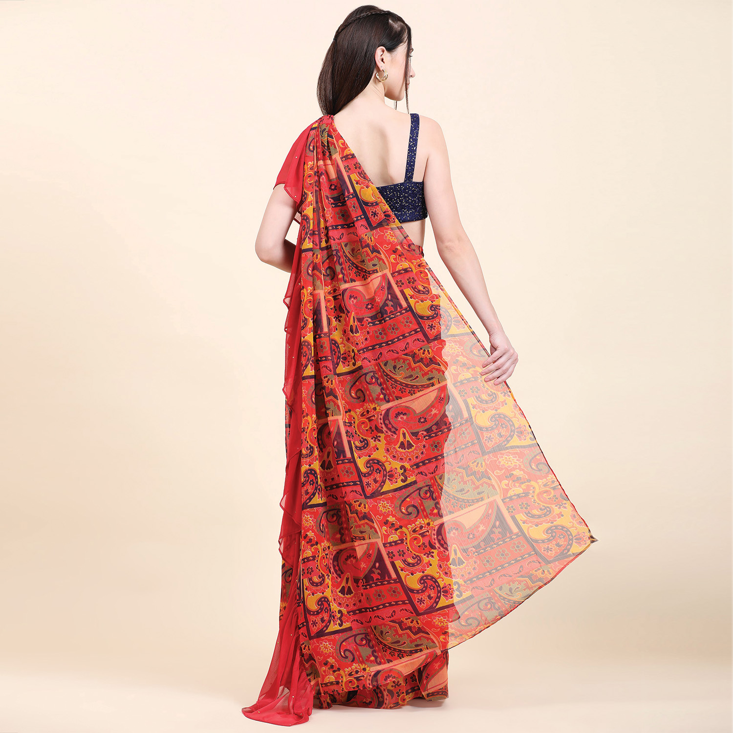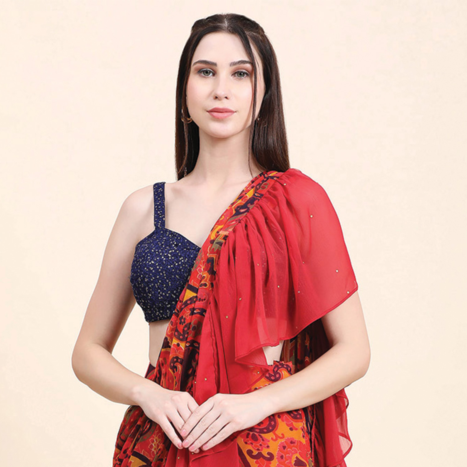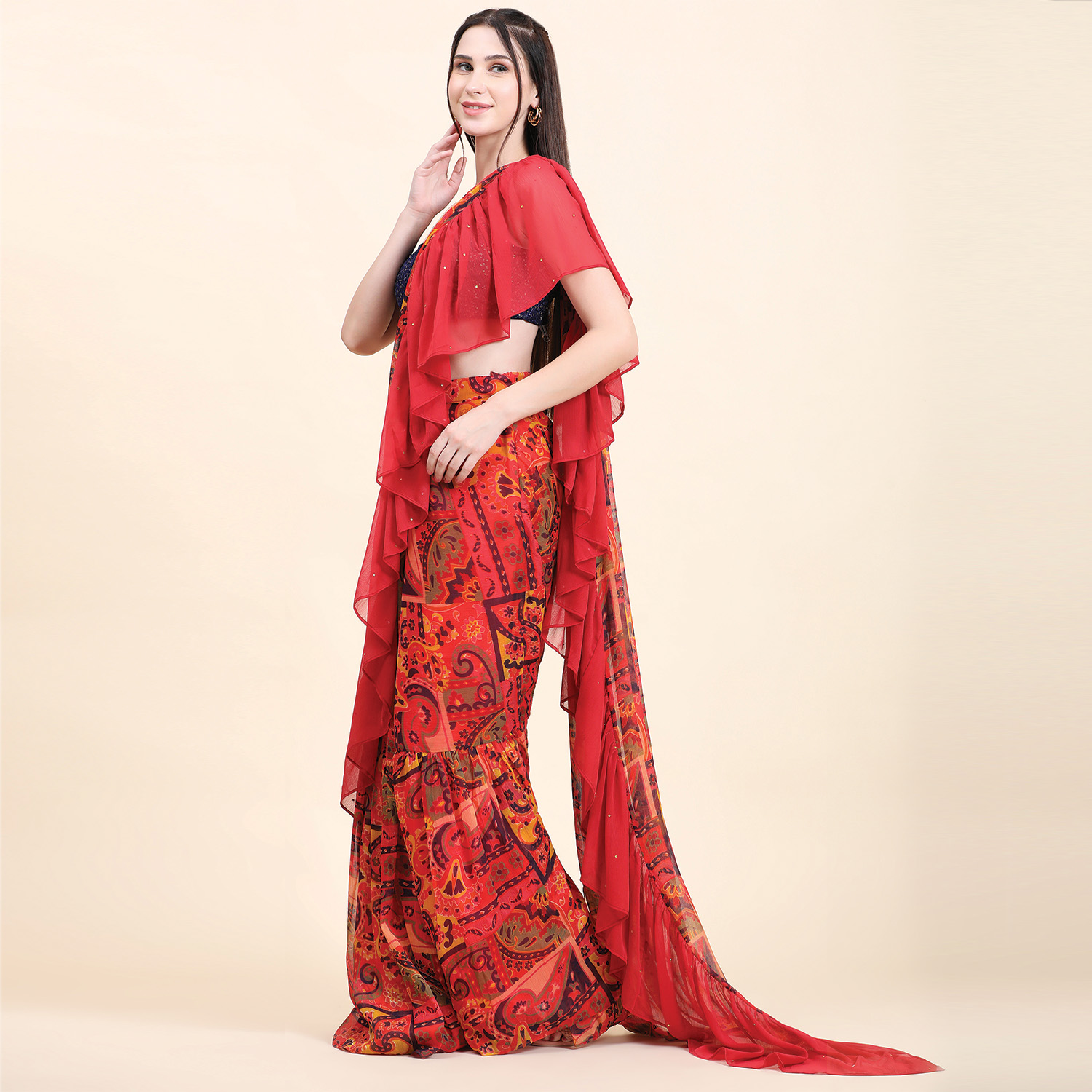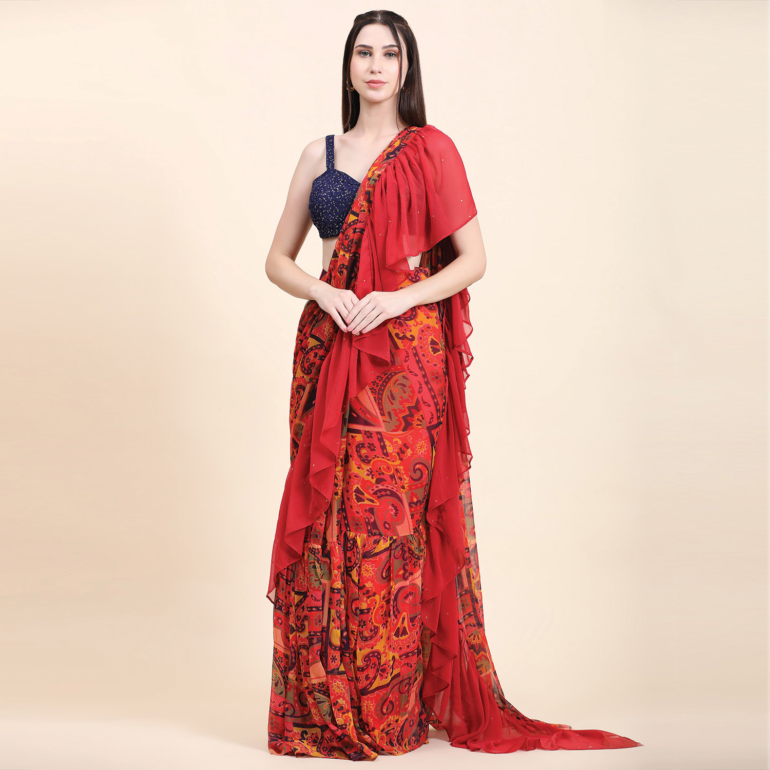 ₹ 15,000 (20% off)This gorgeous set includes a ruffle saree in a chiffon base with a ruffle pallu and a sequined blouse. The saree is designed to make a statement with its cherry red color and playful multicolor print. The sequined blouse adds glamour to the outfit, and it's finished with shantoon lining for comfort and structure. Style it with traditional jewellery and embellished heels for weddings or festivities.