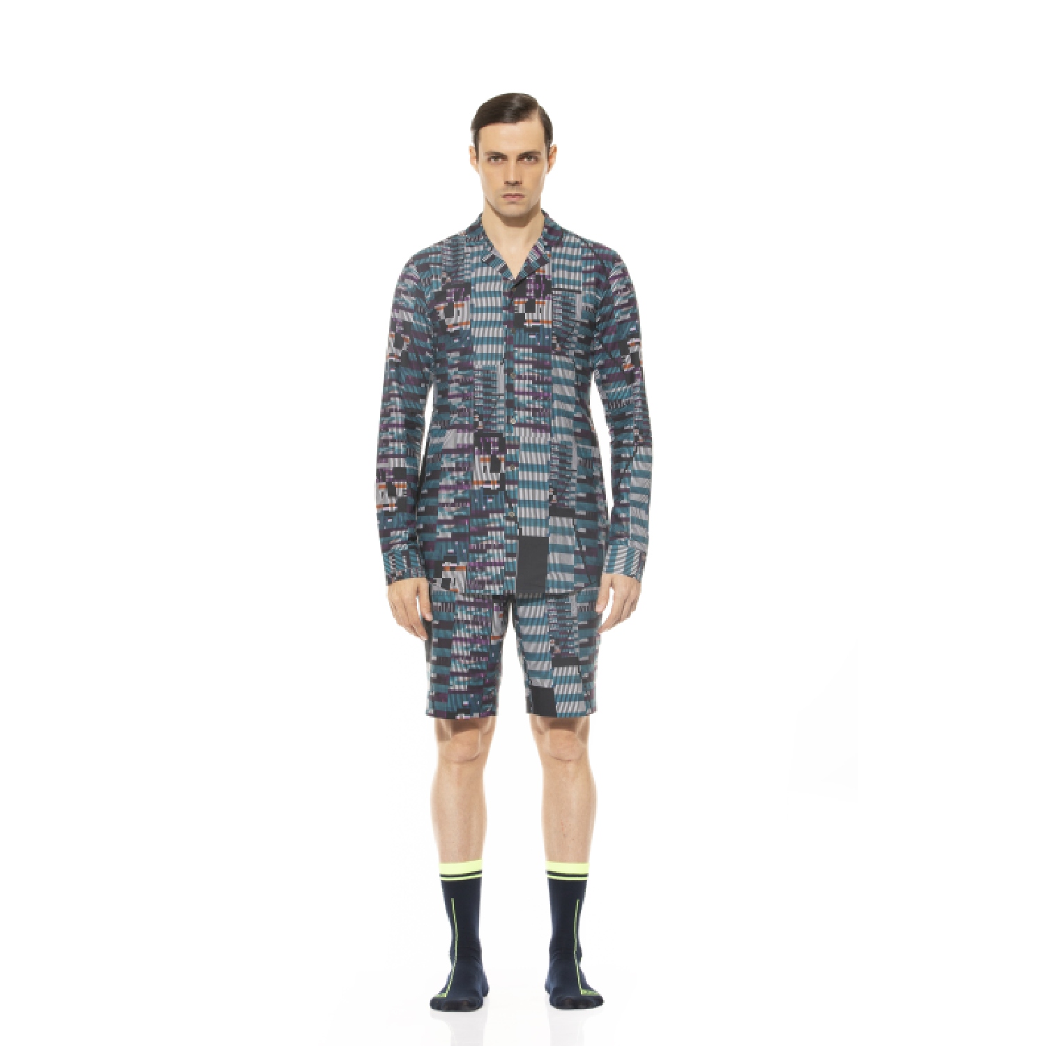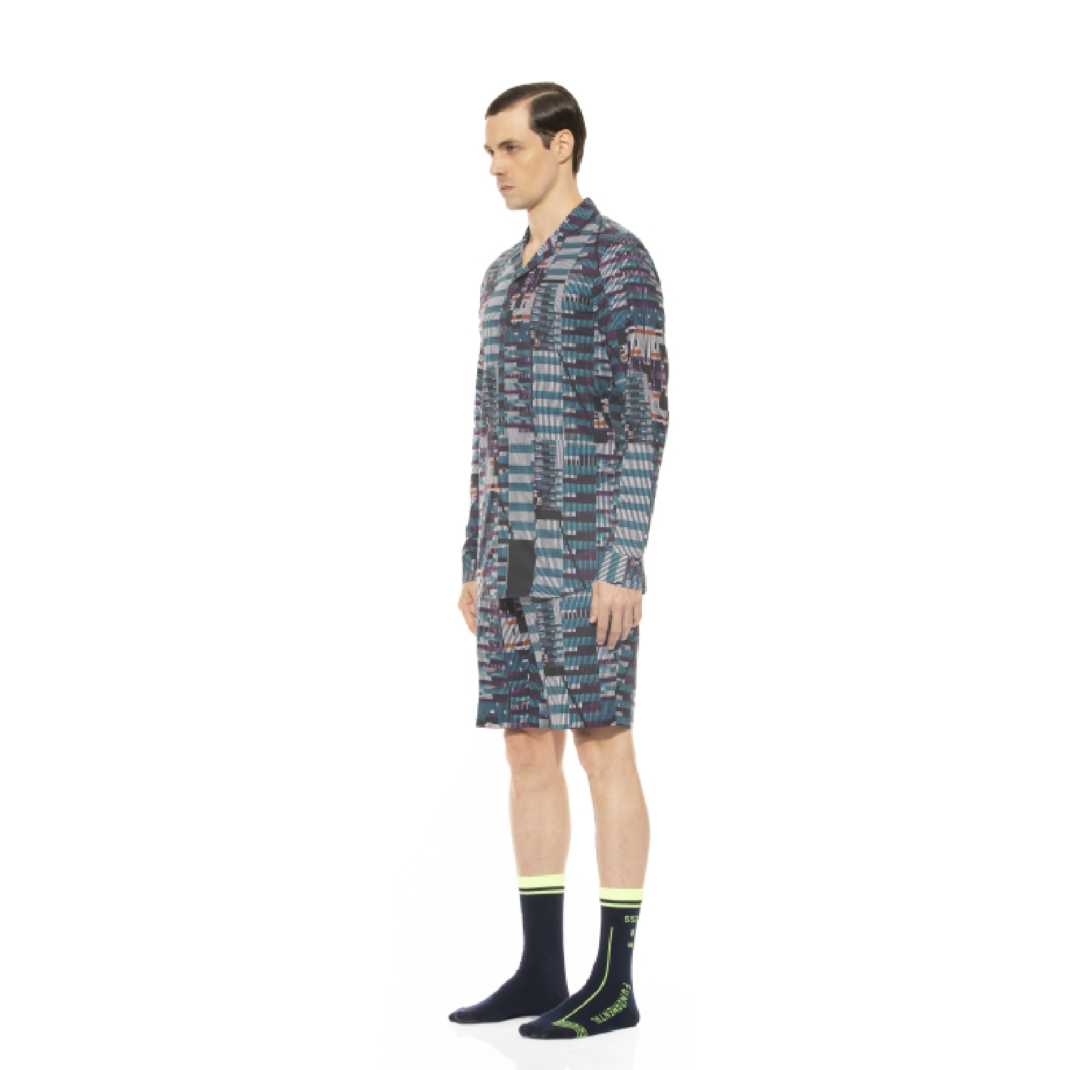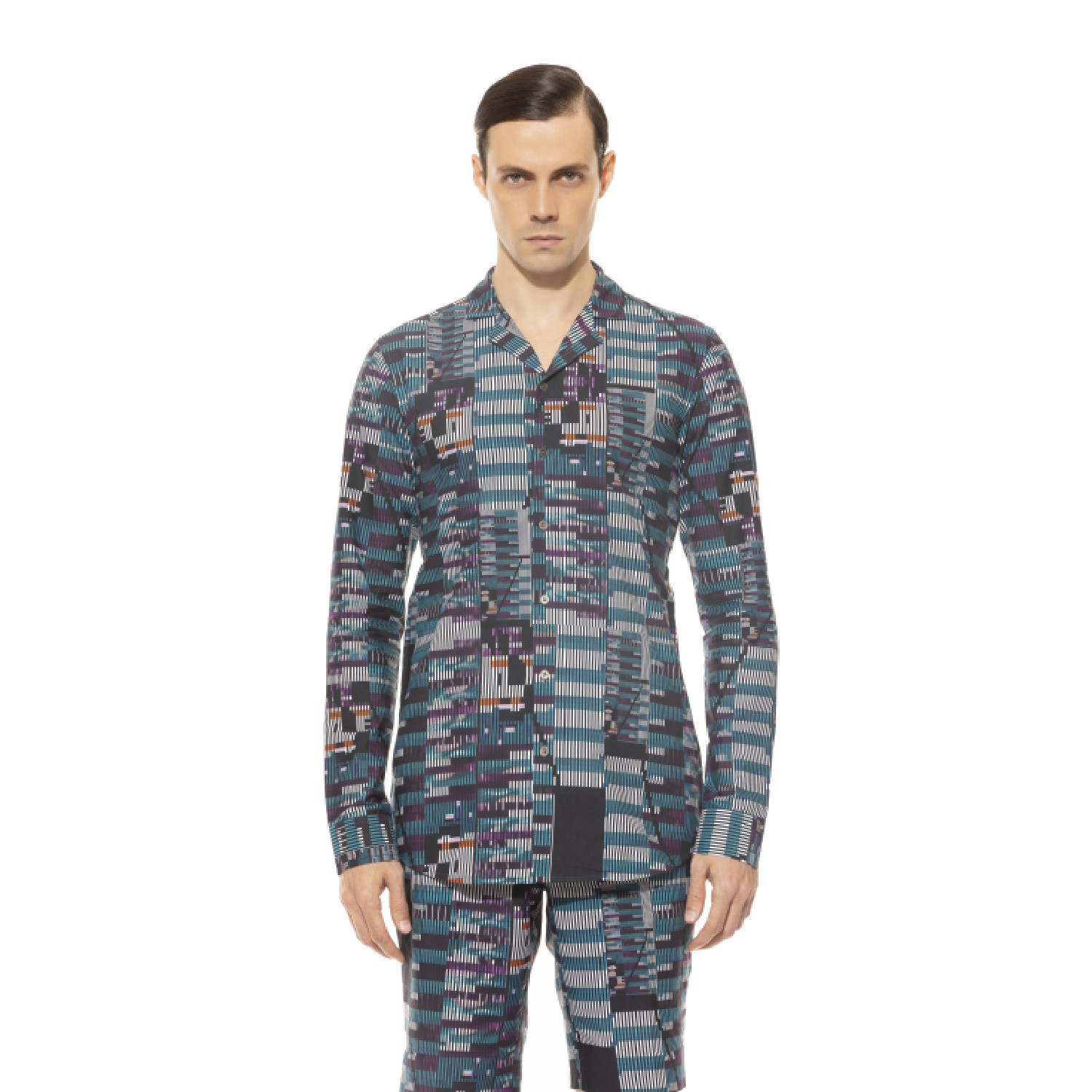 ₹ 8,500 (15% off)This shirt is crafted from lightweight cotton and tailored in a slim fit. It features a camp collar and a glitch effect that produces asymmetrical pattern grids and colors. Pair this shirt with dark denim pants and sneakers for a party.