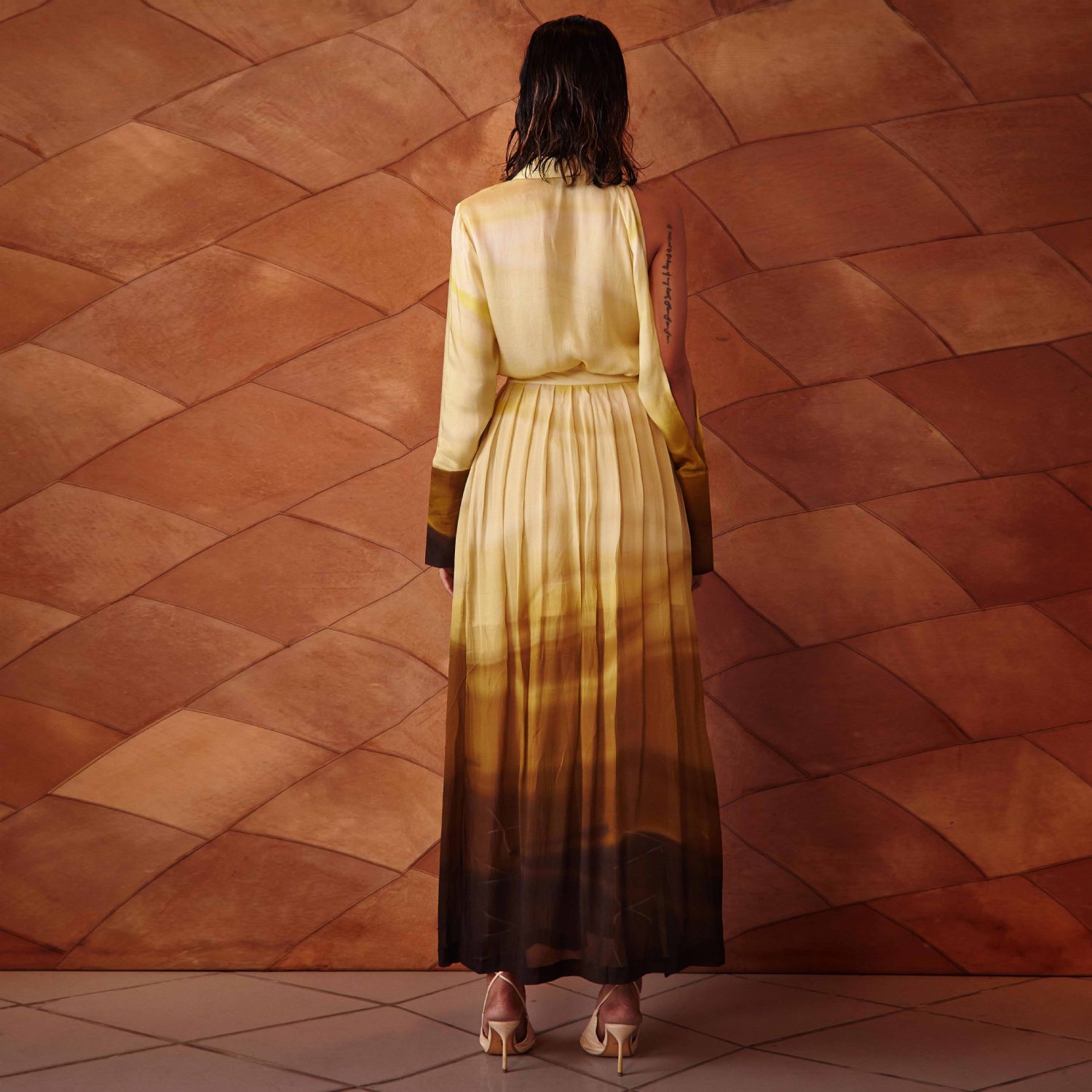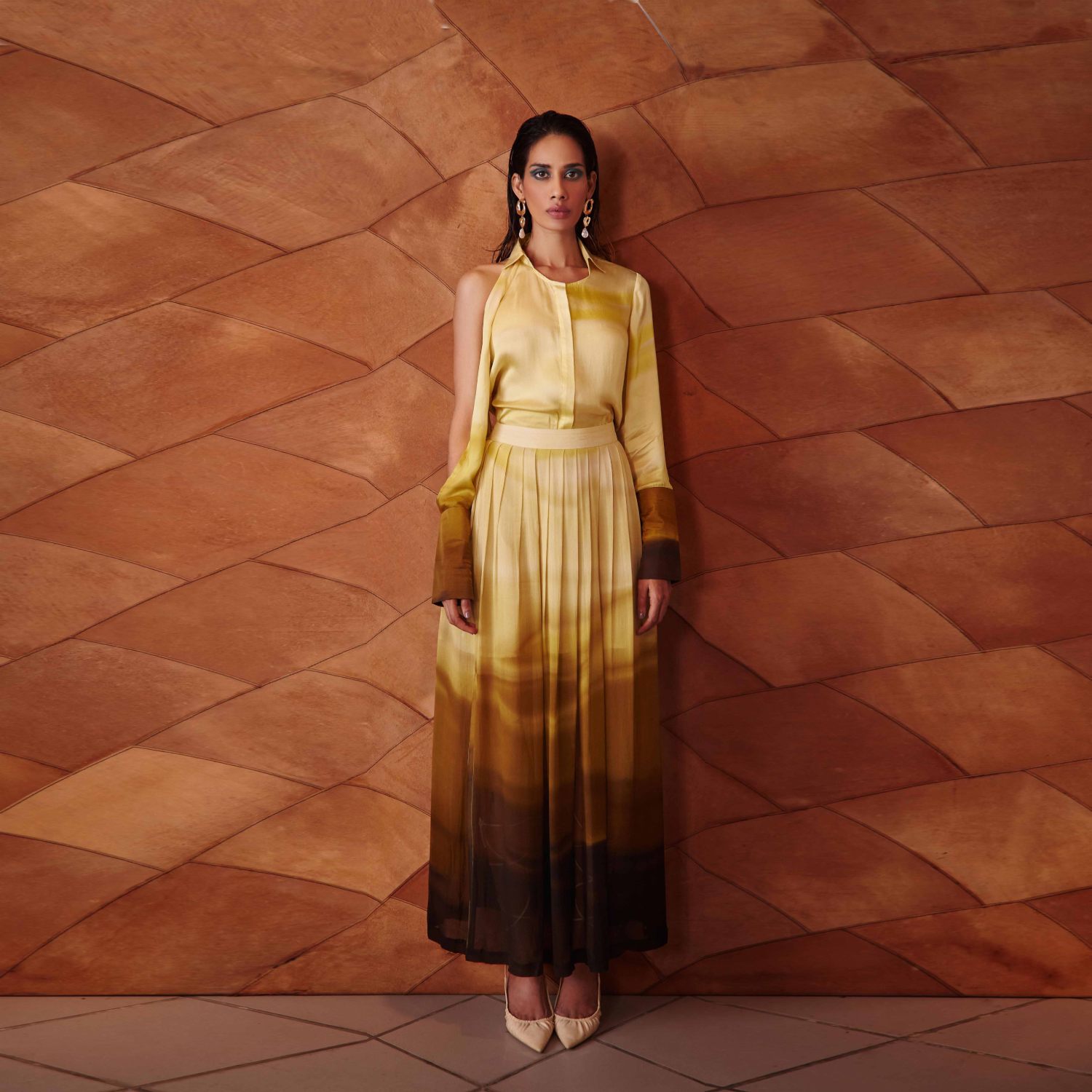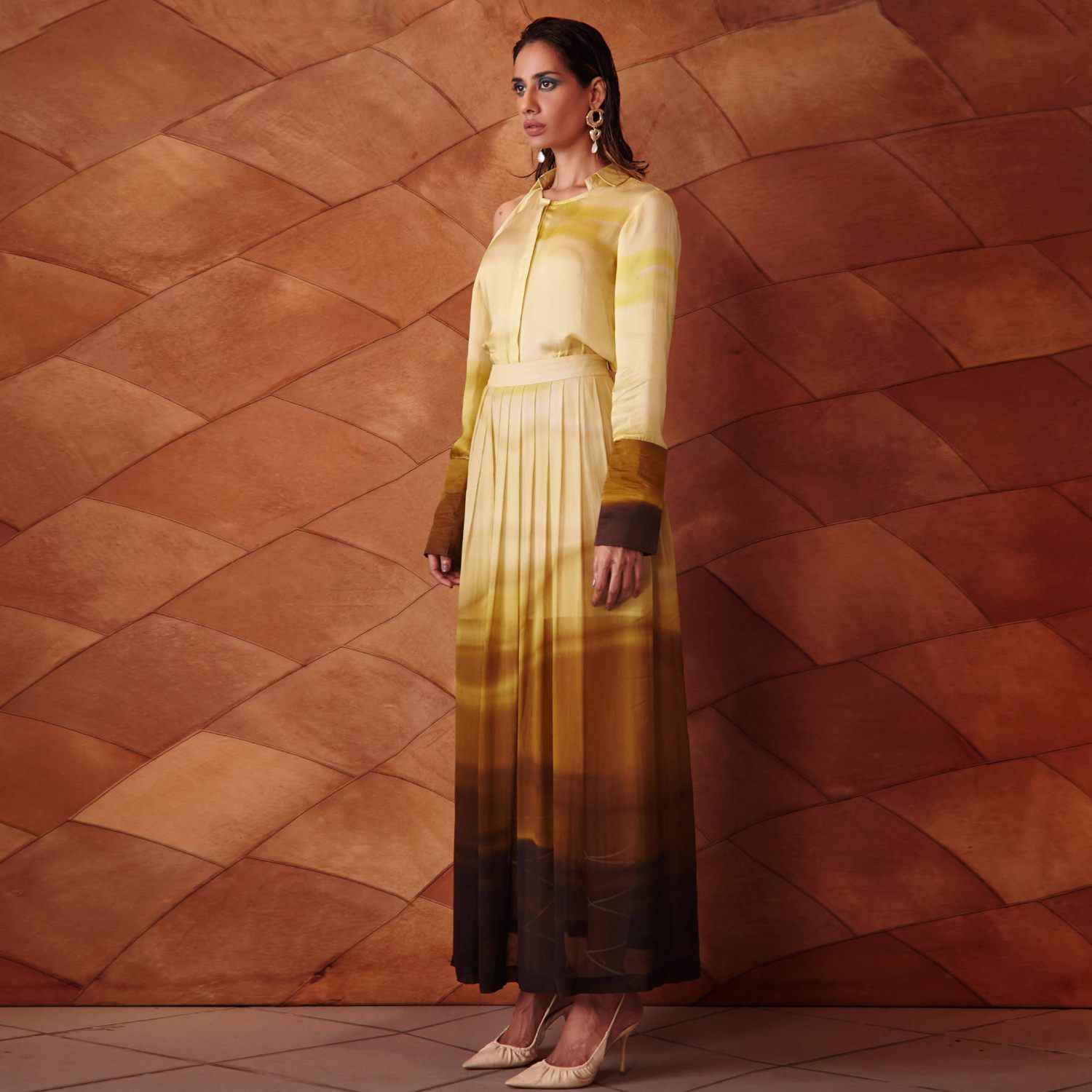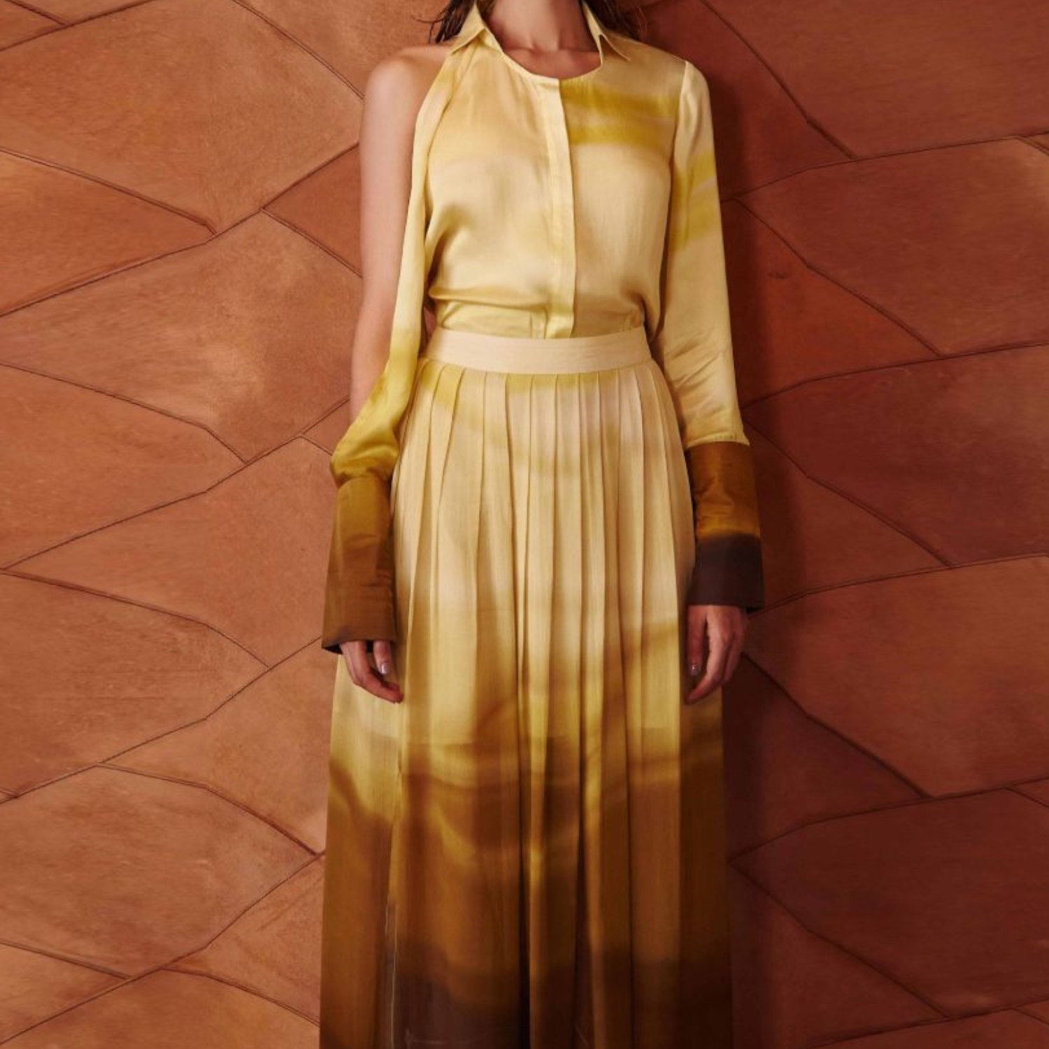 This beautiful shirt is crafted from high-quality rayon fabric and comes in a printed mustard shade. It features a single-sleeve slit, a round neck, a point collar, broad cuffs and concealed front buttons. Pair it with a high-waisted skirt and strappy heels for a dressy day event.